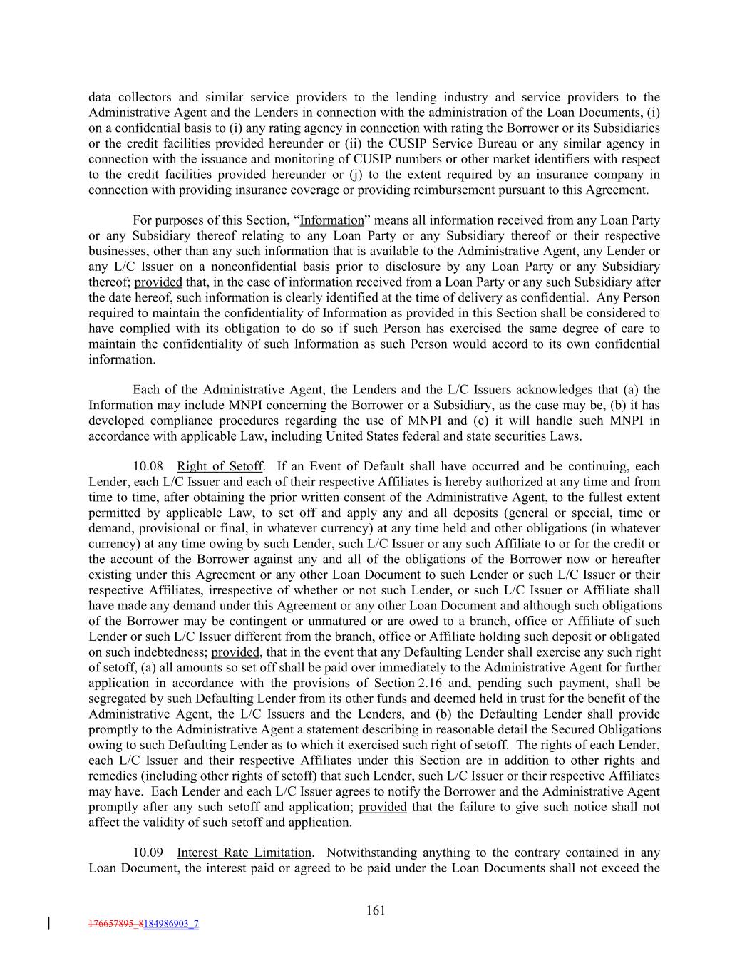 data collectors and similar service providers to the lending industry and service providers to the Administrative Agent and the Lenders in connection with the administration of the Loan Documents, (i) on a confidential basis to (i) any rating agency in connection with rating the Borrower or its Subsidiaries or the credit facilities provided hereunder or (ii) the CUSIP Service Bureau or any similar agency in connection with the issuance and monitoring of CUSIP numbers or other market identifiers with respect to the credit facilities provided hereunder or (j) to the extent required by an insurance company in connection with providing insurance coverage or providing reimbursement pursuant to this Agreement. For purposes of this Section, “Information” means all information received from any Loan Party or any Subsidiary thereof relating to any Loan Party or any Subsidiary thereof or their respective businesses, other than any such information that is available to the Administrative Agent, any Lender or any L/C Issuer on a nonconfidential basis prior to disclosure by any Loan Party or any Subsidiary thereof; provided that, in the case of information received from a Loan Party or any such Subsidiary after the date hereof, such information is clearly identified at the time of delivery as confidential. Any Person required to maintain the confidentiality of Information as provided in this Section shall be considered to have complied with its obligation to do so if such Person has exercised the same degree of care to maintain the confidentiality of such Information as such Person would accord to its own confidential information. Each of the Administrative Agent, the Lenders and the L/C Issuers acknowledges that (a) the Information may include MNPI concerning the Borrower or a Subsidiary, as the case may be, (b) it has developed compliance procedures regarding the use of MNPI and (c) it will handle such MNPI in accordance with applicable Law, including United States federal and state securities Laws. 10.08 Right of Setoff. If an Event of Default shall have occurred and be continuing, each Lender, each L/C Issuer and each of their respective Affiliates is hereby authorized at any time and from time to time, after obtaining the prior written consent of the Administrative Agent, to the fullest extent permitted by applicable Law, to set off and apply any and all deposits (general or special, time or demand, provisional or final, in whatever currency) at any time held and other obligations (in whatever currency) at any time owing by such Lender, such L/C Issuer or any such Affiliate to or for the credit or the account of the Borrower against any and all of the obligations of the Borrower now or hereafter existing under this Agreement or any other Loan Document to such Lender or such L/C Issuer or their respective Affiliates, irrespective of whether or not such Lender, or such L/C Issuer or Affiliate shall have made any demand under this Agreement or any other Loan Document and although such obligations of the Borrower may be contingent or unmatured or are owed to a branch, office or Affiliate of such Lender or such L/C Issuer different from the branch, office or Affiliate holding such deposit or obligated on such indebtedness; provided, that in the event that any Defaulting Lender shall exercise any such right of setoff, (a) all amounts so set off shall be paid over immediately to the Administrative Agent for further application in accordance with the provisions of Section 2.16 and, pending such payment, shall be segregated by such Defaulting Lender from its other funds and deemed held in trust for the benefit of the Administrative Agent, the L/C Issuers and the Lenders, and (b) the Defaulting Lender shall provide promptly to the Administrative Agent a statement describing in reasonable detail the Secured Obligations owing to such Defaulting Lender as to which it exercised such right of setoff. The rights of each Lender, each L/C Issuer and their respective Affiliates under this Section are in addition to other rights and remedies (including other rights of setoff) that such Lender, such L/C Issuer or their respective Affiliates may have. Each Lender and each L/C Issuer agrees to notify the Borrower and the Administrative Agent promptly after any such setoff and application; provided that the failure to give such notice shall not affect the validity of such setoff and application. 10.09 Interest Rate Limitation. Notwithstanding anything to the contrary contained in any Loan Document, the interest paid or agreed to be paid under the Loan Documents shall not exceed the 161 176657895_8184986903_7