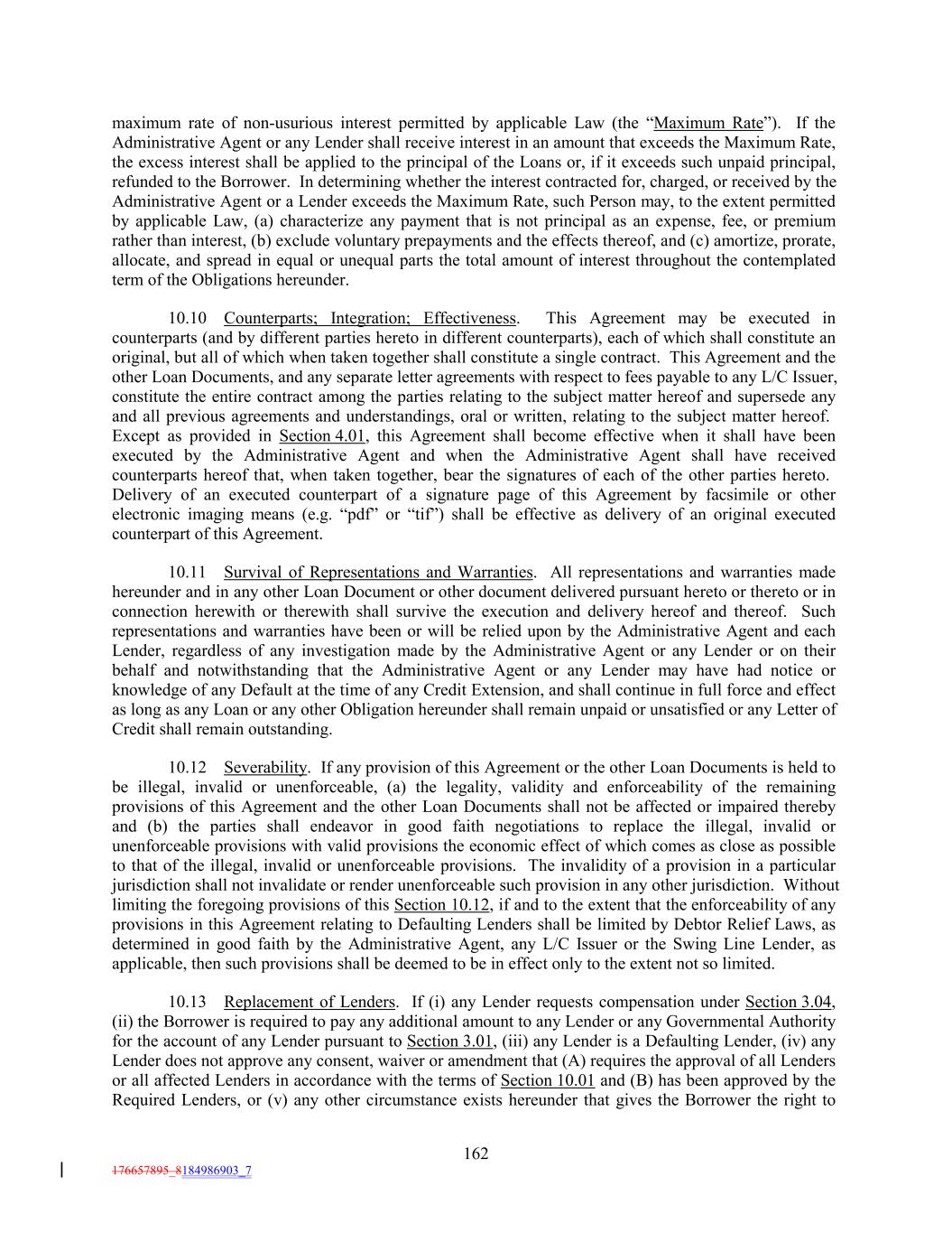maximum rate of non-usurious interest permitted by applicable Law (the “Maximum Rate”). If the Administrative Agent or any Lender shall receive interest in an amount that exceeds the Maximum Rate, the excess interest shall be applied to the principal of the Loans or, if it exceeds such unpaid principal, refunded to the Borrower. In determining whether the interest contracted for, charged, or received by the Administrative Agent or a Lender exceeds the Maximum Rate, such Person may, to the extent permitted by applicable Law, (a) characterize any payment that is not principal as an expense, fee, or premium rather than interest, (b) exclude voluntary prepayments and the effects thereof, and (c) amortize, prorate, allocate, and spread in equal or unequal parts the total amount of interest throughout the contemplated term of the Obligations hereunder. 10.10 Counterparts; Integration; Effectiveness. This Agreement may be executed in counterparts (and by different parties hereto in different counterparts), each of which shall constitute an original, but all of which when taken together shall constitute a single contract. This Agreement and the other Loan Documents, and any separate letter agreements with respect to fees payable to any L/C Issuer, constitute the entire contract among the parties relating to the subject matter hereof and supersede any and all previous agreements and understandings, oral or written, relating to the subject matter hereof. Except as provided in Section 4.01, this Agreement shall become effective when it shall have been executed by the Administrative Agent and when the Administrative Agent shall have received counterparts hereof that, when taken together, bear the signatures of each of the other parties hereto. Delivery of an executed counterpart of a signature page of this Agreement by facsimile or other electronic imaging means (e.g. “pdf” or “tif”) shall be effective as delivery of an original executed counterpart of this Agreement. 10.11 Survival of Representations and Warranties. All representations and warranties made hereunder and in any other Loan Document or other document delivered pursuant hereto or thereto or in connection herewith or therewith shall survive the execution and delivery hereof and thereof. Such representations and warranties have been or will be relied upon by the Administrative Agent and each Lender, regardless of any investigation made by the Administrative Agent or any Lender or on their behalf and notwithstanding that the Administrative Agent or any Lender may have had notice or knowledge of any Default at the time of any Credit Extension, and shall continue in full force and effect as long as any Loan or any other Obligation hereunder shall remain unpaid or unsatisfied or any Letter of Credit shall remain outstanding. 10.12 Severability. If any provision of this Agreement or the other Loan Documents is held to be illegal, invalid or unenforceable, (a) the legality, validity and enforceability of the remaining provisions of this Agreement and the other Loan Documents shall not be affected or impaired thereby and (b) the parties shall endeavor in good faith negotiations to replace the illegal, invalid or unenforceable provisions with valid provisions the economic effect of which comes as close as possible to that of the illegal, invalid or unenforceable provisions. The invalidity of a provision in a particular jurisdiction shall not invalidate or render unenforceable such provision in any other jurisdiction. Without limiting the foregoing provisions of this Section 10.12, if and to the extent that the enforceability of any provisions in this Agreement relating to Defaulting Lenders shall be limited by Debtor Relief Laws, as determined in good faith by the Administrative Agent, any L/C Issuer or the Swing Line Lender, as applicable, then such provisions shall be deemed to be in effect only to the extent not so limited. 10.13 Replacement of Lenders. If (i) any Lender requests compensation under Section 3.04, (ii) the Borrower is required to pay any additional amount to any Lender or any Governmental Authority for the account of any Lender pursuant to Section 3.01, (iii) any Lender is a Defaulting Lender, (iv) any Lender does not approve any consent, waiver or amendment that (A) requires the approval of all Lenders or all affected Lenders in accordance with the terms of Section 10.01 and (B) has been approved by the Required Lenders, or (v) any other circumstance exists hereunder that gives the Borrower the right to 162 176657895_8184986903_7