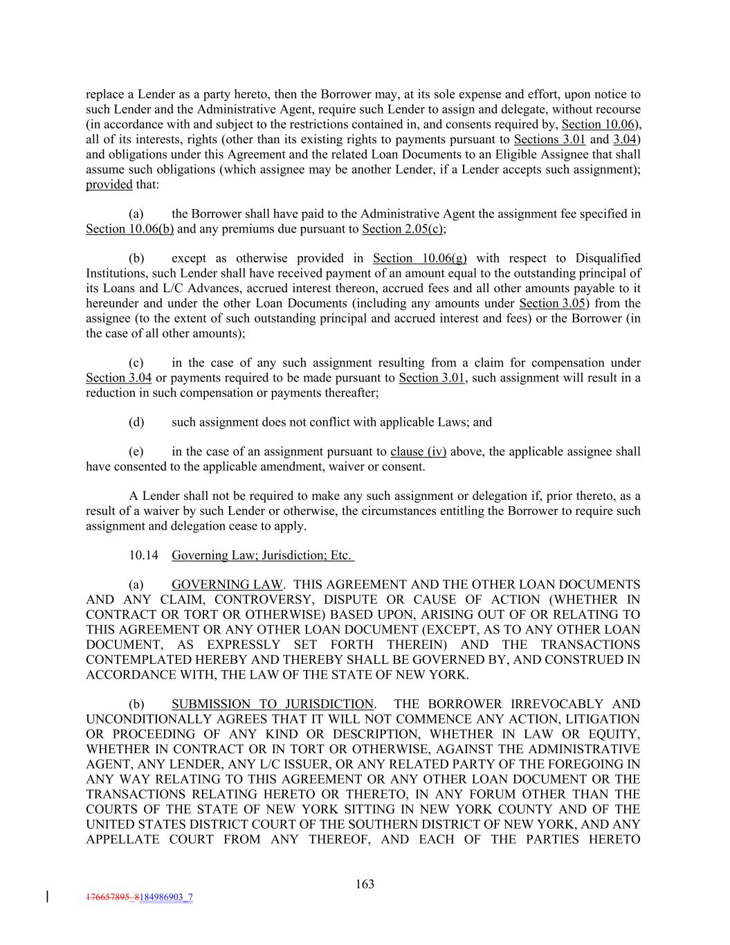 replace a Lender as a party hereto, then the Borrower may, at its sole expense and effort, upon notice to such Lender and the Administrative Agent, require such Lender to assign and delegate, without recourse (in accordance with and subject to the restrictions contained in, and consents required by, Section 10.06), all of its interests, rights (other than its existing rights to payments pursuant to Sections 3.01 and 3.04) and obligations under this Agreement and the related Loan Documents to an Eligible Assignee that shall assume such obligations (which assignee may be another Lender, if a Lender accepts such assignment); provided that: (a) the Borrower shall have paid to the Administrative Agent the assignment fee specified in Section 10.06(b) and any premiums due pursuant to Section 2.05(c); (b) except as otherwise provided in Section 10.06(g) with respect to Disqualified Institutions, such Lender shall have received payment of an amount equal to the outstanding principal of its Loans and L/C Advances, accrued interest thereon, accrued fees and all other amounts payable to it hereunder and under the other Loan Documents (including any amounts under Section 3.05) from the assignee (to the extent of such outstanding principal and accrued interest and fees) or the Borrower (in the case of all other amounts); (c) in the case of any such assignment resulting from a claim for compensation under Section 3.04 or payments required to be made pursuant to Section 3.01, such assignment will result in a reduction in such compensation or payments thereafter; (d) such assignment does not conflict with applicable Laws; and (e) in the case of an assignment pursuant to clause (iv) above, the applicable assignee shall have consented to the applicable amendment, waiver or consent. A Lender shall not be required to make any such assignment or delegation if, prior thereto, as a result of a waiver by such Lender or otherwise, the circumstances entitling the Borrower to require such assignment and delegation cease to apply. 10.14 Governing Law; Jurisdiction; Etc. (a) GOVERNING LAW. THIS AGREEMENT AND THE OTHER LOAN DOCUMENTS AND ANY CLAIM, CONTROVERSY, DISPUTE OR CAUSE OF ACTION (WHETHER IN CONTRACT OR TORT OR OTHERWISE) BASED UPON, ARISING OUT OF OR RELATING TO THIS AGREEMENT OR ANY OTHER LOAN DOCUMENT (EXCEPT, AS TO ANY OTHER LOAN DOCUMENT, AS EXPRESSLY SET FORTH THEREIN) AND THE TRANSACTIONS CONTEMPLATED HEREBY AND THEREBY SHALL BE GOVERNED BY, AND CONSTRUED IN ACCORDANCE WITH, THE LAW OF THE STATE OF NEW YORK. (b) SUBMISSION TO JURISDICTION. THE BORROWER IRREVOCABLY AND UNCONDITIONALLY AGREES THAT IT WILL NOT COMMENCE ANY ACTION, LITIGATION OR PROCEEDING OF ANY KIND OR DESCRIPTION, WHETHER IN LAW OR EQUITY, WHETHER IN CONTRACT OR IN TORT OR OTHERWISE, AGAINST THE ADMINISTRATIVE AGENT, ANY LENDER, ANY L/C ISSUER, OR ANY RELATED PARTY OF THE FOREGOING IN ANY WAY RELATING TO THIS AGREEMENT OR ANY OTHER LOAN DOCUMENT OR THE TRANSACTIONS RELATING HERETO OR THERETO, IN ANY FORUM OTHER THAN THE COURTS OF THE STATE OF NEW YORK SITTING IN NEW YORK COUNTY AND OF THE UNITED STATES DISTRICT COURT OF THE SOUTHERN DISTRICT OF NEW YORK, AND ANY APPELLATE COURT FROM ANY THEREOF, AND EACH OF THE PARTIES HERETO 163 176657895_8184986903_7