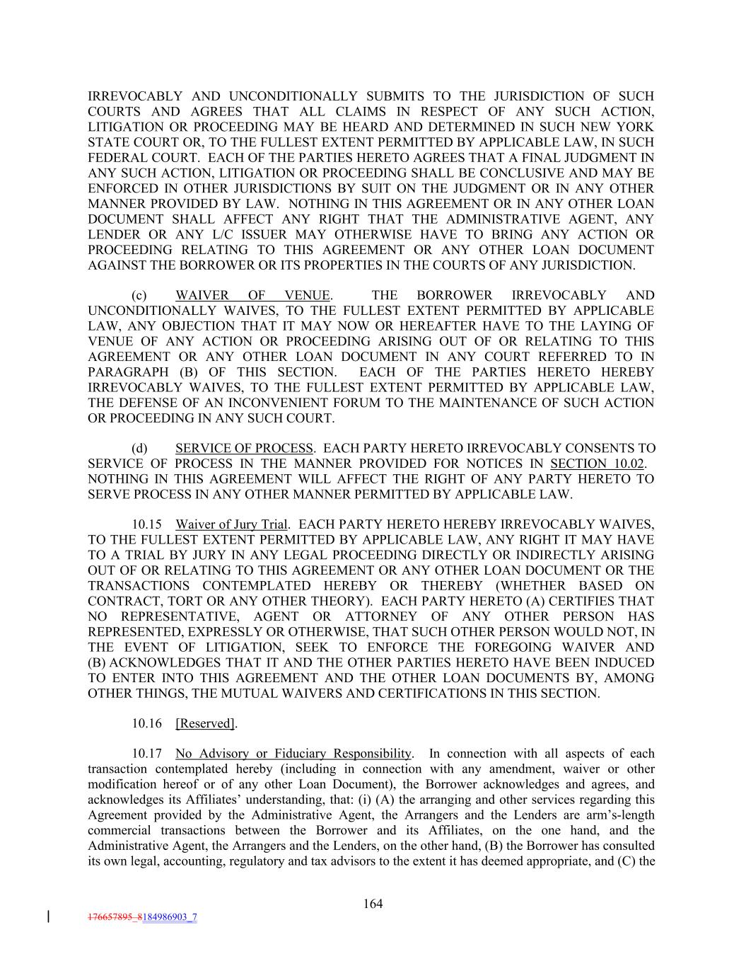 IRREVOCABLY AND UNCONDITIONALLY SUBMITS TO THE JURISDICTION OF SUCH COURTS AND AGREES THAT ALL CLAIMS IN RESPECT OF ANY SUCH ACTION, LITIGATION OR PROCEEDING MAY BE HEARD AND DETERMINED IN SUCH NEW YORK STATE COURT OR, TO THE FULLEST EXTENT PERMITTED BY APPLICABLE LAW, IN SUCH FEDERAL COURT. EACH OF THE PARTIES HERETO AGREES THAT A FINAL JUDGMENT IN ANY SUCH ACTION, LITIGATION OR PROCEEDING SHALL BE CONCLUSIVE AND MAY BE ENFORCED IN OTHER JURISDICTIONS BY SUIT ON THE JUDGMENT OR IN ANY OTHER MANNER PROVIDED BY LAW. NOTHING IN THIS AGREEMENT OR IN ANY OTHER LOAN DOCUMENT SHALL AFFECT ANY RIGHT THAT THE ADMINISTRATIVE AGENT, ANY LENDER OR ANY L/C ISSUER MAY OTHERWISE HAVE TO BRING ANY ACTION OR PROCEEDING RELATING TO THIS AGREEMENT OR ANY OTHER LOAN DOCUMENT AGAINST THE BORROWER OR ITS PROPERTIES IN THE COURTS OF ANY JURISDICTION. (c) WAIVER OF VENUE. THE BORROWER IRREVOCABLY AND UNCONDITIONALLY WAIVES, TO THE FULLEST EXTENT PERMITTED BY APPLICABLE LAW, ANY OBJECTION THAT IT MAY NOW OR HEREAFTER HAVE TO THE LAYING OF VENUE OF ANY ACTION OR PROCEEDING ARISING OUT OF OR RELATING TO THIS AGREEMENT OR ANY OTHER LOAN DOCUMENT IN ANY COURT REFERRED TO IN PARAGRAPH (B) OF THIS SECTION. EACH OF THE PARTIES HERETO HEREBY IRREVOCABLY WAIVES, TO THE FULLEST EXTENT PERMITTED BY APPLICABLE LAW, THE DEFENSE OF AN INCONVENIENT FORUM TO THE MAINTENANCE OF SUCH ACTION OR PROCEEDING IN ANY SUCH COURT. (d) SERVICE OF PROCESS. EACH PARTY HERETO IRREVOCABLY CONSENTS TO SERVICE OF PROCESS IN THE MANNER PROVIDED FOR NOTICES IN SECTION 10.02. NOTHING IN THIS AGREEMENT WILL AFFECT THE RIGHT OF ANY PARTY HERETO TO SERVE PROCESS IN ANY OTHER MANNER PERMITTED BY APPLICABLE LAW. 10.15 Waiver of Jury Trial. EACH PARTY HERETO HEREBY IRREVOCABLY WAIVES, TO THE FULLEST EXTENT PERMITTED BY APPLICABLE LAW, ANY RIGHT IT MAY HAVE TO A TRIAL BY JURY IN ANY LEGAL PROCEEDING DIRECTLY OR INDIRECTLY ARISING OUT OF OR RELATING TO THIS AGREEMENT OR ANY OTHER LOAN DOCUMENT OR THE TRANSACTIONS CONTEMPLATED HEREBY OR THEREBY (WHETHER BASED ON CONTRACT, TORT OR ANY OTHER THEORY). EACH PARTY HERETO (A) CERTIFIES THAT NO REPRESENTATIVE, AGENT OR ATTORNEY OF ANY OTHER PERSON HAS REPRESENTED, EXPRESSLY OR OTHERWISE, THAT SUCH OTHER PERSON WOULD NOT, IN THE EVENT OF LITIGATION, SEEK TO ENFORCE THE FOREGOING WAIVER AND (B) ACKNOWLEDGES THAT IT AND THE OTHER PARTIES HERETO HAVE BEEN INDUCED TO ENTER INTO THIS AGREEMENT AND THE OTHER LOAN DOCUMENTS BY, AMONG OTHER THINGS, THE MUTUAL WAIVERS AND CERTIFICATIONS IN THIS SECTION. 10.16 [Reserved]. 10.17 No Advisory or Fiduciary Responsibility. In connection with all aspects of each transaction contemplated hereby (including in connection with any amendment, waiver or other modification hereof or of any other Loan Document), the Borrower acknowledges and agrees, and acknowledges its Affiliates’ understanding, that: (i) (A) the arranging and other services regarding this Agreement provided by the Administrative Agent, the Arrangers and the Lenders are arm’s-length commercial transactions between the Borrower and its Affiliates, on the one hand, and the Administrative Agent, the Arrangers and the Lenders, on the other hand, (B) the Borrower has consulted its own legal, accounting, regulatory and tax advisors to the extent it has deemed appropriate, and (C) the 164 176657895_8184986903_7