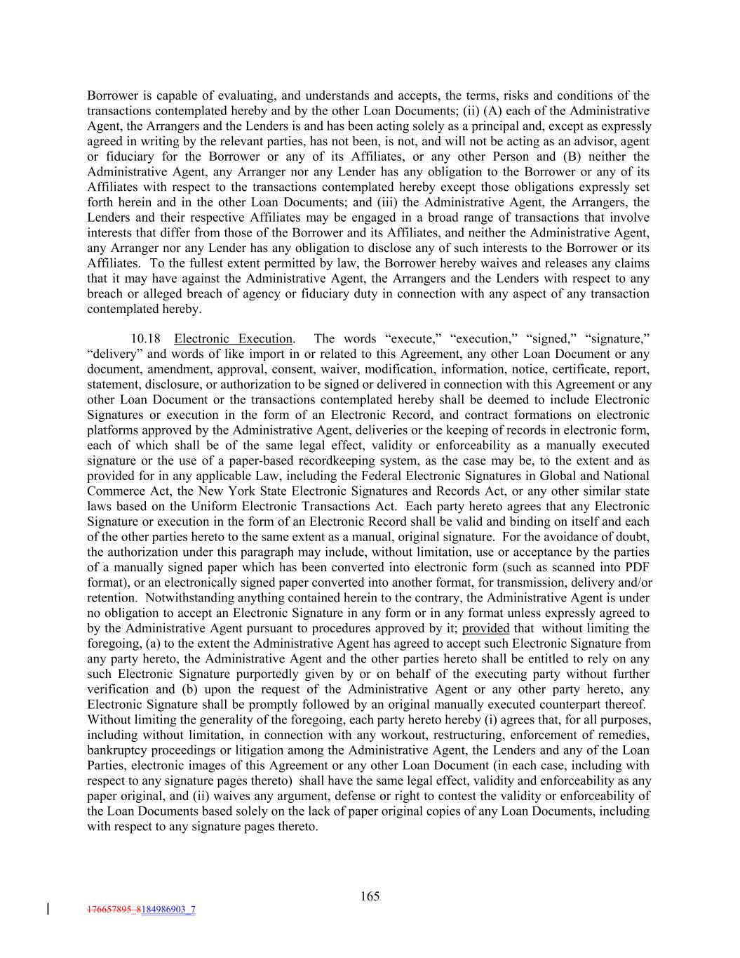 Borrower is capable of evaluating, and understands and accepts, the terms, risks and conditions of the transactions contemplated hereby and by the other Loan Documents; (ii) (A) each of the Administrative Agent, the Arrangers and the Lenders is and has been acting solely as a principal and, except as expressly agreed in writing by the relevant parties, has not been, is not, and will not be acting as an advisor, agent or fiduciary for the Borrower or any of its Affiliates, or any other Person and (B) neither the Administrative Agent, any Arranger nor any Lender has any obligation to the Borrower or any of its Affiliates with respect to the transactions contemplated hereby except those obligations expressly set forth herein and in the other Loan Documents; and (iii) the Administrative Agent, the Arrangers, the Lenders and their respective Affiliates may be engaged in a broad range of transactions that involve interests that differ from those of the Borrower and its Affiliates, and neither the Administrative Agent, any Arranger nor any Lender has any obligation to disclose any of such interests to the Borrower or its Affiliates. To the fullest extent permitted by law, the Borrower hereby waives and releases any claims that it may have against the Administrative Agent, the Arrangers and the Lenders with respect to any breach or alleged breach of agency or fiduciary duty in connection with any aspect of any transaction contemplated hereby. 10.18 Electronic Execution. The words “execute,” “execution,” “signed,” “signature,” “delivery” and words of like import in or related to this Agreement, any other Loan Document or any document, amendment, approval, consent, waiver, modification, information, notice, certificate, report, statement, disclosure, or authorization to be signed or delivered in connection with this Agreement or any other Loan Document or the transactions contemplated hereby shall be deemed to include Electronic Signatures or execution in the form of an Electronic Record, and contract formations on electronic platforms approved by the Administrative Agent, deliveries or the keeping of records in electronic form, each of which shall be of the same legal effect, validity or enforceability as a manually executed signature or the use of a paper-based recordkeeping system, as the case may be, to the extent and as provided for in any applicable Law, including the Federal Electronic Signatures in Global and National Commerce Act, the New York State Electronic Signatures and Records Act, or any other similar state laws based on the Uniform Electronic Transactions Act. Each party hereto agrees that any Electronic Signature or execution in the form of an Electronic Record shall be valid and binding on itself and each of the other parties hereto to the same extent as a manual, original signature. For the avoidance of doubt, the authorization under this paragraph may include, without limitation, use or acceptance by the parties of a manually signed paper which has been converted into electronic form (such as scanned into PDF format), or an electronically signed paper converted into another format, for transmission, delivery and/or retention. Notwithstanding anything contained herein to the contrary, the Administrative Agent is under no obligation to accept an Electronic Signature in any form or in any format unless expressly agreed to by the Administrative Agent pursuant to procedures approved by it; provided that without limiting the foregoing, (a) to the extent the Administrative Agent has agreed to accept such Electronic Signature from any party hereto, the Administrative Agent and the other parties hereto shall be entitled to rely on any such Electronic Signature purportedly given by or on behalf of the executing party without further verification and (b) upon the request of the Administrative Agent or any other party hereto, any Electronic Signature shall be promptly followed by an original manually executed counterpart thereof. Without limiting the generality of the foregoing, each party hereto hereby (i) agrees that, for all purposes, including without limitation, in connection with any workout, restructuring, enforcement of remedies, bankruptcy proceedings or litigation among the Administrative Agent, the Lenders and any of the Loan Parties, electronic images of this Agreement or any other Loan Document (in each case, including with respect to any signature pages thereto) shall have the same legal effect, validity and enforceability as any paper original, and (ii) waives any argument, defense or right to contest the validity or enforceability of the Loan Documents based solely on the lack of paper original copies of any Loan Documents, including with respect to any signature pages thereto. 165 176657895_8184986903_7