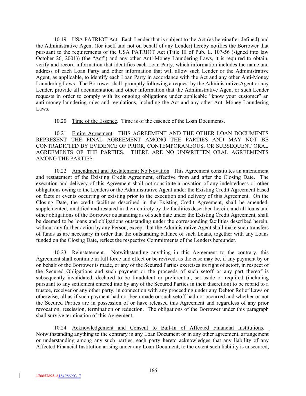 10.19 USA PATRIOT Act. Each Lender that is subject to the Act (as hereinafter defined) and the Administrative Agent (for itself and not on behalf of any Lender) hereby notifies the Borrower that pursuant to the requirements of the USA PATRIOT Act (Title III of Pub. L. 107-56 (signed into law October 26, 2001)) (the “Act”) and any other Anti-Money Laundering Laws, it is required to obtain, verify and record information that identifies each Loan Party, which information includes the name and address of each Loan Party and other information that will allow such Lender or the Administrative Agent, as applicable, to identify each Loan Party in accordance with the Act and any other Anti-Money Laundering Laws. The Borrower shall, promptly following a request by the Administrative Agent or any Lender, provide all documentation and other information that the Administrative Agent or such Lender requests in order to comply with its ongoing obligations under applicable “know your customer” an anti-money laundering rules and regulations, including the Act and any other Anti-Money Laundering Laws. 10.20 Time of the Essence. Time is of the essence of the Loan Documents. 10.21 Entire Agreement. THIS AGREEMENT AND THE OTHER LOAN DOCUMENTS REPRESENT THE FINAL AGREEMENT AMONG THE PARTIES AND MAY NOT BE CONTRADICTED BY EVIDENCE OF PRIOR, CONTEMPORANEOUS, OR SUBSEQUENT ORAL AGREEMENTS OF THE PARTIES. THERE ARE NO UNWRITTEN ORAL AGREEMENTS AMONG THE PARTIES. 10.22 Amendment and Restatement; No Novation. This Agreement constitutes an amendment and restatement of the Existing Credit Agreement, effective from and after the Closing Date. The execution and delivery of this Agreement shall not constitute a novation of any indebtedness or other obligations owing to the Lenders or the Administrative Agent under the Existing Credit Agreement based on facts or events occurring or existing prior to the execution and delivery of this Agreement. On the Closing Date, the credit facilities described in the Existing Credit Agreement, shall be amended, supplemented, modified and restated in their entirety by the facilities described herein, and all loans and other obligations of the Borrower outstanding as of such date under the Existing Credit Agreement, shall be deemed to be loans and obligations outstanding under the corresponding facilities described herein, without any further action by any Person, except that the Administrative Agent shall make such transfers of funds as are necessary in order that the outstanding balance of such Loans, together with any Loans funded on the Closing Date, reflect the respective Commitments of the Lenders hereunder. 10.23 Reinstatement. Notwithstanding anything in this Agreement to the contrary, this Agreement shall continue in full force and effect or be revived, as the case may be, if any payment by or on behalf of the Borrower is made, or any of the Secured Parties exercises its right of setoff, in respect of the Secured Obligations and such payment or the proceeds of such setoff or any part thereof is subsequently invalidated, declared to be fraudulent or preferential, set aside or required (including pursuant to any settlement entered into by any of the Secured Parties in their discretion) to be repaid to a trustee, receiver or any other party, in connection with any proceeding under any Debtor Relief Laws or otherwise, all as if such payment had not been made or such setoff had not occurred and whether or not the Secured Parties are in possession of or have released this Agreement and regardless of any prior revocation, rescission, termination or reduction. The obligations of the Borrower under this paragraph shall survive termination of this Agreement. 10.24 Acknowledgement and Consent to Bail-In of Affected Financial Institutions. Notwithstanding anything to the contrary in any Loan Document or in any other agreement, arrangement or understanding among any such parties, each party hereto acknowledges that any liability of any Affected Financial Institution arising under any Loan Document, to the extent such liability is unsecured, 166 176657895_8184986903_7