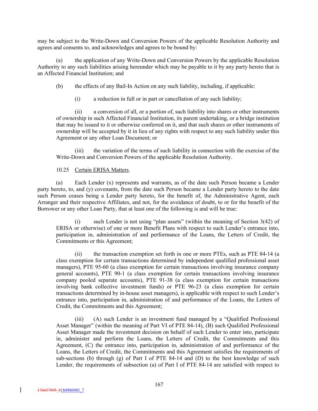 may be subject to the Write-Down and Conversion Powers of the applicable Resolution Authority and agrees and consents to, and acknowledges and agrees to be bound by: (a) the application of any Write-Down and Conversion Powers by the applicable Resolution Authority to any such liabilities arising hereunder which may be payable to it by any party hereto that is an Affected Financial Institution; and (b) the effects of any Bail-In Action on any such liability, including, if applicable: (i) a reduction in full or in part or cancellation of any such liability; (ii) a conversion of all, or a portion of, such liability into shares or other instruments of ownership in such Affected Financial Institution, its parent undertaking, or a bridge institution that may be issued to it or otherwise conferred on it, and that such shares or other instruments of ownership will be accepted by it in lieu of any rights with respect to any such liability under this Agreement or any other Loan Document; or (iii) the variation of the terms of such liability in connection with the exercise of the Write-Down and Conversion Powers of the applicable Resolution Authority. 10.25 Certain ERISA Matters. (a) Each Lender (x) represents and warrants, as of the date such Person became a Lender party hereto, to, and (y) covenants, from the date such Person became a Lender party hereto to the date such Person ceases being a Lender party hereto, for the benefit of, the Administrative Agent, each Arranger and their respective Affiliates, and not, for the avoidance of doubt, to or for the benefit of the Borrower or any other Loan Party, that at least one of the following is and will be true: (i) such Lender is not using “plan assets” (within the meaning of Section 3(42) of ERISA or otherwise) of one or more Benefit Plans with respect to such Lender’s entrance into, participation in, administration of and performance of the Loans, the Letters of Credit, the Commitments or this Agreement; (ii) the transaction exemption set forth in one or more PTEs, such as PTE 84-14 (a class exemption for certain transactions determined by independent qualified professional asset managers), PTE 95-60 (a class exemption for certain transactions involving insurance company general accounts), PTE 90-1 (a class exemption for certain transactions involving insurance company pooled separate accounts), PTE 91-38 (a class exemption for certain transactions involving bank collective investment funds) or PTE 96-23 (a class exemption for certain transactions determined by in-house asset managers), is applicable with respect to such Lender’s entrance into, participation in, administration of and performance of the Loans, the Letters of Credit, the Commitments and this Agreement; (iii) (A) such Lender is an investment fund managed by a “Qualified Professional Asset Manager” (within the meaning of Part VI of PTE 84-14), (B) such Qualified Professional Asset Manager made the investment decision on behalf of such Lender to enter into, participate in, administer and perform the Loans, the Letters of Credit, the Commitments and this Agreement, (C) the entrance into, participation in, administration of and performance of the Loans, the Letters of Credit, the Commitments and this Agreement satisfies the requirements of sub-sections (b) through (g) of Part I of PTE 84-14 and (D) to the best knowledge of such Lender, the requirements of subsection (a) of Part I of PTE 84-14 are satisfied with respect to 167 176657895_8184986903_7