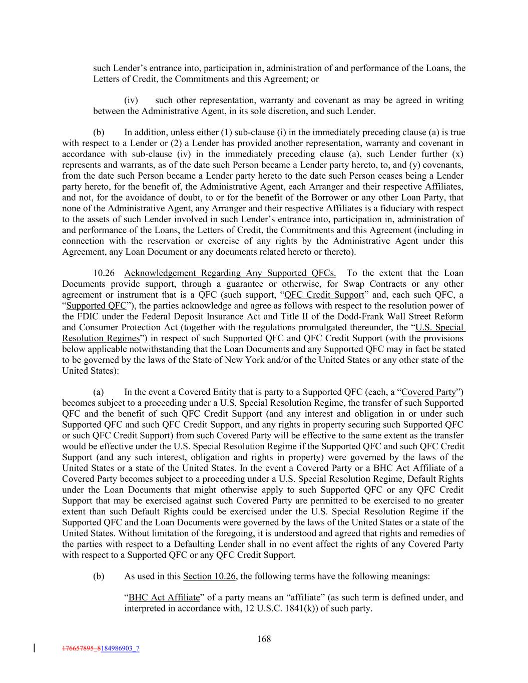 such Lender’s entrance into, participation in, administration of and performance of the Loans, the Letters of Credit, the Commitments and this Agreement; or (iv) such other representation, warranty and covenant as may be agreed in writing between the Administrative Agent, in its sole discretion, and such Lender. (b) In addition, unless either (1) sub-clause (i) in the immediately preceding clause (a) is true with respect to a Lender or (2) a Lender has provided another representation, warranty and covenant in accordance with sub-clause (iv) in the immediately preceding clause (a), such Lender further (x) represents and warrants, as of the date such Person became a Lender party hereto, to, and (y) covenants, from the date such Person became a Lender party hereto to the date such Person ceases being a Lender party hereto, for the benefit of, the Administrative Agent, each Arranger and their respective Affiliates, and not, for the avoidance of doubt, to or for the benefit of the Borrower or any other Loan Party, that none of the Administrative Agent, any Arranger and their respective Affiliates is a fiduciary with respect to the assets of such Lender involved in such Lender’s entrance into, participation in, administration of and performance of the Loans, the Letters of Credit, the Commitments and this Agreement (including in connection with the reservation or exercise of any rights by the Administrative Agent under this Agreement, any Loan Document or any documents related hereto or thereto). 10.26 Acknowledgement Regarding Any Supported QFCs. To the extent that the Loan Documents provide support, through a guarantee or otherwise, for Swap Contracts or any other agreement or instrument that is a QFC (such support, “QFC Credit Support” and, each such QFC, a “Supported QFC”), the parties acknowledge and agree as follows with respect to the resolution power of the FDIC under the Federal Deposit Insurance Act and Title II of the Dodd-Frank Wall Street Reform and Consumer Protection Act (together with the regulations promulgated thereunder, the “U.S. Special Resolution Regimes”) in respect of such Supported QFC and QFC Credit Support (with the provisions below applicable notwithstanding that the Loan Documents and any Supported QFC may in fact be stated to be governed by the laws of the State of New York and/or of the United States or any other state of the United States): (a) In the event a Covered Entity that is party to a Supported QFC (each, a “Covered Party”) becomes subject to a proceeding under a U.S. Special Resolution Regime, the transfer of such Supported QFC and the benefit of such QFC Credit Support (and any interest and obligation in or under such Supported QFC and such QFC Credit Support, and any rights in property securing such Supported QFC or such QFC Credit Support) from such Covered Party will be effective to the same extent as the transfer would be effective under the U.S. Special Resolution Regime if the Supported QFC and such QFC Credit Support (and any such interest, obligation and rights in property) were governed by the laws of the United States or a state of the United States. In the event a Covered Party or a BHC Act Affiliate of a Covered Party becomes subject to a proceeding under a U.S. Special Resolution Regime, Default Rights under the Loan Documents that might otherwise apply to such Supported QFC or any QFC Credit Support that may be exercised against such Covered Party are permitted to be exercised to no greater extent than such Default Rights could be exercised under the U.S. Special Resolution Regime if the Supported QFC and the Loan Documents were governed by the laws of the United States or a state of the United States. Without limitation of the foregoing, it is understood and agreed that rights and remedies of the parties with respect to a Defaulting Lender shall in no event affect the rights of any Covered Party with respect to a Supported QFC or any QFC Credit Support. (b) As used in this Section 10.26, the following terms have the following meanings: “BHC Act Affiliate” of a party means an “affiliate” (as such term is defined under, and interpreted in accordance with, 12 U.S.C. 1841(k)) of such party. 168 176657895_8184986903_7