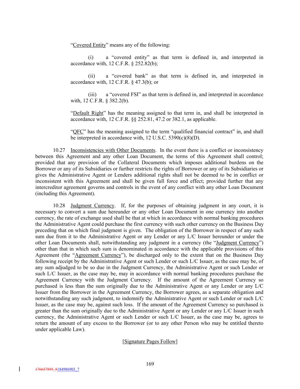 “Covered Entity” means any of the following: (i) a “covered entity” as that term is defined in, and interpreted in accordance with, 12 C.F.R. § 252.82(b); (ii) a “covered bank” as that term is defined in, and interpreted in accordance with, 12 C.F.R. § 47.3(b); or (iii) a “covered FSI” as that term is defined in, and interpreted in accordance with, 12 C.F.R. § 382.2(b). “Default Right” has the meaning assigned to that term in, and shall be interpreted in accordance with, 12 C.F.R. §§ 252.81, 47.2 or 382.1, as applicable. “QFC” has the meaning assigned to the term “qualified financial contract” in, and shall be interpreted in accordance with, 12 U.S.C. 5390(c)(8)(D). 10.27 Inconsistencies with Other Documents. In the event there is a conflict or inconsistency between this Agreement and any other Loan Document, the terms of this Agreement shall control; provided that any provision of the Collateral Documents which imposes additional burdens on the Borrower or any of its Subsidiaries or further restricts the rights of Borrower or any of its Subsidiaries or gives the Administrative Agent or Lenders additional rights shall not be deemed to be in conflict or inconsistent with this Agreement and shall be given full force and effect; provided further that any intercreditor agreement governs and controls in the event of any conflict with any other Loan Document (including this Agreement). 10.28 Judgment Currency. If, for the purposes of obtaining judgment in any court, it is necessary to convert a sum due hereunder or any other Loan Document in one currency into another currency, the rate of exchange used shall be that at which in accordance with normal banking procedures the Administrative Agent could purchase the first currency with such other currency on the Business Day preceding that on which final judgment is given. The obligation of the Borrower in respect of any such sum due from it to the Administrative Agent or any Lender or any L/C Issuer hereunder or under the other Loan Documents shall, notwithstanding any judgment in a currency (the “Judgment Currency”) other than that in which such sum is denominated in accordance with the applicable provisions of this Agreement (the “Agreement Currency”), be discharged only to the extent that on the Business Day following receipt by the Administrative Agent or such Lender or such L/C Issuer, as the case may be, of any sum adjudged to be so due in the Judgment Currency, the Administrative Agent or such Lender or such L/C Issuer, as the case may be, may in accordance with normal banking procedures purchase the Agreement Currency with the Judgment Currency. If the amount of the Agreement Currency so purchased is less than the sum originally due to the Administrative Agent or any Lender or any L/C Issuer from the Borrower in the Agreement Currency, the Borrower agrees, as a separate obligation and notwithstanding any such judgment, to indemnify the Administrative Agent or such Lender or such L/C Issuer, as the case may be, against such loss. If the amount of the Agreement Currency so purchased is greater than the sum originally due to the Administrative Agent or any Lender or any L/C Issuer in such currency, the Administrative Agent or such Lender or such L/C Issuer, as the case may be, agrees to return the amount of any excess to the Borrower (or to any other Person who may be entitled thereto under applicable Law). [Signature Pages Follow] 169 176657895_8184986903_7