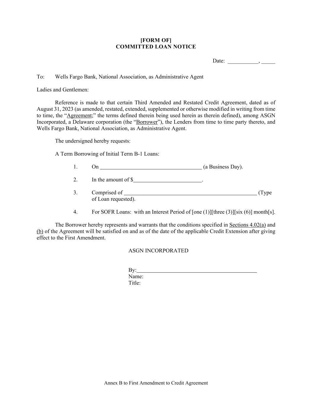 Annex B to First Amendment to Credit Agreement [FORM OF] COMMITTED LOAN NOTICE Date: ___________, _____ To: Wells Fargo Bank, National Association, as Administrative Agent Ladies and Gentlemen: Reference is made to that certain Third Amended and Restated Credit Agreement, dated as of August 31, 2023 (as amended, restated, extended, supplemented or otherwise modified in writing from time to time, the “Agreement;” the terms defined therein being used herein as therein defined), among ASGN Incorporated, a Delaware corporation (the “Borrower”), the Lenders from time to time party thereto, and Wells Fargo Bank, National Association, as Administrative Agent. The undersigned hereby requests: A Term Borrowing of Initial Term B-1 Loans: 1. On (a Business Day). 2. In the amount of $ . 3. Comprised of (Type of Loan requested). 4. For SOFR Loans: with an Interest Period of [one (1)][three (3)][six (6)] month[s]. The Borrower hereby represents and warrants that the conditions specified in Sections 4.02(a) and (b) of the Agreement will be satisfied on and as of the date of the applicable Credit Extension after giving effect to the First Amendment. ASGN INCORPORATED By: Name: Title: