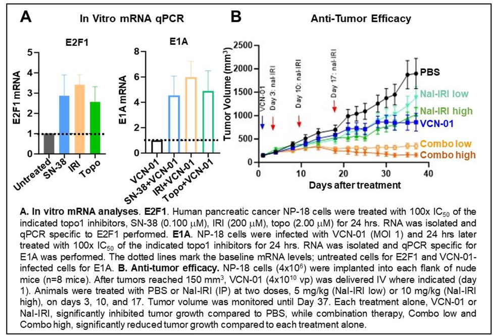 VCN-01 is a clinical-stage oncolytic adenovirus engineered to replicate selectively in cancer cells with an aberrant RB1-E2F pathway. The VCN-01 E1A promoter is modified by inclusion of eight E2F1 binding sites and a 24-bp deletion that promotes viral transcription in cells with elevated free E2F1 and renders the virus replication-deficient in RB1-functional, normal cells. Here, human pancreatic cancer cell lines were exposed to topoisomerase I (topo1) inhibiting chemotherapeutics, irinotecan (IRI), its active metabolite, SN-38, and topotecan (topo; see Figure A). Notably, in NP-18 cells, E2F1 mRNA was increased ~3-fold compared to untreated cells, and E1A mRNA was boosted ~5-fold in cells treated with VCN-01 + topo1 inhibitors compared to VCN-01 alone. These data suggest topo1 inhibitor-mediated elevations in E2F1 increase VCN-01 transcription. Based on these promising in vitro results, potential synergy of VCN-01 plus the liposomal formulation of IRI (nal-IRI) was tested in animals bearing subcutaneous human pancreatic tumors . After tumors were established, indicated animals were treated with a single IV dose of VCN-01 (4x1010 vp) or PBS (day 1). Designated animals in each group were then treated with either PBS or nal-IRI (IP) on days 3, 10 and 17. In animals with NP-18 tumors, treatment with VCN-01 or Nal-IRI alone at both the 10 mg/kg and 5 mg/kg doses resulted in significant tumor growth inhibition compared to PBS (see Figure B). Importantly, combination therapy with VCN-01 + nal-IRI at either dose displayed significantly reduced tumor growth compared to each treatment alone. qPCR analyses performed on tumors collected at end of study confirmed the presence of viral genomes and E1A mRNA suggesting intratumoral viral replication and indicating ongoing transcriptional activity of VCN-01. Preliminary analyses suggest that combination therapy with VCN-01 + nal-IRI has a tolerable toxicity profile. These data are consistent with the hypothesis that topo1 inhibitors increase cellular E2F1 protein expression resulting in upregulation of the modified VCN-01 E1A promoter thereby enhancing viral gene expression and improving anti-tumor efficacy. The combination of VCN-01 + topo1 inhibitors, such as Nal-IRI, may demonstrate improved efficacy in the treatment of human pancreatic cancer.