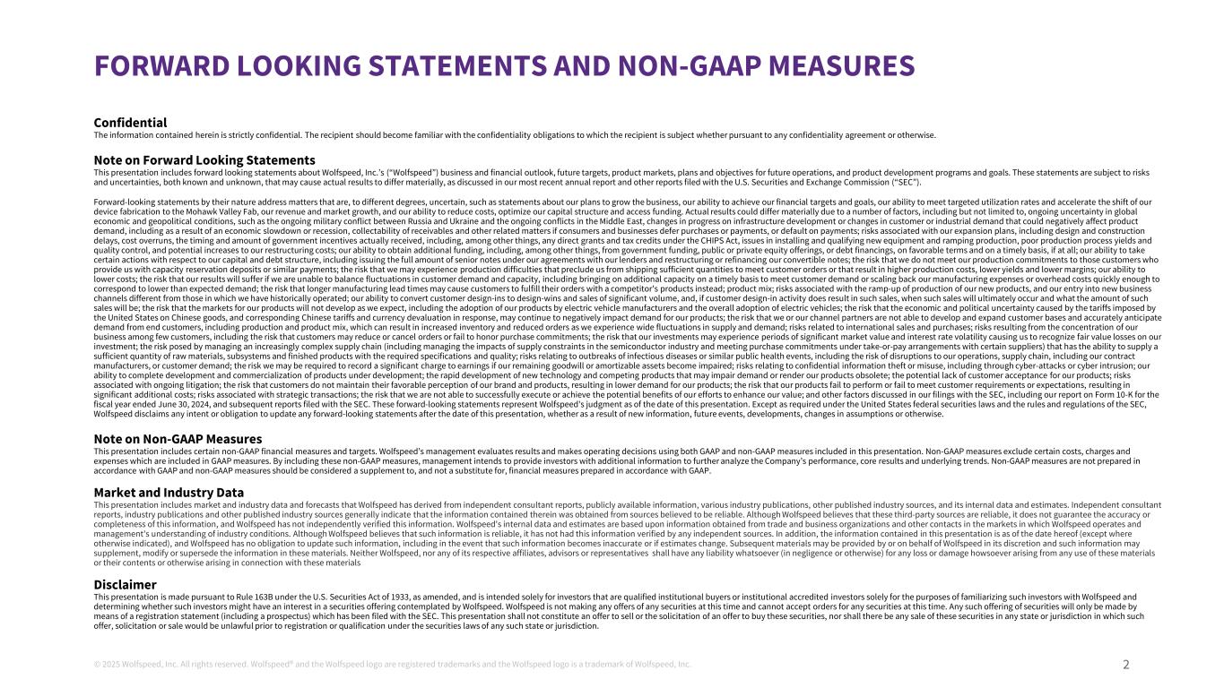© 2025 Wolfspeed, Inc. All rights reserved. Wolfspeed® and the Wolfspeed logo are registered trademarks and the Wolfspeed logo is a trademark of Wolfspeed, Inc. 2 FORWARD LOOKING STATEMENTS AND NON-GAAP MEASURES a Confidential The information contained herein is strictly confidential. The recipient should become familiar with the confidentiality obligations to which the recipient is subject whether pursuant to any confidentiality agreement or otherwise. Note on Forward Looking Statements This presentation includes forward looking statements about Wolfspeed, Inc.’s (“Wolfspeed”) business and financial outlook, future targets, product markets, plans and objectives for future operations, and product development programs and goals. These statements are subject to risks and uncertainties, both known and unknown, that may cause actual results to differ materially, as discussed in our most recent annual report and other reports filed with the U.S. Securities and Exchange Commission (“SEC”). Forward-looking statements by their nature address matters that are, to different degrees, uncertain, such as statements about our plans to grow the business, our ability to achieve our financial targets and goals, our ability to meet targeted utilization rates and accelerate the shift of our device fabrication to the Mohawk Valley Fab, our revenue and market growth, and our ability to reduce costs, optimize our capital structure and access funding. Actual results could differ materially due to a number of factors, including but not limited to, ongoing uncertainty in global economic and geopolitical conditions, such as the ongoing military conflict between Russia and Ukraine and the ongoing conflicts in the Middle East, changes in progress on infrastructure development or changes in customer or industrial demand that could negatively affect product demand, including as a result of an economic slowdown or recession, collectability of receivables and other related matters if consumers and businesses defer purchases or payments, or default on payments; risks associated with our expansion plans, including design and construction delays, cost overruns, the timing and amount of government incentives actually received, including, among other things, any direct grants and tax credits under the CHIPS Act, issues in installing and qualifying new equipment and ramping production, poor production process yields and quality control, and potential increases to our restructuring costs; our ability to obtain additional funding, including, among other things, from government funding, public or private equity offerings, or debt financings, on favorable terms and on a timely basis, if at all; our ability to take certain actions with respect to our capital and debt structure, including issuing the full amount of senior notes under our agreements with our lenders and restructuring or refinancing our convertible notes; the risk that we do not meet our production commitments to those customers who provide us with capacity reservation deposits or similar payments; the risk that we may experience production difficulties that preclude us from shipping sufficient quantities to meet customer orders or that result in higher production costs, lower yields and lower margins; our ability to lower costs; the risk that our results will suffer if we are unable to balance fluctuations in customer demand and capacity, including bringing on additional capacity on a timely basis to meet customer demand or scaling back our manufacturing expenses or overhead costs quickly enough to correspond to lower than expected demand; the risk that longer manufacturing lead times may cause customers to fulfill their orders with a competitor's products instead; product mix; risks associated with the ramp-up of production of our new products, and our entry into new business channels different from those in which we have historically operated; our ability to convert customer design-ins to design-wins and sales of significant volume, and, if customer design-in activity does result in such sales, when such sales will ultimately occur and what the amount of such sales will be; the risk that the markets for our products will not develop as we expect, including the adoption of our products by electric vehicle manufacturers and the overall adoption of electric vehicles; the risk that the economic and political uncertainty caused by the tariffs imposed by the United States on Chinese goods, and corresponding Chinese tariffs and currency devaluation in response, may continue to negatively impact demand for our products; the risk that we or our channel partners are not able to develop and expand customer bases and accurately anticipate demand from end customers, including production and product mix, which can result in increased inventory and reduced orders as we experience wide fluctuations in supply and demand; risks related to international sales and purchases; risks resulting from the concentration of our business among few customers, including the risk that customers may reduce or cancel orders or fail to honor purchase commitments; the risk that our investments may experience periods of significant market value and interest rate volatility causing us to recognize fair value losses on our investment; the risk posed by managing an increasingly complex supply chain (including managing the impacts of supply constraints in the semiconductor industry and meeting purchase commitments under take-or-pay arrangements with certain suppliers) that has the ability to supply a sufficient quantity of raw materials, subsystems and finished products with the required specifications and quality; risks relating to outbreaks of infectious diseases or similar public health events, including the risk of disruptions to our operations, supply chain, including our contract manufacturers, or customer demand; the risk we may be required to record a significant charge to earnings i