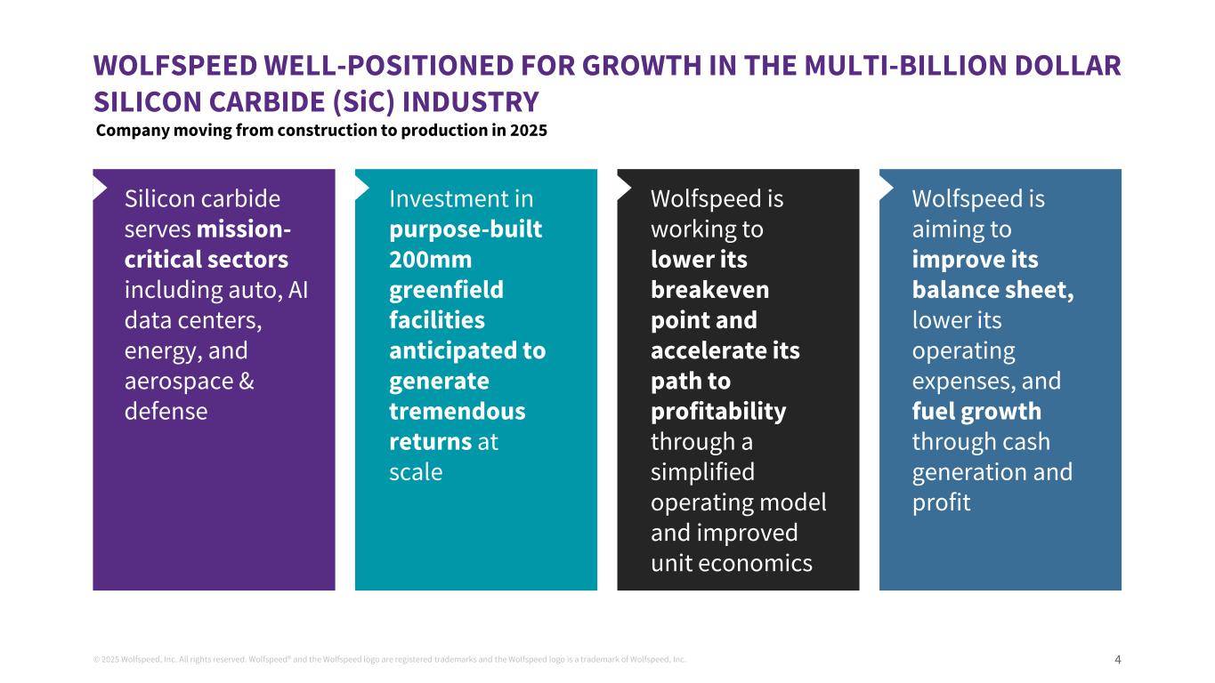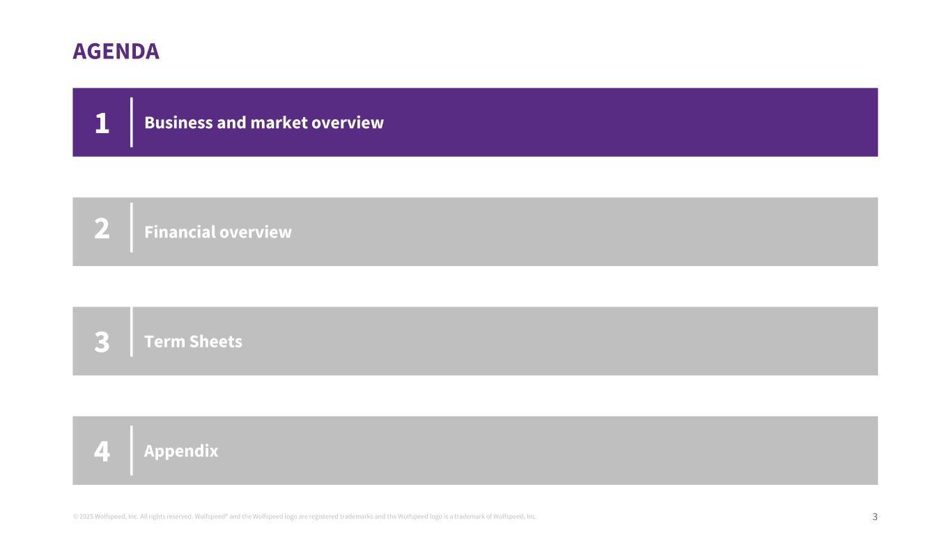 © 2025 Wolfspeed, Inc. All rights reserved. Wolfspeed® and the Wolfspeed logo are registered trademarks and the Wolfspeed logo is a trademark of Wolfspeed, Inc. 3 AGENDA Business and market overview Financial overview Term Sheets 1 2 3 Appendix4