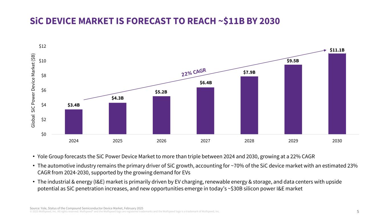 © 2025 Wolfspeed, Inc. All rights reserved. Wolfspeed® and the Wolfspeed logo are registered trademarks and the Wolfspeed logo is a trademark of Wolfspeed, Inc. 4 Silicon carbide serves mission- critical sectors including auto, AI data centers, energy, and aerospace & defense Investment in purpose-built 200mm greenfield facilities anticipated to generate tremendous returns at scale Wolfspeed is working to lower its breakeven point and accelerate its path to profitability through a simplified operating model and improved unit economics Wolfspeed is aiming to improve its balance sheet, lower its operating expenses, and fuel growth through cash generation and profit WOLFSPEED WELL-POSITIONED FOR GROWTH IN THE MULTI-BILLION DOLLAR SILICON CARBIDE (SiC) INDUSTRY Company moving from construction to production in 2025
