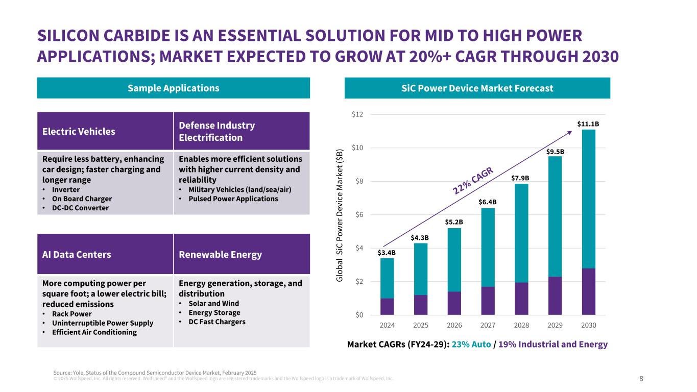 © 2025 Wolfspeed, Inc. All rights reserved. Wolfspeed® and the Wolfspeed logo are registered trademarks and the Wolfspeed logo is a trademark of Wolfspeed, Inc. 7 WOLFSPEED IS A LEADING PURE PLAY, VERTICALLY INTEGRATED SILICON CARBIDE COMPANY WITH A CUSTOMER BASE OF INDUSTRY LEADERS Materials Silicon Carbide Crystals Wafers and Epitaxy Wafer Fabrication (Bare Die) Devices Packaged Parts (MOSFETs, Diodes, Power Modules) $392M FY24 Rev $416M FY24 Rev Automotive Industrial & Energy Wolfspeed customer examples (Non-exhaustive)