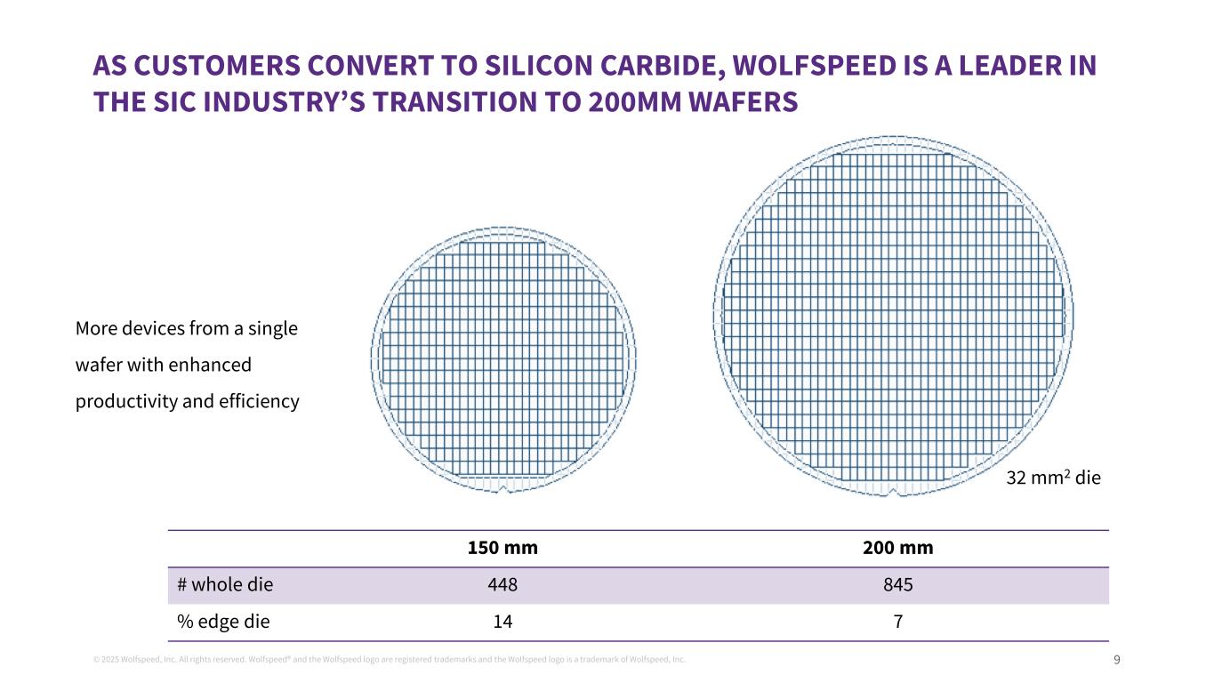 © 2025 Wolfspeed, Inc. All rights reserved. Wolfspeed® and the Wolfspeed logo are registered trademarks and the Wolfspeed logo is a trademark of Wolfspeed, Inc. 8 Electric Vehicles Defense Industry Electrification Require less battery, enhancing car design; faster charging and longer range • Inverter • On Board Charger • DC-DC Converter Enables more efficient solutions with higher current density and reliability • Military Vehicles (land/sea/air) • Pulsed Power Applications AI Data Centers Renewable Energy More computing power per square foot; a lower electric bill; reduced emissions • Rack Power • Uninterruptible Power Supply • Efficient Air Conditioning Energy generation, storage, and distribution • Solar and Wind • Energy Storage • DC Fast Chargers SILICON CARBIDE IS AN ESSENTIAL SOLUTION FOR MID TO HIGH POWER APPLICATIONS; MARKET EXPECTED TO GROW AT 20%+ CAGR THROUGH 2030 Sample Applications $0 $2 $4 $6 $8 $10 $12 2024 2025 2026 2027 2028 2029 2030 Market CAGRs (FY24-29): 23% Auto / 19% Industrial and Energy $3.4B $4.3B $5.2B $6.4B $7.9B $11.1B SiC Power Device Market Forecast Gl ob al S iC P ow er D ev ic e M ar ke t ( $B ) Source: Yole, Status of the Compound Semiconductor Device Market, February 2025 $9.5B