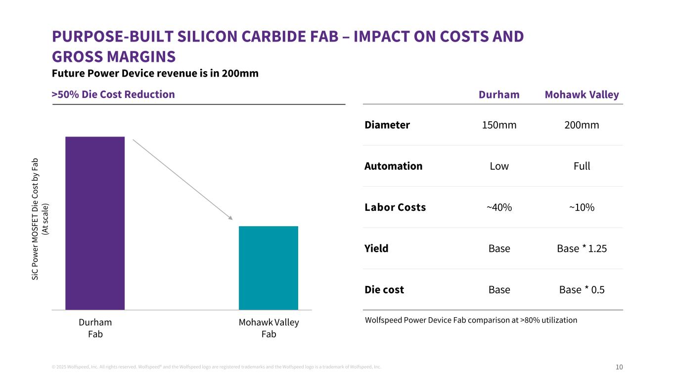 © 2025 Wolfspeed, Inc. All rights reserved. Wolfspeed® and the Wolfspeed logo are registered trademarks and the Wolfspeed logo is a trademark of Wolfspeed, Inc. 9 AS CUSTOMERS CONVERT TO SILICON CARBIDE, WOLFSPEED IS A LEADER IN THE SIC INDUSTRY’S TRANSITION TO 200MM WAFERS More devices from a single wafer with enhanced productivity and efficiency 32 mm2 die 150 mm 200 mm # whole die 448 845 % edge die 14 7