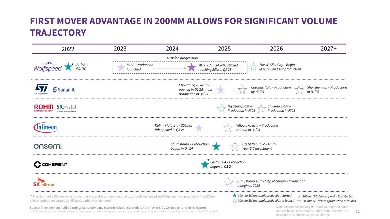 © 2025 Wolfspeed, Inc. All rights reserved. Wolfspeed® and the Wolfspeed logo are registered trademarks and the Wolfspeed logo is a trademark of Wolfspeed, Inc. 10 PURPOSE-BUILT SILICON CARBIDE FAB – IMPACT ON COSTS AND GROSS MARGINS Future Power Device revenue is in 200mm >50% Die Cost Reduction Durham Fab Mohawk Valley Fab Durham Mohawk Valley Diameter 150mm 200mm Automation Low Full Labor Costs ~40% ~10% Yield Base Base * 1.25 Die cost Base Base * 0.5 Si C Po w er M O SF ET D ie C os t b y Fa b (A t s ca le ) Wolfspeed Power Device Fab comparison at >80% utilization