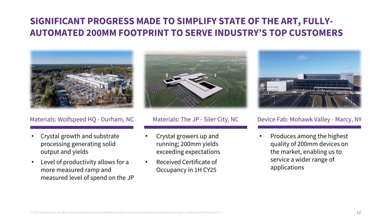 © 2025 Wolfspeed, Inc. All rights reserved. Wolfspeed® and the Wolfspeed logo are registered trademarks and the Wolfspeed logo is a trademark of Wolfspeed, Inc. 11 FIRST MOVER ADVANTAGE IN 200MM ALLOWS FOR SIGNIFICANT VOLUME TRAJECTORY 2023 2024 2025 2026 2027+ Czech Republic – Multi- Year SiC Investment Easton, PA – Production began in Q3’24 Miyazaki plant – Production in FY25 Chikugo plant – Production in FY25 The JP Siler City – Begin in H1’25 and 10x production Gumi, Korea & Bay City, Michigan – Production to begin in 2025 200mm SiC devices production started 200mm SiC devices production to launch Source: Timeline from Public Earnings Calls, Company Investor Relations Materials, Yole Power SiC 2024 Report, and News Reports. MHV – Jun’24 20% utilized, reaching 25% in Q1’25 MHV - Production launched MHV fab progression Kulim, Malaysia - 200mm fab opened in Q3’24 2022 200mm SiC materials production started* The star marks 200mm wafer production at scalable automotive-quality, as both Wolfspeed and Coherent have produced initial 200mm silicon carbide substrates significantly earlier than denoted 200mm SiC materials production to launch * Durham HQ, NC * South Korea – Production began in Q4’24 Villach, Austria – Production roll-out in Q1’25 Catania, Italy – Production by H2’25 Chongqing – Facility opened in Q1’25, mass production in Q4’25 Shenzhen fab – Production in H1’26 Note: All forward-looking dates are anticipated dates and are based on company public announcements or news reports and are subject to change