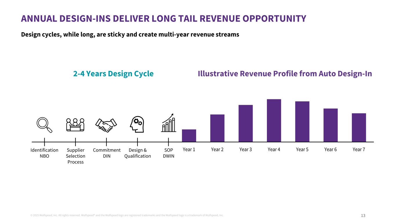 © 2025 Wolfspeed, Inc. All rights reserved. Wolfspeed® and the Wolfspeed logo are registered trademarks and the Wolfspeed logo is a trademark of Wolfspeed, Inc. 12 SIGNIFICANT PROGRESS MADE TO SIMPLIFY STATE OF THE ART, FULLY- AUTOMATED 200MM FOOTPRINT TO SERVE INDUSTRY’S TOP CUSTOMERS • Crystal growth and substrate processing generating solid output and yields • Level of productivity allows for a more measured ramp and measured level of spend on the JP Materials: Wolfspeed HQ - Durham, NC • Crystal growers up and running; 200mm yields exceeding expectations • Received Certificate of Occupancy in 1H CY25 Materials: The JP - Siler City, NC • Produces among the highest quality of 200mm devices on the market, enabling us to service a wider range of applications Device Fab: Mohawk Valley - Marcy, NY