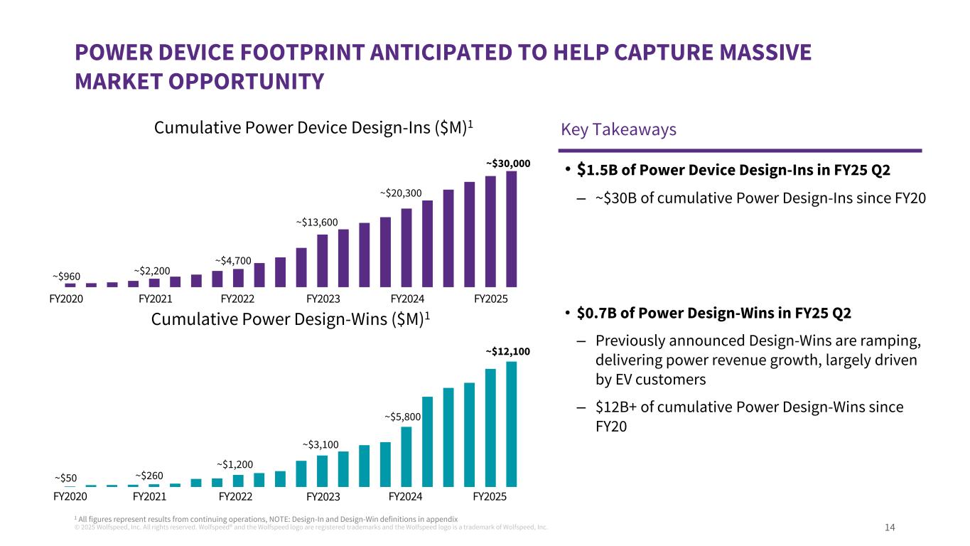 © 2025 Wolfspeed, Inc. All rights reserved. Wolfspeed® and the Wolfspeed logo are registered trademarks and the Wolfspeed logo is a trademark of Wolfspeed, Inc. ANNUAL DESIGN-INS DELIVER LONG TAIL REVENUE OPPORTUNITY 13 Illustrative Revenue Profile from Auto Design-In2-4 Years Design Cycle Design cycles, while long, are sticky and create multi-year revenue streams Year 1 Year 2 Year 3 Year 4 Year 5 Year 6 Year 7Identification NBO Supplier Selection Process Commitment DIN Design & Qualification SOP DWIN