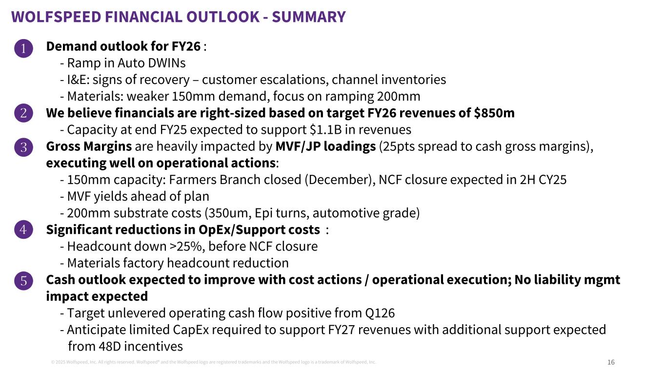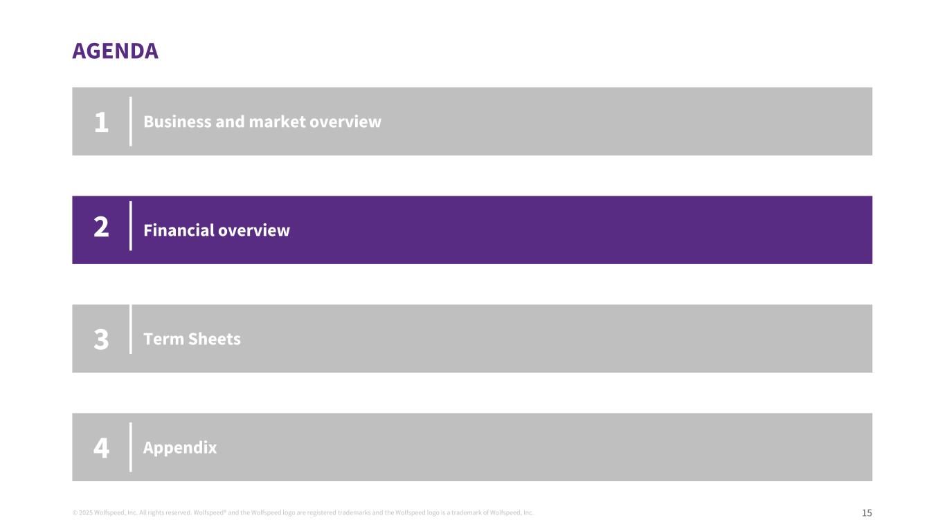 © 2025 Wolfspeed, Inc. All rights reserved. Wolfspeed® and the Wolfspeed logo are registered trademarks and the Wolfspeed logo is a trademark of Wolfspeed, Inc. 15 AGENDA Business and market overview Financial overview Term Sheets 1 2 3 Appendix4
