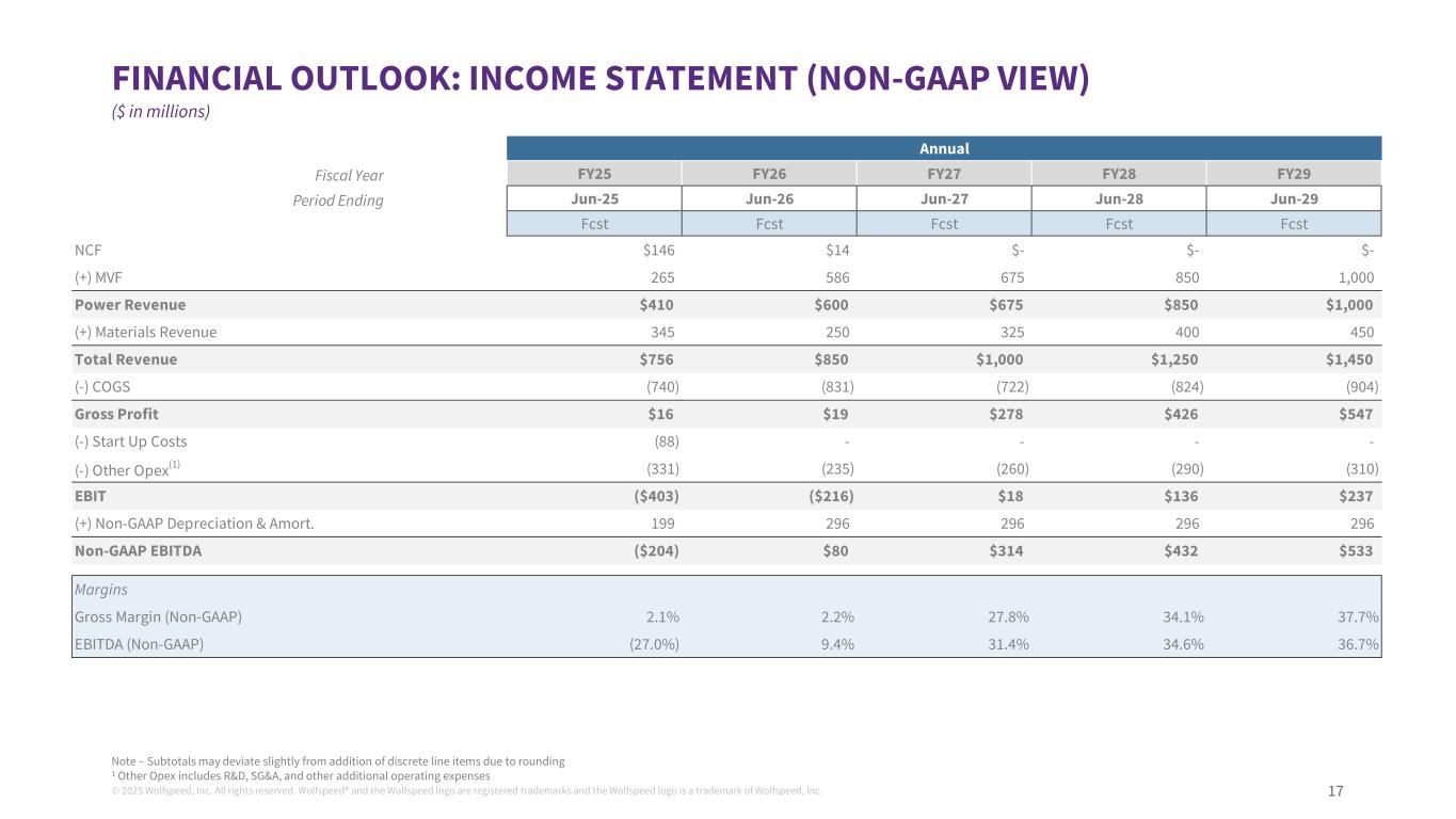 © 2025 Wolfspeed, Inc. All rights reserved. Wolfspeed® and the Wolfspeed logo are registered trademarks and the Wolfspeed logo is a trademark of Wolfspeed, Inc. 16 WOLFSPEED FINANCIAL OUTLOOK - SUMMARY Demand outlook for FY26 : - Ramp in Auto DWINs - I&E: signs of recovery – customer escalations, channel inventories - Materials: weaker 150mm demand, focus on ramping 200mm We believe financials are right-sized based on target FY26 revenues of $850m - Capacity at end FY25 expected to support $1.1B in revenues Gross Margins are heavily impacted by MVF/JP loadings (25pts spread to cash gross margins), executing well on operational actions: - 150mm capacity: Farmers Branch closed (December), NCF closure expected in 2H CY25 - MVF yields ahead of plan - 200mm substrate costs (350um, Epi turns, automotive grade) Significant reductions in OpEx/Support costs : - Headcount down >25%, before NCF closure - Materials factory headcount reduction Cash outlook expected to improve with cost actions / operational execution; No liability mgmt impact expected - Target unlevered operating cash flow positive from Q126 - Anticipate limited CapEx required to support FY27 revenues with additional support expected from 48D incentives ❶ ❷ ❸ ❺ ❹