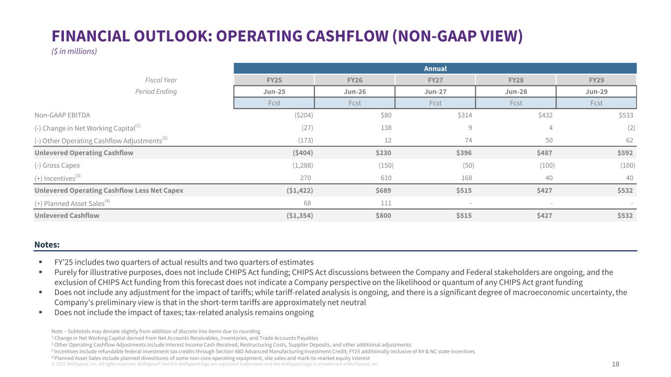 © 2025 Wolfspeed, Inc. All rights reserved. Wolfspeed® and the Wolfspeed logo are registered trademarks and the Wolfspeed logo is a trademark of Wolfspeed, Inc. 17 Annual Fiscal Year FY25 FY26 FY27 FY28 FY29 Period Ending Jun-25 Jun-26 Jun-27 Jun-28 Jun-29 Fcst Fcst Fcst Fcst Fcst NCF $146 $14 $- $- $- (+) MVF 265 586 675 850 1,000 Power Revenue $410 $600 $675 $850 $1,000 (+) Materials Revenue 345 250 325 400 450 Total Revenue $756 $850 $1,000 $1,250 $1,450 (-) COGS (740) (831) (722) (824) (904) Gross Profit $16 $19 $278 $426 $547 (-) Start Up Costs (88) - - - - (-) Other Opex(1) (331) (235) (260) (290) (310) EBIT ($403) ($216) $18 $136 $237 (+) Non-GAAP Depreciation & Amort. 199 296 296 296 296 Non-GAAP EBITDA ($204) $80 $314 $432 $533 Margins Gross Margin (Non-GAAP) 2.1% 2.2% 27.8% 34.1% 37.7% EBITDA (Non-GAAP) (27.0%) 9.4% 31.4% 34.6% 36.7% FINANCIAL OUTLOOK: INCOME STATEMENT (NON-GAAP VIEW) ($ in millions) Note – Subtotals may deviate slightly from addition of discrete line items due to rounding 1 Other Opex includes R&D, SG&A, and other additional operating expenses