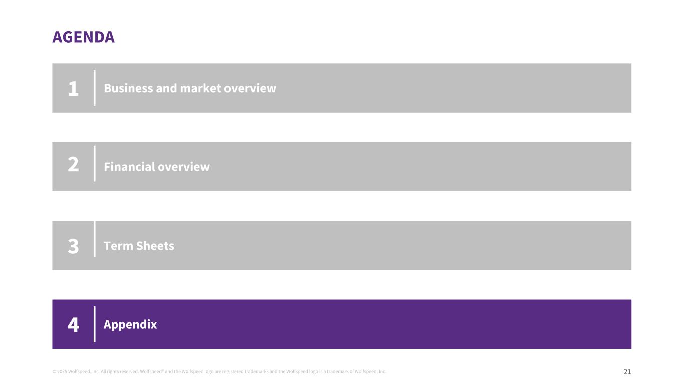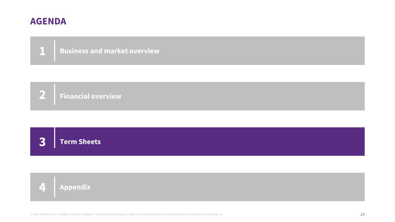 © 2025 Wolfspeed, Inc. All rights reserved. Wolfspeed® and the Wolfspeed logo are registered trademarks and the Wolfspeed logo is a trademark of Wolfspeed, Inc. 19 AGENDA Business and market overview Financial overview Term Sheets 1 2 3 Appendix4