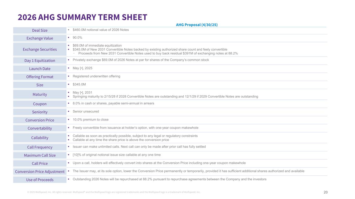 © 2025 Wolfspeed, Inc. All rights reserved. Wolfspeed® and the Wolfspeed logo are registered trademarks and the Wolfspeed logo is a trademark of Wolfspeed, Inc. 20 2026 AHG SUMMARY TERM SHEET AHG Proposal (4/30/25) Deal Size  $460.0M notional value of 2026 Notes Exchange Value  90.0% Exchange Securities  $69.0M of immediate equitization  $345.0M of New 2031 Convertible Notes backed by existing authorized share count and feely convertible - Proceeds from New 2031 Convertible Notes used to buy back residual $391M of exchanging notes at 88.2% Day 1 Equitization  Privately exchange $69.0M of 2026 Notes at par for shares of the Company’s common stock Launch Date  May [•], 2025 Offering Format  Registered underwritten offering Size  $345.0M Maturity  May [•], 2031  Springing maturity to 2/15/28 if 2028 Convertible Notes are outstanding and 12/1/29 if 2029 Convertible Notes are outstanding Coupon  8.0% in cash or shares, payable semi-annual in arrears Seniority  Senior unsecured Conversion Price  10.0% premium to close Convertability  Freely convertible from issuance at holder’s option, with one-year coupon makewhole Callability  Callable as soon as practically possible, subject to any legal or regulatory constraints  Callable at any time the share price is above the conversion price Call Frequency  Issuer can make unlimited calls. Next call can only be made after prior call has fully settled Maximum Call Size  [10]% of original notional issue size callable at any one time Call Price  Upon a call, holders will effectively convert into shares at the Conversion Price including one-year coupon makewhole Conversion Price Adjustment  The Issuer may, at its sole option, lower the Conversion Price permanently or temporarily, provided it has sufficient additional shares authorized and available Use of Proceeds  Outstanding 2026 Notes will be repurchased at 88.2% pursuant to repurchase agreements between the Company and the investors