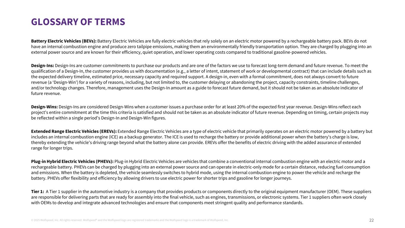 © 2025 Wolfspeed, Inc. All rights reserved. Wolfspeed® and the Wolfspeed logo are registered trademarks and the Wolfspeed logo is a trademark of Wolfspeed, Inc. 22 GLOSSARY OF TERMS Battery Electric Vehicles (BEVs): Battery Electric Vehicles are fully electric vehicles that rely solely on an electric motor powered by a rechargeable battery pack. BEVs do not have an internal combustion engine and produce zero tailpipe emissions, making them an environmentally friendly transportation option. They are charged by plugging into an external power source and are known for their efficiency, quiet operation, and lower operating costs compared to traditional gasoline-powered vehicles. Design-Ins: Design-Ins are customer commitments to purchase our products and are one of the factors we use to forecast long-term demand and future revenue. To meet the qualification of a Design-In, the customer provides us with documentation (e.g., a letter of intent, statement of work or developmental contract) that can include details such as the expected delivery timeline, estimated price, necessary capacity and required support. A design-in, even with a formal commitment, does not always convert to future revenue (a ‘Design-Win') for a variety of reasons, including, but not limited to, the customer delaying or abandoning the project, capacity constraints, timeline challenges, and/or technology changes. Therefore, management uses the Design-In amount as a guide to forecast future demand, but it should not be taken as an absolute indicator of future revenue. Design-Wins: Design-Ins are considered Design-Wins when a customer issues a purchase order for at least 20% of the expected first year revenue. Design-Wins reflect each project's entire commitment at the time this criteria is satisfied and should not be taken as an absolute indicator of future revenue. Depending on timing, certain projects may be reflected within a single period’s Design-In and Design-Win figures. Extended Range Electric Vehicles (EREVs): Extended Range Electric Vehicles are a type of electric vehicle that primarily operates on an electric motor powered by a battery but includes an internal combustion engine (ICE) as a backup generator. The ICE is used to recharge the battery or provide additional power when the battery's charge is low, thereby extending the vehicle's driving range beyond what the battery alone can provide. EREVs offer the benefits of electric driving with the added assurance of extended range for longer trips. Plug-in Hybrid Electric Vehicles (PHEVs): Plug-in Hybrid Electric Vehicles are vehicles that combine a conventional internal combustion engine with an electric motor and a rechargeable battery. PHEVs can be charged by plugging into an external power source and can operate in electric-only mode for a certain distance, reducing fuel consumption and emissions. When the battery is depleted, the vehicle seamlessly switches to hybrid mode, using the internal combustion engine to power the vehicle and recharge the battery. PHEVs offer flexibility and efficiency by allowing drivers to use electric power for shorter trips and gasoline for longer journeys. Tier 1: A Tier 1 supplier in the automotive industry is a company that provides products or components directly to the original equipment manufacturer (OEM). These suppliers are responsible for delivering parts that are ready for assembly into the final vehicle, such as engines, transmissions, or electronic systems. Tier 1 suppliers often work closely with OEMs to develop and integrate advanced technologies and ensure that components meet stringent quality and performance standards.