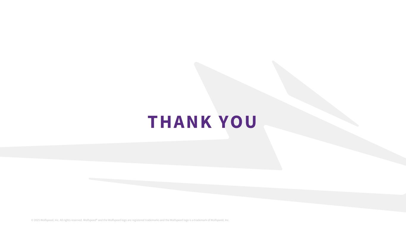 © 2025 Wolfspeed, Inc. All rights reserved. Wolfspeed® and the Wolfspeed logo are registered trademarks and the Wolfspeed logo is a trademark of Wolfspeed, Inc. THANK YOU