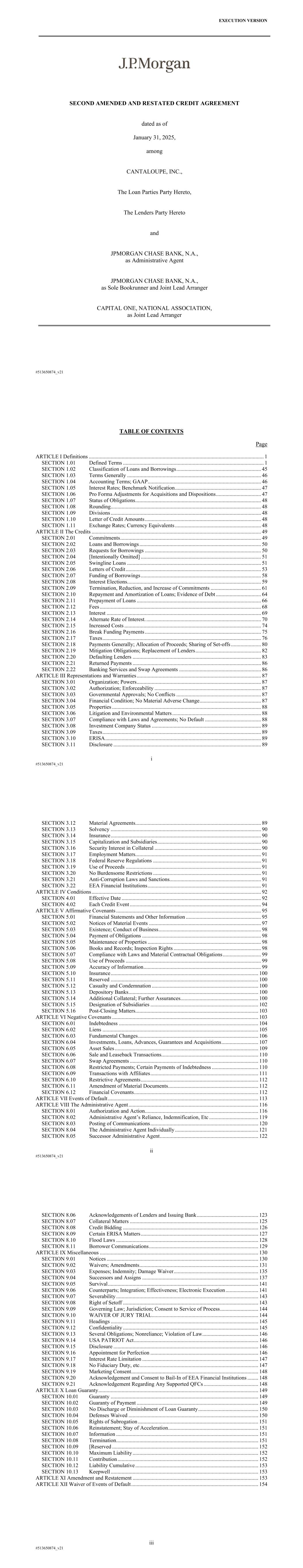 EXECUTION VERSION #513650874_v21 SECOND AMENDED AND RESTATED CREDIT AGREEMENT dated as of January 31, 2025, among CANTALOUPE, INC., The Loan Parties Party Hereto, The Lenders Party Hereto and JPMORGAN CHASE BANK, N.A., as Administrative Agent JPMORGAN CHASE BANK, N.A., as Sole Bookrunner and Joint Lead Arranger CAPITAL ONE, NATIONAL ASSOCIATION, as Joint Lead Arranger i #513650874_v21 TABLE OF CONTENTS Page ARTICLE I Definitions ................................................................................................................................ 1 SECTION 1.01 Defined Terms ....................................................................................................... 1 SECTION 1.02 Classification of Loans and Borrowings .............................................................. 45 SECTION 1.03 Terms Generally .................................................................................................. 46 SECTION 1.04 Accounting Terms; GAAP ................................................................................... 46 SECTION 1.05 Interest Rates; Benchmark Notification ............................................................... 47 SECTION 1.06 Pro Forma Adjustments for Acquisitions and Dispositions ................................. 47 SECTION 1.07 Status of Obligations ............................................................................................ 48 SECTION 1.08 Rounding .............................................................................................................. 48 SECTION 1.09 Divisions .............................................................................................................. 48 SECTION 1.10 Letter of Credit Amounts ..................................................................................... 48 SECTION 1.11 Exchange Rates; Currency Equivalents ............................................................... 48 ARTICLE II The Credits ............................................................................................................................ 49 SECTION 2.01 Commitments ....................................................................................................... 49 SECTION 2.02 Loans and Borrowings ......................................................................................... 50 SECTION 2.03 Requests for Borrowings ..................................................................................... 50 SECTION 2.04 [Intentionally Omitted] ........................................................................................ 51 SECTION 2.05 Swingline Loans .................................................................................................. 51 SECTION 2.06 Letters of Credit ................................................................................................... 53 SECTION 2.07 Funding of Borrowings ........................................................................................ 58 SECTION 2.08 Interest Elections.................................................................................................. 59 SECTION 2.09 Termination, Reduction, and Increase of Commitments ..................................... 61 SECTION 2.10 Repayment and Amortization of Loans; Evidence of Debt ................................. 64 SECTION 2.11 Prepayment of Loans ........................................................................................... 66 SECTION 2.12 Fees ...................................................................................................................... 68 SECTION 2.13 Interest ................................................................................................................. 69 SECTION 2.14 Alternate Rate of Interest. .................................................................................... 70 SECTION 2.15 Increased Costs .................................................................................................... 74 SECTION 2.16 Break Funding Payments ..................................................................................... 75 SECTION 2.17 Taxes .................................................................................................................... 76 SECTION 2.18 Payments Generally; Allocation of Proceeds; Sharing of Set-offs ...................... 80 SECTION 2.19 Mitigation Obligations; Replacement of Lenders ................................................ 82 SECTION 2.20 Defaulting Lenders .............................................................................................. 83 SECTION 2.21 Returned Payments .............................................................................................. 86 SECTION 2.22 Banking Services and Swap Agreements ............................................................ 86 ARTICLE III Representations and Warranties ........................................................................................... 87 SECTION 3.01 Organization; Powers ........................................................................................... 87 SECTION 3.02 Authorization; Enforceability .............................................................................. 87 SECTION 3.03 Governmental Approvals; No Conflicts .............................................................. 87 SECTION 3.04 Financial Condition; No Material Adverse Change ............................................. 87 SECTION 3.05 Properties ............................................................................................................. 88 SECTION 3.06 Litigation and Environmental Matters ................................................................. 88 SECTION 3.07 Compliance with Laws and Agreements; No Default ......................................... 88 SECTION 3.08 Investment Company Status ................................................................................ 89 SECTION 3.09 Taxes ...............