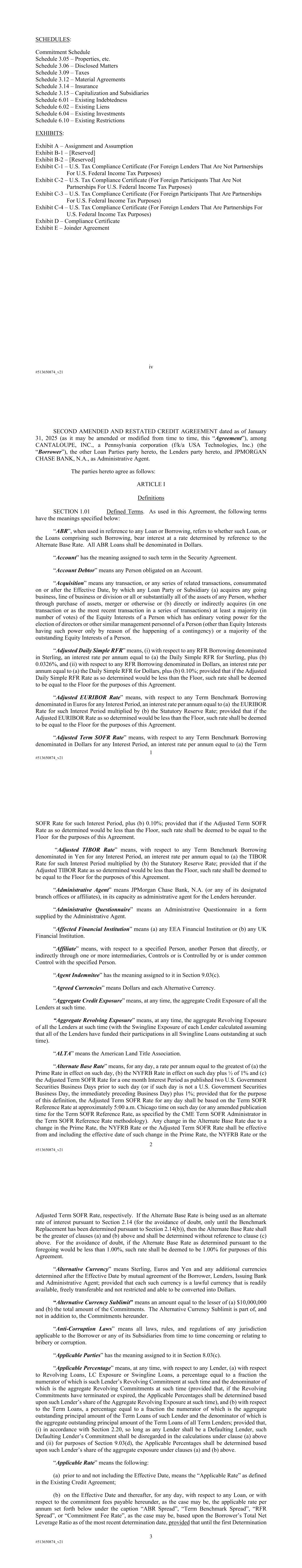 iv #513650874_v21 SCHEDULES: Commitment Schedule Schedule 3.05 – Properties, etc. Schedule 3.06 – Disclosed Matters Schedule 3.09 – Taxes Schedule 3.12 – Material Agreements Schedule 3.14 – Insurance Schedule 3.15 – Capitalization and Subsidiaries Schedule 6.01 – Existing Indebtedness Schedule 6.02 – Existing Liens Schedule 6.04 – Existing Investments Schedule 6.10 – Existing Restrictions EXHIBITS: Exhibit A – Assignment and Assumption Exhibit B-1 – [Reserved] Exhibit B-2 – [Reserved] Exhibit C-1 – U.S. Tax Compliance Certificate (For Foreign Lenders That Are Not Partnerships For U.S. Federal Income Tax Purposes) Exhibit C-2 – U.S. Tax Compliance Certificate (For Foreign Participants That Are Not Partnerships For U.S. Federal Income Tax Purposes) Exhibit C-3 – U.S. Tax Compliance Certificate (For Foreign Participants That Are Partnerships For U.S. Federal Income Tax Purposes) Exhibit C-4 – U.S. Tax Compliance Certificate (For Foreign Lenders That Are Partnerships For U.S. Federal Income Tax Purposes) Exhibit D – Compliance Certificate Exhibit E – Joinder Agreement 1 #513650874_v21 SECOND AMENDED AND RESTATED CREDIT AGREEMENT dated as of January 31, 2025 (as it may be amended or modified from time to time, this “Agreement”), among CANTALOUPE, INC., a Pennsylvania corporation (f/k/a USA Technologies, Inc.) (the “Borrower”), the other Loan Parties party hereto, the Lenders party hereto, and JPMORGAN CHASE BANK, N.A., as Administrative Agent. The parties hereto agree as follows: ARTICLE I Definitions SECTION 1.01 Defined Terms. As used in this Agreement, the following terms have the meanings specified below: “ABR”, when used in reference to any Loan or Borrowing, refers to whether such Loan, or the Loans comprising such Borrowing, bear interest at a rate determined by reference to the Alternate Base Rate. All ABR Loans shall be denominated in Dollars. “Account” has the meaning assigned to such term in the Security Agreement. “Account Debtor” means any Person obligated on an Account. “Acquisition” means any transaction, or any series of related transactions, consummated on or after the Effective Date, by which any Loan Party or Subsidiary (a) acquires any going business, line of business or division or all or substantially all of the assets of any Person, whether through purchase of assets, merger or otherwise or (b) directly or indirectly acquires (in one transaction or as the most recent transaction in a series of transactions) at least a majority (in number of votes) of the Equity Interests of a Person which has ordinary voting power for the election of directors or other similar management personnel of a Person (other than Equity Interests having such power only by reason of the happening of a contingency) or a majority of the outstanding Equity Interests of a Person. “Adjusted Daily Simple RFR” means, (i) with respect to any RFR Borrowing denominated in Sterling, an interest rate per annum equal to (a) the Daily Simple RFR for Sterling, plus (b) 0.0326%, and (ii) with respect to any RFR Borrowing denominated in Dollars, an interest rate per annum equal to (a) the Daily Simple RFR for Dollars, plus (b) 0.10%; provided that if the Adjusted Daily Simple RFR Rate as so determined would be less than the Floor, such rate shall be deemed to be equal to the Floor for the purposes of this Agreement. “Adjusted EURIBOR Rate” means, with respect to any Term Benchmark Borrowing denominated in Euros for any Interest Period, an interest rate per annum equal to (a) the EURIBOR Rate for such Interest Period multiplied by (b) the Statutory Reserve Rate; provided that if the Adjusted EURIBOR Rate as so determined would be less than the Floor, such rate shall be deemed to be equal to the Floor for the purposes of this Agreement. “Adjusted Term SOFR Rate” means, with respect to any Term Benchmark Borrowing denominated in Dollars for any Interest Period, an interest rate per annum equal to (a) the Term 2 #513650874_v21 SOFR Rate for such Interest Period, plus (b) 0.10%; provided that if the Adjusted Term SOFR Rate as so determined would be less than the Floor, such rate shall be deemed to be equal to the Floor for the purposes of this Agreement. “Adjusted TIBOR Rate” means, with respect to any Term Benchmark Borrowing denominated in Yen for any Interest Period, an interest rate per annum equal to (a) the TIBOR Rate for such Interest Period multiplied by (b) the Statutory Reserve Rate; provided that if the Adjusted TIBOR Rate as so determined would be less than the Floor, such rate shall be deemed to be equal to the Floor for the purposes of this Agreement. “Administrative Agent” means JPMorgan Chase Bank, N.A. (or any of its designated branch offices or affiliates), in its capacity as administrative agent for the Lenders hereunder. “Administrative Questionnaire” means an Administrative Questionnaire in a form supplied by the Administrative Agent. “Affected Financial Institution” means (a) any EEA Financial Institution or (b) any UK Financial Institution. “Affiliate” means, with respect to a specified Person, another Person that directly, or indirectly through one or more intermediaries, Controls or is Controlled by or is under common Control with the specified Person. “Agent Indemnitee” has the meaning assigned to it in Section 9.03(c). “Agreed Currencies” means Dollars and each Alternative Currency. “Aggregate Credit Exposure” means, at any time, the aggregate Credit Exposure of all the Lenders at such time. “Aggregate Revolving Exposure” means, at any time, the aggregate Revolving Exposure of all the Lenders at such time (with the Swingline Exposure of each Lender calculated assuming that all of the Lenders have funded their participations in all Swingline Loans outstanding at such time). “ALTA” means the American Land Title Association. “Alternate Base Rate” means, for any day, a rate per a