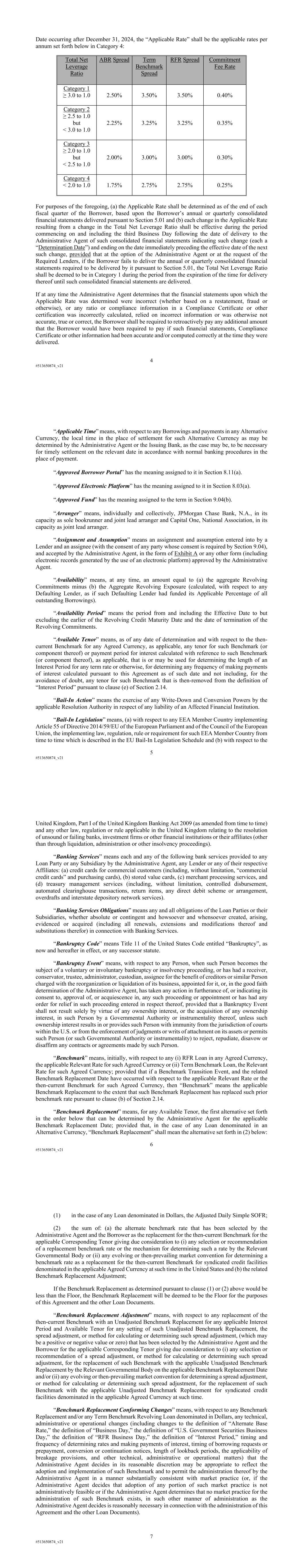 4 #513650874_v21 Date occurring after December 31, 2024, the “Applicable Rate” shall be the applicable rates per annum set forth below in Category 4: Total Net Leverage Ratio ABR Spread Term Benchmark Spread RFR Spread Commitment Fee Rate Category 1 ≥ 3.0 to 1.0 2.50% 3.50% 3.50% 0.40% Category 2 ≥ 2.5 to 1.0 but < 3.0 to 1.0 2.25% 3.25% 3.25% 0.35% Category 3 ≥ 2.0 to 1.0 but < 2.5 to 1.0 2.00% 3.00% 3.00% 0.30% Category 4 < 2.0 to 1.0 1.75% 2.75% 2.75% 0.25% For purposes of the foregoing, (a) the Applicable Rate shall be determined as of the end of each fiscal quarter of the Borrower, based upon the Borrower’s annual or quarterly consolidated financial statements delivered pursuant to Section 5.01 and (b) each change in the Applicable Rate resulting from a change in the Total Net Leverage Ratio shall be effective during the period commencing on and including the third Business Day following the date of delivery to the Administrative Agent of such consolidated financial statements indicating such change (each a “Determination Date”) and ending on the date immediately preceding the effective date of the next such change, provided that at the option of the Administrative Agent or at the request of the Required Lenders, if the Borrower fails to deliver the annual or quarterly consolidated financial statements required to be delivered by it pursuant to Section 5.01, the Total Net Leverage Ratio shall be deemed to be in Category 1 during the period from the expiration of the time for delivery thereof until such consolidated financial statements are delivered. If at any time the Administrative Agent determines that the financial statements upon which the Applicable Rate was determined were incorrect (whether based on a restatement, fraud or otherwise), or any ratio or compliance information in a Compliance Certificate or other certification was incorrectly calculated, relied on incorrect information or was otherwise not accurate, true or correct, the Borrower shall be required to retroactively pay any additional amount that the Borrower would have been required to pay if such financial statements, Compliance Certificate or other information had been accurate and/or computed correctly at the time they were delivered. 5 #513650874_v21 “Applicable Time” means, with respect to any Borrowings and payments in any Alternative Currency, the local time in the place of settlement for such Alternative Currency as may be determined by the Administrative Agent or the Issuing Bank, as the case may be, to be necessary for timely settlement on the relevant date in accordance with normal banking procedures in the place of payment. “Approved Borrower Portal” has the meaning assigned to it in Section 8.11(a). “Approved Electronic Platform” has the meaning assigned to it in Section 8.03(a). “Approved Fund” has the meaning assigned to the term in Section 9.04(b). “Arranger” means, individually and collectively, JPMorgan Chase Bank, N.A., in its capacity as sole bookrunner and joint lead arranger and Capital One, National Association, in its capacity as joint lead arranger. “Assignment and Assumption” means an assignment and assumption entered into by a Lender and an assignee (with the consent of any party whose consent is required by Section 9.04), and accepted by the Administrative Agent, in the form of Exhibit A or any other form (including electronic records generated by the use of an electronic platform) approved by the Administrative Agent. “Availability” means, at any time, an amount equal to (a) the aggregate Revolving Commitments minus (b) the Aggregate Revolving Exposure (calculated, with respect to any Defaulting Lender, as if such Defaulting Lender had funded its Applicable Percentage of all outstanding Borrowings). “Availability Period” means the period from and including the Effective Date to but excluding the earlier of the Revolving Credit Maturity Date and the date of termination of the Revolving Commitments. “Available Tenor” means, as of any date of determination and with respect to the then- current Benchmark for any Agreed Currency, as applicable, any tenor for such Benchmark (or component thereof) or payment period for interest calculated with reference to such Benchmark (or component thereof), as applicable, that is or may be used for determining the length of an Interest Period for any term rate or otherwise, for determining any frequency of making payments of interest calculated pursuant to this Agreement as of such date and not including, for the avoidance of doubt, any tenor for such Benchmark that is then-removed from the definition of “Interest Period” pursuant to clause (e) of Section 2.14. “Bail-In Action” means the exercise of any Write-Down and Conversion Powers by the applicable Resolution Authority in respect of any liability of an Affected Financial Institution. “Bail-In Legislation” means, (a) with respect to any EEA Member Country implementing Article 55 of Directive 2014/59/EU of the European Parliament and of the Council of the European Union, the implementing law, regulation, rule or requirement for such EEA Member Country from time to time which is described in the EU Bail-In Legislation Schedule and (b) with respect to the 6 #513650874_v21 United Kingdom, Part I of the United Kingdom Banking Act 2009 (as amended from time to time) and any other law, regulation or rule applicable in the United Kingdom relating to the resolution of unsound or failing banks, investment firms or other financial institutions or their affiliates (other than through liquidation, administration or other insolvency proceedings). “Banking Services” means each and any of the following bank services provided to any Loan Party or any Subsidiary by the Administrative Agent, any Lender or any of their respective Affiliates: (a) credit cards for commercial customers (including, without limitation, “commercial credit cards” and purcha