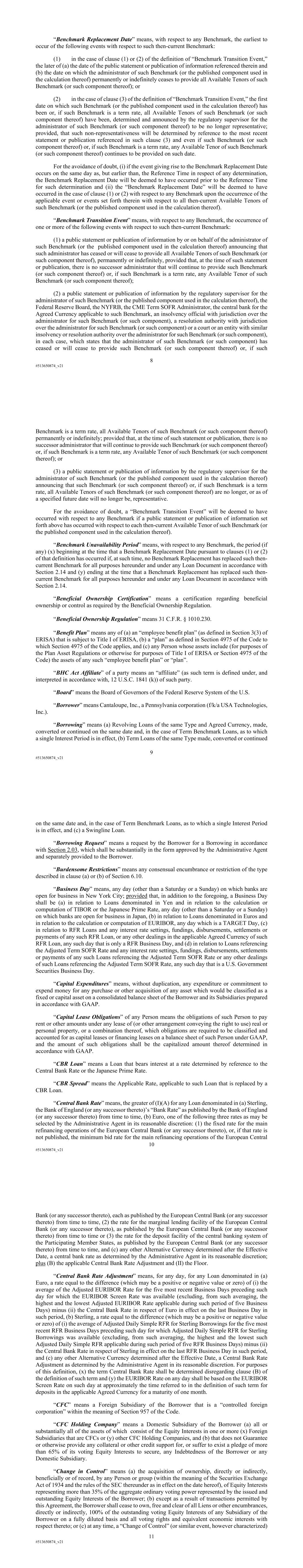 8 #513650874_v21 “Benchmark Replacement Date” means, with respect to any Benchmark, the earliest to occur of the following events with respect to such then-current Benchmark: (1) in the case of clause (1) or (2) of the definition of “Benchmark Transition Event,” the later of (a) the date of the public statement or publication of information referenced therein and (b) the date on which the administrator of such Benchmark (or the published component used in the calculation thereof) permanently or indefinitely ceases to provide all Available Tenors of such Benchmark (or such component thereof); or (2) in the case of clause (3) of the definition of “Benchmark Transition Event,” the first date on which such Benchmark (or the published component used in the calculation thereof) has been or, if such Benchmark is a term rate, all Available Tenors of such Benchmark (or such component thereof) have been, determined and announced by the regulatory supervisor for the administrator of such Benchmark (or such component thereof) to be no longer representative; provided, that such non-representativeness will be determined by reference to the most recent statement or publication referenced in such clause (3) and even if such Benchmark (or such component thereof) or, if such Benchmark is a term rate, any Available Tenor of such Benchmark (or such component thereof) continues to be provided on such date. For the avoidance of doubt, (i) if the event giving rise to the Benchmark Replacement Date occurs on the same day as, but earlier than, the Reference Time in respect of any determination, the Benchmark Replacement Date will be deemed to have occurred prior to the Reference Time for such determination and (ii) the “Benchmark Replacement Date” will be deemed to have occurred in the case of clause (1) or (2) with respect to any Benchmark upon the occurrence of the applicable event or events set forth therein with respect to all then-current Available Tenors of such Benchmark (or the published component used in the calculation thereof). “Benchmark Transition Event” means, with respect to any Benchmark, the occurrence of one or more of the following events with respect to such then-current Benchmark: (1) a public statement or publication of information by or on behalf of the administrator of such Benchmark (or the published component used in the calculation thereof) announcing that such administrator has ceased or will cease to provide all Available Tenors of such Benchmark (or such component thereof), permanently or indefinitely, provided that, at the time of such statement or publication, there is no successor administrator that will continue to provide such Benchmark (or such component thereof) or, if such Benchmark is a term rate, any Available Tenor of such Benchmark (or such component thereof); (2) a public statement or publication of information by the regulatory supervisor for the administrator of such Benchmark (or the published component used in the calculation thereof), the Federal Reserve Board, the NYFRB, the CME Term SOFR Administrator, the central bank for the Agreed Currency applicable to such Benchmark, an insolvency official with jurisdiction over the administrator for such Benchmark (or such component), a resolution authority with jurisdiction over the administrator for such Benchmark (or such component) or a court or an entity with similar insolvency or resolution authority over the administrator for such Benchmark (or such component), in each case, which states that the administrator of such Benchmark (or such component) has ceased or will cease to provide such Benchmark (or such component thereof) or, if such 9 #513650874_v21 Benchmark is a term rate, all Available Tenors of such Benchmark (or such component thereof) permanently or indefinitely; provided that, at the time of such statement or publication, there is no successor administrator that will continue to provide such Benchmark (or such component thereof) or, if such Benchmark is a term rate, any Available Tenor of such Benchmark (or such component thereof); or (3) a public statement or publication of information by the regulatory supervisor for the administrator of such Benchmark (or the published component used in the calculation thereof) announcing that such Benchmark (or such component thereof) or, if such Benchmark is a term rate, all Available Tenors of such Benchmark (or such component thereof) are no longer, or as of a specified future date will no longer be, representative. For the avoidance of doubt, a “Benchmark Transition Event” will be deemed to have occurred with respect to any Benchmark if a public statement or publication of information set forth above has occurred with respect to each then-current Available Tenor of such Benchmark (or the published component used in the calculation thereof). “Benchmark Unavailability Period” means, with respect to any Benchmark, the period (if any) (x) beginning at the time that a Benchmark Replacement Date pursuant to clauses (1) or (2) of that definition has occurred if, at such time, no Benchmark Replacement has replaced such then- current Benchmark for all purposes hereunder and under any Loan Document in accordance with Section 2.14 and (y) ending at the time that a Benchmark Replacement has replaced such then- current Benchmark for all purposes hereunder and under any Loan Document in accordance with Section 2.14. “Beneficial Ownership Certification” means a certification regarding beneficial ownership or control as required by the Beneficial Ownership Regulation. “Beneficial Ownership Regulation” means 31 C.F.R. § 1010.230. “Benefit Plan” means any of (a) an “employee benefit plan” (as defined in Section 3(3) of ERISA) that is subject to Title I of ERISA, (b) a “plan” as defined in Section 4975 of the Code to which Section 4975 of the Code applies, and (c) any Person whose assets include (for purposes of the Plan Asset Regulati