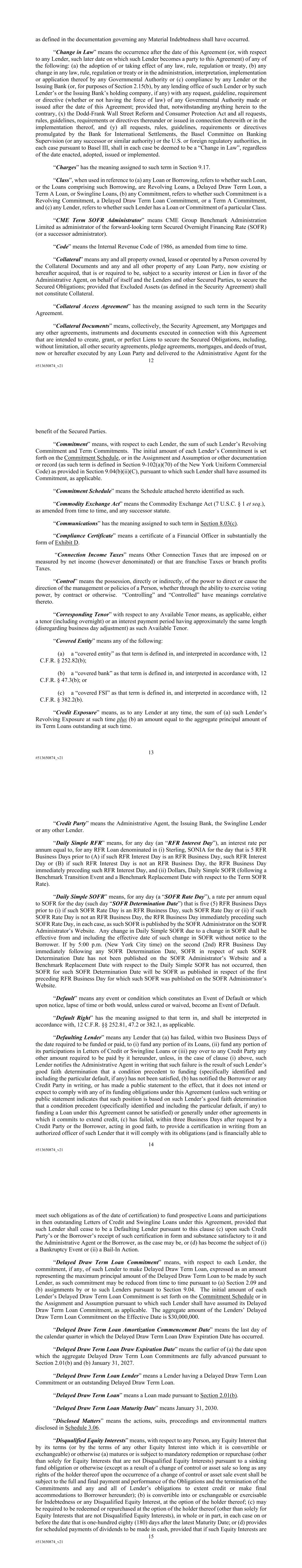 12 #513650874_v21 as defined in the documentation governing any Material Indebtedness shall have occurred. “Change in Law” means the occurrence after the date of this Agreement (or, with respect to any Lender, such later date on which such Lender becomes a party to this Agreement) of any of the following: (a) the adoption of or taking effect of any law, rule, regulation or treaty, (b) any change in any law, rule, regulation or treaty or in the administration, interpretation, implementation or application thereof by any Governmental Authority or (c) compliance by any Lender or the Issuing Bank (or, for purposes of Section 2.15(b), by any lending office of such Lender or by such Lender’s or the Issuing Bank’s holding company, if any) with any request, guideline, requirement or directive (whether or not having the force of law) of any Governmental Authority made or issued after the date of this Agreement; provided that, notwithstanding anything herein to the contrary, (x) the Dodd-Frank Wall Street Reform and Consumer Protection Act and all requests, rules, guidelines, requirements or directives thereunder or issued in connection therewith or in the implementation thereof, and (y) all requests, rules, guidelines, requirements or directives promulgated by the Bank for International Settlements, the Basel Committee on Banking Supervision (or any successor or similar authority) or the U.S. or foreign regulatory authorities, in each case pursuant to Basel III, shall in each case be deemed to be a “Change in Law”, regardless of the date enacted, adopted, issued or implemented. “Charges” has the meaning assigned to such term in Section 9.17. “Class”, when used in reference to (a) any Loan or Borrowing, refers to whether such Loan, or the Loans comprising such Borrowing, are Revolving Loans, a Delayed Draw Term Loan, a Term A Loan, or Swingline Loans, (b) any Commitment, refers to whether such Commitment is a Revolving Commitment, a Delayed Draw Term Loan Commitment, or a Term A Commitment, and (c) any Lender, refers to whether such Lender has a Loan or Commitment of a particular Class. “CME Term SOFR Administrator” means CME Group Benchmark Administration Limited as administrator of the forward-looking term Secured Overnight Financing Rate (SOFR) (or a successor administrator). “Code” means the Internal Revenue Code of 1986, as amended from time to time. “Collateral” means any and all property owned, leased or operated by a Person covered by the Collateral Documents and any and all other property of any Loan Party, now existing or hereafter acquired, that is or required to be, subject to a security interest or Lien in favor of the Administrative Agent, on behalf of itself and the Lenders and other Secured Parties, to secure the Secured Obligations; provided that Excluded Assets (as defined in the Security Agreement) shall not constitute Collateral. “Collateral Access Agreement” has the meaning assigned to such term in the Security Agreement. “Collateral Documents” means, collectively, the Security Agreement, any Mortgages and any other agreements, instruments and documents executed in connection with this Agreement that are intended to create, grant, or perfect Liens to secure the Secured Obligations, including, without limitation, all other security agreements, pledge agreements, mortgages, and deeds of trust, now or hereafter executed by any Loan Party and delivered to the Administrative Agent for the 13 #513650874_v21 benefit of the Secured Parties. “Commitment” means, with respect to each Lender, the sum of such Lender’s Revolving Commitment and Term Commitments. The initial amount of each Lender’s Commitment is set forth on the Commitment Schedule, or in the Assignment and Assumption or other documentation or record (as such term is defined in Section 9-102(a)(70) of the New York Uniform Commercial Code) as provided in Section 9.04(b)(ii)(C), pursuant to which such Lender shall have assumed its Commitment, as applicable. “Commitment Schedule” means the Schedule attached hereto identified as such. “Commodity Exchange Act” means the Commodity Exchange Act (7 U.S.C. § 1 et seq.), as amended from time to time, and any successor statute. “Communications” has the meaning assigned to such term in Section 8.03(c). “Compliance Certificate” means a certificate of a Financial Officer in substantially the form of Exhibit D. “Connection Income Taxes” means Other Connection Taxes that are imposed on or measured by net income (however denominated) or that are franchise Taxes or branch profits Taxes. “Control” means the possession, directly or indirectly, of the power to direct or cause the direction of the management or policies of a Person, whether through the ability to exercise voting power, by contract or otherwise. “Controlling” and “Controlled” have meanings correlative thereto. “Corresponding Tenor” with respect to any Available Tenor means, as applicable, either a tenor (including overnight) or an interest payment period having approximately the same length (disregarding business day adjustment) as such Available Tenor. “Covered Entity” means any of the following: (a) a “covered entity” as that term is defined in, and interpreted in accordance with, 12 C.F.R. § 252.82(b); (b) a “covered bank” as that term is defined in, and interpreted in accordance with, 12 C.F.R. § 47.3(b); or (c) a “covered FSI” as that term is defined in, and interpreted in accordance with, 12 C.F.R. § 382.2(b). “Credit Exposure” means, as to any Lender at any time, the sum of (a) such Lender’s Revolving Exposure at such time plus (b) an amount equal to the aggregate principal amount of its Term Loans outstanding at such time. 14 #513650874_v21 “Credit Party” means the Administrative Agent, the Issuing Bank, the Swingline Lender or any other Lender. “Daily Simple RFR” means, for any day (an “RFR Interest Day