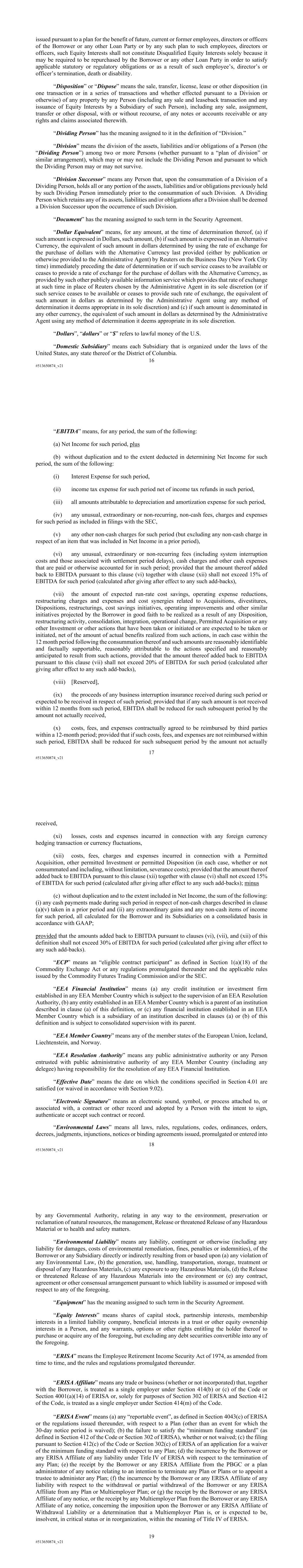 16 #513650874_v21 issued pursuant to a plan for the benefit of future, current or former employees, directors or officers of the Borrower or any other Loan Party or by any such plan to such employees, directors or officers, such Equity Interests shall not constitute Disqualified Equity Interests solely because it may be required to be repurchased by the Borrower or any other Loan Party in order to satisfy applicable statutory or regulatory obligations or as a result of such employee’s, director’s or officer’s termination, death or disability. “Disposition” or “Dispose” means the sale, transfer, license, lease or other disposition (in one transaction or in a series of transactions and whether effected pursuant to a Division or otherwise) of any property by any Person (including any sale and leaseback transaction and any issuance of Equity Interests by a Subsidiary of such Person), including any sale, assignment, transfer or other disposal, with or without recourse, of any notes or accounts receivable or any rights and claims associated therewith. “Dividing Person” has the meaning assigned to it in the definition of “Division.” “Division” means the division of the assets, liabilities and/or obligations of a Person (the “Dividing Person”) among two or more Persons (whether pursuant to a “plan of division” or similar arrangement), which may or may not include the Dividing Person and pursuant to which the Dividing Person may or may not survive. “Division Successor” means any Person that, upon the consummation of a Division of a Dividing Person, holds all or any portion of the assets, liabilities and/or obligations previously held by such Dividing Person immediately prior to the consummation of such Division. A Dividing Person which retains any of its assets, liabilities and/or obligations after a Division shall be deemed a Division Successor upon the occurrence of such Division. “Document” has the meaning assigned to such term in the Security Agreement. “Dollar Equivalent” means, for any amount, at the time of determination thereof, (a) if such amount is expressed in Dollars, such amount, (b) if such amount is expressed in an Alternative Currency, the equivalent of such amount in dollars determined by using the rate of exchange for the purchase of dollars with the Alternative Currency last provided (either by publication or otherwise provided to the Administrative Agent) by Reuters on the Business Day (New York City time) immediately preceding the date of determination or if such service ceases to be available or ceases to provide a rate of exchange for the purchase of dollars with the Alternative Currency, as provided by such other publicly available information service which provides that rate of exchange at such time in place of Reuters chosen by the Administrative Agent in its sole discretion (or if such service ceases to be available or ceases to provide such rate of exchange, the equivalent of such amount in dollars as determined by the Administrative Agent using any method of determination it deems appropriate in its sole discretion) and (c) if such amount is denominated in any other currency, the equivalent of such amount in dollars as determined by the Administrative Agent using any method of determination it deems appropriate in its sole discretion. “Dollars”, “dollars” or “$” refers to lawful money of the U.S. “Domestic Subsidiary” means each Subsidiary that is organized under the laws of the United States, any state thereof or the District of Columbia. 17 #513650874_v21 “EBITDA” means, for any period, the sum of the following: (a) Net Income for such period, plus (b) without duplication and to the extent deducted in determining Net Income for such period, the sum of the following: (i) Interest Expense for such period, (ii) income tax expense for such period net of income tax refunds in such period, (iii) all amounts attributable to depreciation and amortization expense for such period, (iv) any unusual, extraordinary or non-recurring, non-cash fees, charges and expenses for such period as included in filings with the SEC, (v) any other non-cash charges for such period (but excluding any non-cash charge in respect of an item that was included in Net Income in a prior period), (vi) any unusual, extraordinary or non-recurring fees (including system interruption costs and those associated with settlement period delays), cash charges and other cash expenses that are paid or otherwise accounted for in such period; provided that the amount thereof added back to EBITDA pursuant to this clause (vi) together with clause (xii) shall not exceed 15% of EBITDA for such period (calculated after giving after effect to any such add-backs), (vii) the amount of expected run-rate cost savings, operating expense reductions, restructuring charges and expenses and cost synergies related to Acquisitions, divestitures, Dispositions, restructurings, cost savings initiatives, operating improvements and other similar initiatives projected by the Borrower in good faith to be realized as a result of any Disposition, restructuring activity, consolidation, integration, operational change, Permitted Acquisition or any other Investment or other actions that have been taken or initiated or are expected to be taken or initiated, net of the amount of actual benefits realized from such actions, in each case within the 12 month period following the consummation thereof and such amounts are reasonably identifiable and factually supportable, reasonably attributable to the actions specified and reasonably anticipated to result from such actions, provided that the amount thereof added back to EBITDA pursuant to this clause (vii) shall not exceed 20% of EBITDA for such period (calculated after giving after effect to any such add-backs), (viii) [Reserved], (ix) the proceeds of any business interruption insurance received during such period or expected to be re