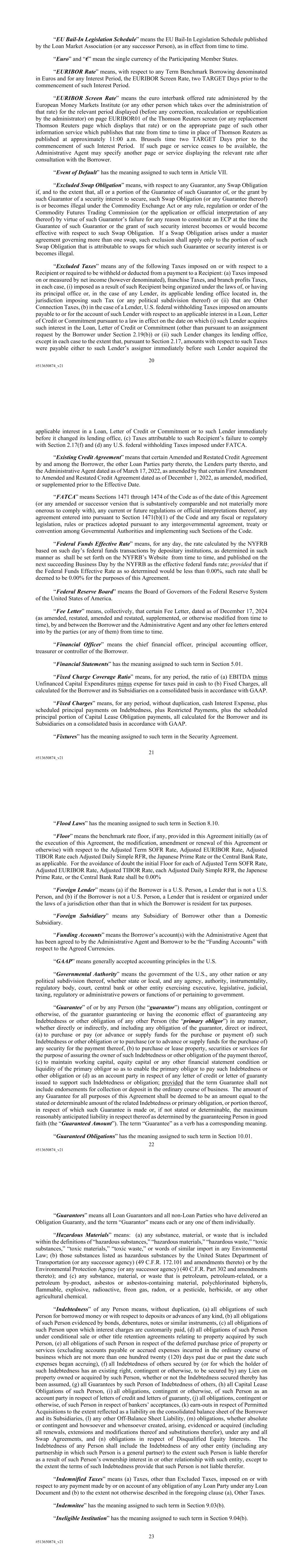 20 #513650874_v21 “EU Bail-In Legislation Schedule” means the EU Bail-In Legislation Schedule published by the Loan Market Association (or any successor Person), as in effect from time to time. “Euro” and “€” mean the single currency of the Participating Member States. “EURIBOR Rate” means, with respect to any Term Benchmark Borrowing denominated in Euros and for any Interest Period, the EURIBOR Screen Rate, two TARGET Days prior to the commencement of such Interest Period. “EURIBOR Screen Rate” means the euro interbank offered rate administered by the European Money Markets Institute (or any other person which takes over the administration of that rate) for the relevant period displayed (before any correction, recalculation or republication by the administrator) on page EURIBOR01 of the Thomson Reuters screen (or any replacement Thomson Reuters page which displays that rate) or on the appropriate page of such other information service which publishes that rate from time to time in place of Thomson Reuters as published at approximately 11:00 a.m. Brussels time two TARGET Days prior to the commencement of such Interest Period. If such page or service ceases to be available, the Administrative Agent may specify another page or service displaying the relevant rate after consultation with the Borrower. “Event of Default” has the meaning assigned to such term in Article VII. “Excluded Swap Obligation” means, with respect to any Guarantor, any Swap Obligation if, and to the extent that, all or a portion of the Guarantee of such Guarantor of, or the grant by such Guarantor of a security interest to secure, such Swap Obligation (or any Guarantee thereof) is or becomes illegal under the Commodity Exchange Act or any rule, regulation or order of the Commodity Futures Trading Commission (or the application or official interpretation of any thereof) by virtue of such Guarantor’s failure for any reason to constitute an ECP at the time the Guarantee of such Guarantor or the grant of such security interest becomes or would become effective with respect to such Swap Obligation. If a Swap Obligation arises under a master agreement governing more than one swap, such exclusion shall apply only to the portion of such Swap Obligation that is attributable to swaps for which such Guarantee or security interest is or becomes illegal. “Excluded Taxes” means any of the following Taxes imposed on or with respect to a Recipient or required to be withheld or deducted from a payment to a Recipient: (a) Taxes imposed on or measured by net income (however denominated), franchise Taxes, and branch profits Taxes, in each case, (i) imposed as a result of such Recipient being organized under the laws of, or having its principal office or, in the case of any Lender, its applicable lending office located in, the jurisdiction imposing such Tax (or any political subdivision thereof) or (ii) that are Other Connection Taxes, (b) in the case of a Lender, U.S. federal withholding Taxes imposed on amounts payable to or for the account of such Lender with respect to an applicable interest in a Loan, Letter of Credit or Commitment pursuant to a law in effect on the date on which (i) such Lender acquires such interest in the Loan, Letter of Credit or Commitment (other than pursuant to an assignment request by the Borrower under Section 2.19(b)) or (ii) such Lender changes its lending office, except in each case to the extent that, pursuant to Section 2.17, amounts with respect to such Taxes were payable either to such Lender’s assignor immediately before such Lender acquired the 21 #513650874_v21 applicable interest in a Loan, Letter of Credit or Commitment or to such Lender immediately before it changed its lending office, (c) Taxes attributable to such Recipient’s failure to comply with Section 2.17(f) and (d) any U.S. federal withholding Taxes imposed under FATCA. “Existing Credit Agreement” means that certain Amended and Restated Credit Agreement by and among the Borrower, the other Loan Parties party thereto, the Lenders party thereto, and the Administrative Agent dated as of March 17, 2022, as amended by that certain First Amendment to Amended and Restated Credit Agreement dated as of December 1, 2022, as amended, modified, or supplemented prior to the Effective Date. “FATCA” means Sections 1471 through 1474 of the Code as of the date of this Agreement (or any amended or successor version that is substantively comparable and not materially more onerous to comply with), any current or future regulations or official interpretations thereof, any agreement entered into pursuant to Section 1471(b)(1) of the Code and any fiscal or regulatory legislation, rules or practices adopted pursuant to any intergovernmental agreement, treaty or convention among Governmental Authorities and implementing such Sections of the Code. “Federal Funds Effective Rate” means, for any day, the rate calculated by the NYFRB based on such day’s federal funds transactions by depositary institutions, as determined in such manner as shall be set forth on the NYFRB’s Website from time to time, and published on the next succeeding Business Day by the NYFRB as the effective federal funds rate; provided that if the Federal Funds Effective Rate as so determined would be less than 0.00%, such rate shall be deemed to be 0.00% for the purposes of this Agreement. “Federal Reserve Board” means the Board of Governors of the Federal Reserve System of the United States of America. “Fee Letter” means, collectively, that certain Fee Letter, dated as of December 17, 2024 (as amended, restated, amended and restated, supplemented, or otherwise modified from time to time), by and between the Borrower and the Administrative Agent and any other fee letters entered into by the parties (or any of them) from time to time. “Financial Officer” means the chief financial officer, principal accounting officer, treasurer or