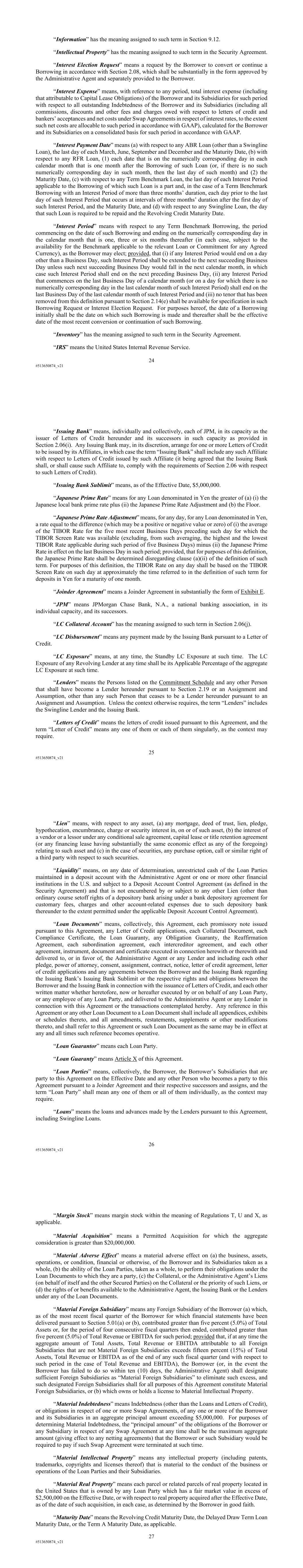 24 #513650874_v21 “Information” has the meaning assigned to such term in Section 9.12. “Intellectual Property” has the meaning assigned to such term in the Security Agreement. “Interest Election Request” means a request by the Borrower to convert or continue a Borrowing in accordance with Section 2.08, which shall be substantially in the form approved by the Administrative Agent and separately provided to the Borrower. “Interest Expense” means, with reference to any period, total interest expense (including that attributable to Capital Lease Obligations) of the Borrower and its Subsidiaries for such period with respect to all outstanding Indebtedness of the Borrower and its Subsidiaries (including all commissions, discounts and other fees and charges owed with respect to letters of credit and bankers’ acceptances and net costs under Swap Agreements in respect of interest rates, to the extent such net costs are allocable to such period in accordance with GAAP), calculated for the Borrower and its Subsidiaries on a consolidated basis for such period in accordance with GAAP. “Interest Payment Date” means (a) with respect to any ABR Loan (other than a Swingline Loan), the last day of each March, June, September and December and the Maturity Date, (b) with respect to any RFR Loan, (1) each date that is on the numerically corresponding day in each calendar month that is one month after the Borrowing of such Loan (or, if there is no such numerically corresponding day in such month, then the last day of such month) and (2) the Maturity Date, (c) with respect to any Term Benchmark Loan, the last day of each Interest Period applicable to the Borrowing of which such Loan is a part and, in the case of a Term Benchmark Borrowing with an Interest Period of more than three months’ duration, each day prior to the last day of such Interest Period that occurs at intervals of three months’ duration after the first day of such Interest Period, and the Maturity Date, and (d) with respect to any Swingline Loan, the day that such Loan is required to be repaid and the Revolving Credit Maturity Date. “Interest Period” means with respect to any Term Benchmark Borrowing, the period commencing on the date of such Borrowing and ending on the numerically corresponding day in the calendar month that is one, three or six months thereafter (in each case, subject to the availability for the Benchmark applicable to the relevant Loan or Commitment for any Agreed Currency), as the Borrower may elect; provided, that (i) if any Interest Period would end on a day other than a Business Day, such Interest Period shall be extended to the next succeeding Business Day unless such next succeeding Business Day would fall in the next calendar month, in which case such Interest Period shall end on the next preceding Business Day, (ii) any Interest Period that commences on the last Business Day of a calendar month (or on a day for which there is no numerically corresponding day in the last calendar month of such Interest Period) shall end on the last Business Day of the last calendar month of such Interest Period and (iii) no tenor that has been removed from this definition pursuant to Section 2.14(e) shall be available for specification in such Borrowing Request or Interest Election Request. For purposes hereof, the date of a Borrowing initially shall be the date on which such Borrowing is made and thereafter shall be the effective date of the most recent conversion or continuation of such Borrowing. “Inventory” has the meaning assigned to such term in the Security Agreement. “IRS” means the United States Internal Revenue Service. 25 #513650874_v21 “Issuing Bank” means, individually and collectively, each of JPM, in its capacity as the issuer of Letters of Credit hereunder and its successors in such capacity as provided in Section 2.06(i). Any Issuing Bank may, in its discretion, arrange for one or more Letters of Credit to be issued by its Affiliates, in which case the term “Issuing Bank” shall include any such Affiliate with respect to Letters of Credit issued by such Affiliate (it being agreed that the Issuing Bank shall, or shall cause such Affiliate to, comply with the requirements of Section 2.06 with respect to such Letters of Credit). “Issuing Bank Sublimit” means, as of the Effective Date, $5,000,000. “Japanese Prime Rate” means for any Loan denominated in Yen the greater of (a) (i) the Japanese local bank prime rate plus (ii) the Japanese Prime Rate Adjustment and (b) the Floor. “Japanese Prime Rate Adjustment” means, for any day, for any Loan denominated in Yen, a rate equal to the difference (which may be a positive or negative value or zero) of (i) the average of the TIBOR Rate for the five most recent Business Days preceding such day for which the TIBOR Screen Rate was available (excluding, from such averaging, the highest and the lowest TIBOR Rate applicable during such period of five Business Days) minus (ii) the Japanese Prime Rate in effect on the last Business Day in such period; provided, that for purposes of this definition, the Japanese Prime Rate shall be determined disregarding clause (a)(ii) of the definition of such term. For purposes of this definition, the TIBOR Rate on any day shall be based on the TIBOR Screen Rate on such day at approximately the time referred to in the definition of such term for deposits in Yen for a maturity of one month. “Joinder Agreement” means a Joinder Agreement in substantially the form of Exhibit E. “JPM” means JPMorgan Chase Bank, N.A., a national banking association, in its individual capacity, and its successors. “LC Collateral Account” has the meaning assigned to such term in Section 2.06(j). “LC Disbursement” means any payment made by the Issuing Bank pursuant to a Letter of Credit. “LC Exposure” means, at any time, the Standby LC Exposure at such time. The LC Exposure of any Revolving Lender at a