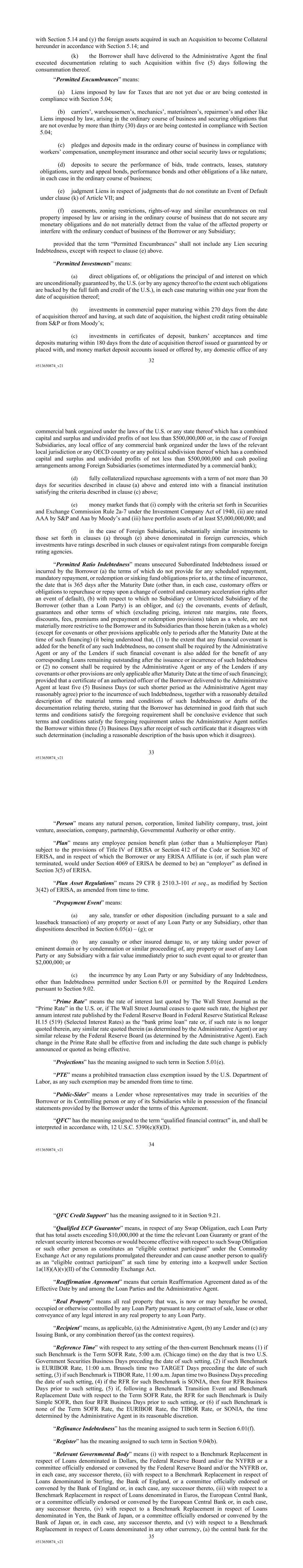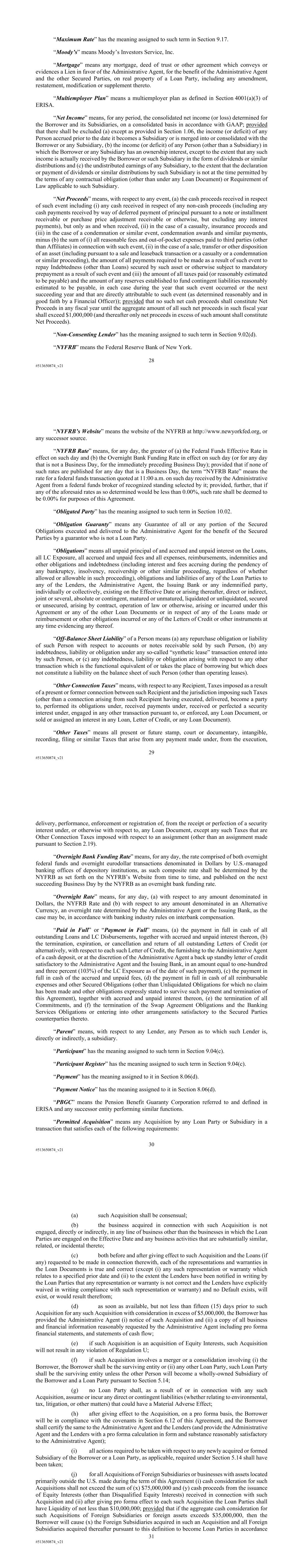 28 #513650874_v21 “Maximum Rate” has the meaning assigned to such term in Section 9.17. “Moody’s” means Moody’s Investors Service, Inc. “Mortgage” means any mortgage, deed of trust or other agreement which conveys or evidences a Lien in favor of the Administrative Agent, for the benefit of the Administrative Agent and the other Secured Parties, on real property of a Loan Party, including any amendment, restatement, modification or supplement thereto. “Multiemployer Plan” means a multiemployer plan as defined in Section 4001(a)(3) of ERISA. “Net Income” means, for any period, the consolidated net income (or loss) determined for the Borrower and its Subsidiaries, on a consolidated basis in accordance with GAAP; provided that there shall be excluded (a) except as provided in Section 1.06, the income (or deficit) of any Person accrued prior to the date it becomes a Subsidiary or is merged into or consolidated with the Borrower or any Subsidiary, (b) the income (or deficit) of any Person (other than a Subsidiary) in which the Borrower or any Subsidiary has an ownership interest, except to the extent that any such income is actually received by the Borrower or such Subsidiary in the form of dividends or similar distributions and (c) the undistributed earnings of any Subsidiary, to the extent that the declaration or payment of dividends or similar distributions by such Subsidiary is not at the time permitted by the terms of any contractual obligation (other than under any Loan Document) or Requirement of Law applicable to such Subsidiary. “Net Proceeds” means, with respect to any event, (a) the cash proceeds received in respect of such event including (i) any cash received in respect of any non-cash proceeds (including any cash payments received by way of deferred payment of principal pursuant to a note or installment receivable or purchase price adjustment receivable or otherwise, but excluding any interest payments), but only as and when received, (ii) in the case of a casualty, insurance proceeds and (iii) in the case of a condemnation or similar event, condemnation awards and similar payments, minus (b) the sum of (i) all reasonable fees and out-of-pocket expenses paid to third parties (other than Affiliates) in connection with such event, (ii) in the case of a sale, transfer or other disposition of an asset (including pursuant to a sale and leaseback transaction or a casualty or a condemnation or similar proceeding), the amount of all payments required to be made as a result of such event to repay Indebtedness (other than Loans) secured by such asset or otherwise subject to mandatory prepayment as a result of such event and (iii) the amount of all taxes paid (or reasonably estimated to be payable) and the amount of any reserves established to fund contingent liabilities reasonably estimated to be payable, in each case during the year that such event occurred or the next succeeding year and that are directly attributable to such event (as determined reasonably and in good faith by a Financial Officer)); provided that no such net cash proceeds shall constitute Net Proceeds in any fiscal year until the aggregate amount of all such net proceeds in such fiscal year shall exceed $1,000,000 (and thereafter only net proceeds in excess of such amount shall constitute Net Proceeds). “Non-Consenting Lender” has the meaning assigned to such term in Section 9.02(d). “NYFRB” means the Federal Reserve Bank of New York. 29 #513650874_v21 “NYFRB’s Website” means the website of the NYFRB at http://www.newyorkfed.org, or any successor source. “NYFRB Rate” means, for any day, the greater of (a) the Federal Funds Effective Rate in effect on such day and (b) the Overnight Bank Funding Rate in effect on such day (or for any day that is not a Business Day, for the immediately preceding Business Day); provided that if none of such rates are published for any day that is a Business Day, the term “NYFRB Rate” means the rate for a federal funds transaction quoted at 11:00 a.m. on such day received by the Administrative Agent from a federal funds broker of recognized standing selected by it; provided, further, that if any of the aforesaid rates as so determined would be less than 0.00%, such rate shall be deemed to be 0.00% for purposes of this Agreement. “Obligated Party” has the meaning assigned to such term in Section 10.02. “Obligation Guaranty” means any Guarantee of all or any portion of the Secured Obligations executed and delivered to the Administrative Agent for the benefit of the Secured Parties by a guarantor who is not a Loan Party. “Obligations” means all unpaid principal of and accrued and unpaid interest on the Loans, all LC Exposure, all accrued and unpaid fees and all expenses, reimbursements, indemnities and other obligations and indebtedness (including interest and fees accruing during the pendency of any bankruptcy, insolvency, receivership or other similar proceeding, regardless of whether allowed or allowable in such proceeding), obligations and liabilities of any of the Loan Parties to any of the Lenders, the Administrative Agent, the Issuing Bank or any indemnified party, individually or collectively, existing on the Effective Date or arising thereafter, direct or indirect, joint or several, absolute or contingent, matured or unmatured, liquidated or unliquidated, secured or unsecured, arising by contract, operation of law or otherwise, arising or incurred under this Agreement or any of the other Loan Documents or in respect of any of the Loans made or reimbursement or other obligations incurred or any of the Letters of Credit or other instruments at any time evidencing any thereof. “Off-Balance Sheet Liability” of a Person means (a) any repurchase obligation or liability of such Person with respect to accounts or notes receivable sold by such Person, (b) any indebtedness, liability or obligation under any so-called “synthetic 
