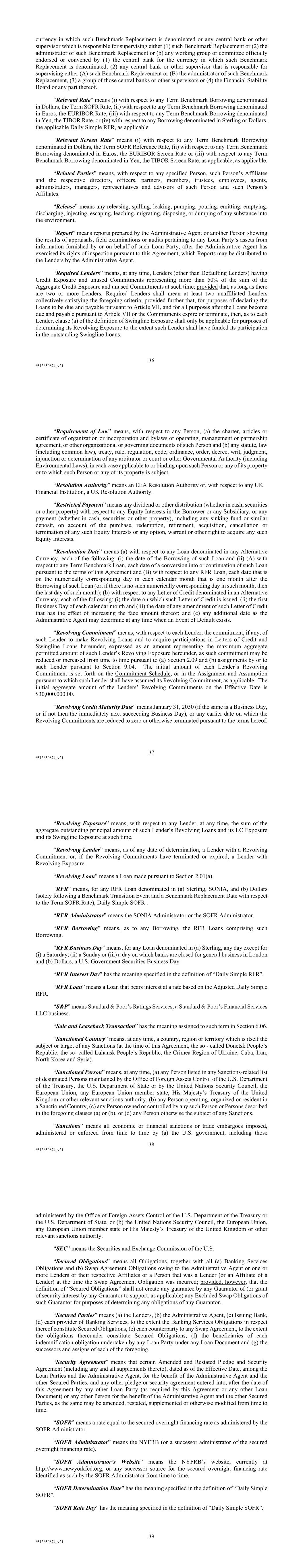 36 #513650874_v21 currency in which such Benchmark Replacement is denominated or any central bank or other supervisor which is responsible for supervising either (1) such Benchmark Replacement or (2) the administrator of such Benchmark Replacement or (b) any working group or committee officially endorsed or convened by (1) the central bank for the currency in which such Benchmark Replacement is denominated, (2) any central bank or other supervisor that is responsible for supervising either (A) such Benchmark Replacement or (B) the administrator of such Benchmark Replacement, (3) a group of those central banks or other supervisors or (4) the Financial Stability Board or any part thereof. “Relevant Rate” means (i) with respect to any Term Benchmark Borrowing denominated in Dollars, the Term SOFR Rate, (ii) with respect to any Term Benchmark Borrowing denominated in Euros, the EURIBOR Rate, (iii) with respect to any Term Benchmark Borrowing denominated in Yen, the TIBOR Rate, or (iv) with respect to any Borrowing denominated in Sterling or Dollars, the applicable Daily Simple RFR, as applicable. “Relevant Screen Rate” means (i) with respect to any Term Benchmark Borrowing denominated in Dollars, the Term SOFR Reference Rate, (ii) with respect to any Term Benchmark Borrowing denominated in Euros, the EURIBOR Screen Rate or (iii) with respect to any Term Benchmark Borrowing denominated in Yen, the TIBOR Screen Rate, as applicable, as applicable. “Related Parties” means, with respect to any specified Person, such Person’s Affiliates and the respective directors, officers, partners, members, trustees, employees, agents, administrators, managers, representatives and advisors of such Person and such Person’s Affiliates. “Release” means any releasing, spilling, leaking, pumping, pouring, emitting, emptying, discharging, injecting, escaping, leaching, migrating, disposing, or dumping of any substance into the environment. “Report” means reports prepared by the Administrative Agent or another Person showing the results of appraisals, field examinations or audits pertaining to any Loan Party’s assets from information furnished by or on behalf of such Loan Party, after the Administrative Agent has exercised its rights of inspection pursuant to this Agreement, which Reports may be distributed to the Lenders by the Administrative Agent. “Required Lenders” means, at any time, Lenders (other than Defaulting Lenders) having Credit Exposure and unused Commitments representing more than 50% of the sum of the Aggregate Credit Exposure and unused Commitments at such time; provided that, as long as there are two or more Lenders, Required Lenders shall mean at least two unaffiliated Lenders collectively satisfying the foregoing criteria; provided further that, for purposes of declaring the Loans to be due and payable pursuant to Article VII, and for all purposes after the Loans become due and payable pursuant to Article VII or the Commitments expire or terminate, then, as to each Lender, clause (a) of the definition of Swingline Exposure shall only be applicable for purposes of determining its Revolving Exposure to the extent such Lender shall have funded its participation in the outstanding Swingline Loans. 37 #513650874_v21 “Requirement of Law” means, with respect to any Person, (a) the charter, articles or certificate of organization or incorporation and bylaws or operating, management or partnership agreement, or other organizational or governing documents of such Person and (b) any statute, law (including common law), treaty, rule, regulation, code, ordinance, order, decree, writ, judgment, injunction or determination of any arbitrator or court or other Governmental Authority (including Environmental Laws), in each case applicable to or binding upon such Person or any of its property or to which such Person or any of its property is subject. “Resolution Authority” means an EEA Resolution Authority or, with respect to any UK Financial Institution, a UK Resolution Authority. “Restricted Payment” means any dividend or other distribution (whether in cash, securities or other property) with respect to any Equity Interests in the Borrower or any Subsidiary, or any payment (whether in cash, securities or other property), including any sinking fund or similar deposit, on account of the purchase, redemption, retirement, acquisition, cancellation or termination of any such Equity Interests or any option, warrant or other right to acquire any such Equity Interests. “Revaluation Date” means (a) with respect to any Loan denominated in any Alternative Currency, each of the following: (i) the date of the Borrowing of such Loan and (ii) (A) with respect to any Term Benchmark Loan, each date of a conversion into or continuation of such Loan pursuant to the terms of this Agreement and (B) with respect to any RFR Loan, each date that is on the numerically corresponding day in each calendar month that is one month after the Borrowing of such Loan (or, if there is no such numerically corresponding day in such month, then the last day of such month); (b) with respect to any Letter of Credit denominated in an Alternative Currency, each of the following: (i) the date on which such Letter of Credit is issued, (ii) the first Business Day of each calendar month and (iii) the date of any amendment of such Letter of Credit that has the effect of increasing the face amount thereof; and (c) any additional date as the Administrative Agent may determine at any time when an Event of Default exists. “Revolving Commitment” means, with respect to each Lender, the commitment, if any, of such Lender to make Revolving Loans and to acquire participations in Letters of Credit and Swingline Loans hereunder, expressed as an amount representing the maximum aggregate permitted amount of such Lender’s Revolving Exposure hereunder, as such commitment may be reduced or increased from time to time pursuan