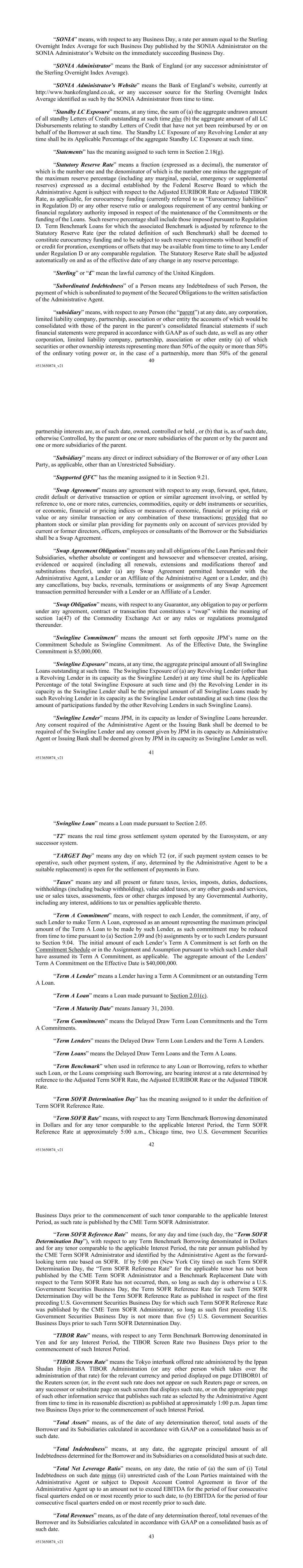 40 #513650874_v21 “SONIA” means, with respect to any Business Day, a rate per annum equal to the Sterling Overnight Index Average for such Business Day published by the SONIA Administrator on the SONIA Administrator’s Website on the immediately succeeding Business Day. “SONIA Administrator” means the Bank of England (or any successor administrator of the Sterling Overnight Index Average). “SONIA Administrator’s Website” means the Bank of England’s website, currently at http://www.bankofengland.co.uk, or any successor source for the Sterling Overnight Index Average identified as such by the SONIA Administrator from time to time. “Standby LC Exposure” means, at any time, the sum of (a) the aggregate undrawn amount of all standby Letters of Credit outstanding at such time plus (b) the aggregate amount of all LC Disbursements relating to standby Letters of Credit that have not yet been reimbursed by or on behalf of the Borrower at such time. The Standby LC Exposure of any Revolving Lender at any time shall be its Applicable Percentage of the aggregate Standby LC Exposure at such time. “Statements” has the meaning assigned to such term in Section 2.18(g). “Statutory Reserve Rate” means a fraction (expressed as a decimal), the numerator of which is the number one and the denominator of which is the number one minus the aggregate of the maximum reserve percentage (including any marginal, special, emergency or supplemental reserves) expressed as a decimal established by the Federal Reserve Board to which the Administrative Agent is subject with respect to the Adjusted EURIBOR Rate or Adjusted TIBOR Rate, as applicable, for eurocurrency funding (currently referred to as “Eurocurrency liabilities” in Regulation D) or any other reserve ratio or analogous requirement of any central banking or financial regulatory authority imposed in respect of the maintenance of the Commitments or the funding of the Loans. Such reserve percentage shall include those imposed pursuant to Regulation D. Term Benchmark Loans for which the associated Benchmark is adjusted by reference to the Statutory Reserve Rate (per the related definition of such Benchmark) shall be deemed to constitute eurocurrency funding and to be subject to such reserve requirements without benefit of or credit for proration, exemptions or offsets that may be available from time to time to any Lender under Regulation D or any comparable regulation. The Statutory Reserve Rate shall be adjusted automatically on and as of the effective date of any change in any reserve percentage. “Sterling” or “£” mean the lawful currency of the United Kingdom. “Subordinated Indebtedness” of a Person means any Indebtedness of such Person, the payment of which is subordinated to payment of the Secured Obligations to the written satisfaction of the Administrative Agent. “subsidiary” means, with respect to any Person (the “parent”) at any date, any corporation, limited liability company, partnership, association or other entity the accounts of which would be consolidated with those of the parent in the parent’s consolidated financial statements if such financial statements were prepared in accordance with GAAP as of such date, as well as any other corporation, limited liability company, partnership, association or other entity (a) of which securities or other ownership interests representing more than 50% of the equity or more than 50% of the ordinary voting power or, in the case of a partnership, more than 50% of the general 41 #513650874_v21 partnership interests are, as of such date, owned, controlled or held , or (b) that is, as of such date, otherwise Controlled, by the parent or one or more subsidiaries of the parent or by the parent and one or more subsidiaries of the parent. “Subsidiary” means any direct or indirect subsidiary of the Borrower or of any other Loan Party, as applicable, other than an Unrestricted Subsidiary. “Supported QFC” has the meaning assigned to it in Section 9.21. “Swap Agreement” means any agreement with respect to any swap, forward, spot, future, credit default or derivative transaction or option or similar agreement involving, or settled by reference to, one or more rates, currencies, commodities, equity or debt instruments or securities, or economic, financial or pricing indices or measures of economic, financial or pricing risk or value or any similar transaction or any combination of these transactions; provided that no phantom stock or similar plan providing for payments only on account of services provided by current or former directors, officers, employees or consultants of the Borrower or the Subsidiaries shall be a Swap Agreement. “Swap Agreement Obligations” means any and all obligations of the Loan Parties and their Subsidiaries, whether absolute or contingent and howsoever and whensoever created, arising, evidenced or acquired (including all renewals, extensions and modifications thereof and substitutions therefor), under (a) any Swap Agreement permitted hereunder with the Administrative Agent, a Lender or an Affiliate of the Administrative Agent or a Lender, and (b) any cancellations, buy backs, reversals, terminations or assignments of any Swap Agreement transaction permitted hereunder with a Lender or an Affiliate of a Lender. “Swap Obligation” means, with respect to any Guarantor, any obligation to pay or perform under any agreement, contract or transaction that constitutes a “swap” within the meaning of section 1a(47) of the Commodity Exchange Act or any rules or regulations promulgated thereunder. “Swingline Commitment” means the amount set forth opposite JPM’s name on the Commitment Schedule as Swingline Commitment. As of the Effective Date, the Swingline Commitment is $5,000,000. “Swingline Exposure” means, at any time, the aggregate principal amount of all Swingline Loans outstanding at such time. The Swingline Exposure of (a) 