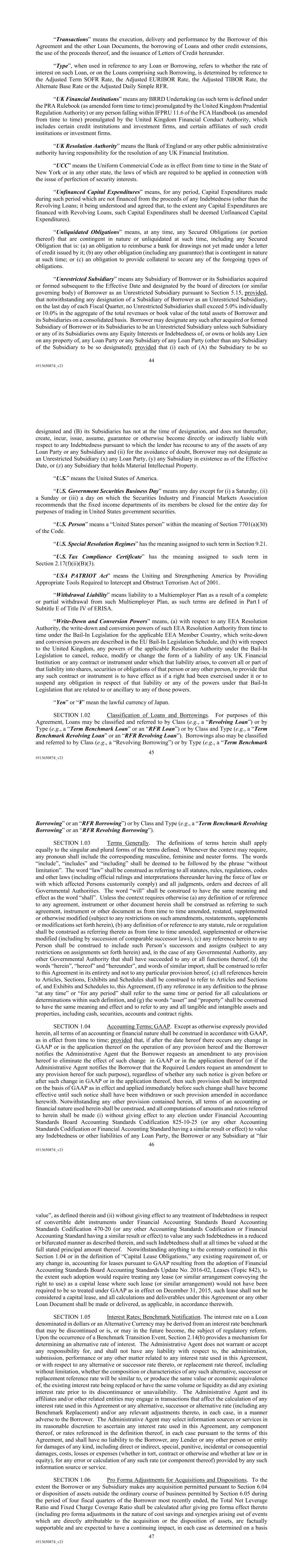 44 #513650874_v21 “Transactions” means the execution, delivery and performance by the Borrower of this Agreement and the other Loan Documents, the borrowing of Loans and other credit extensions, the use of the proceeds thereof, and the issuance of Letters of Credit hereunder. “Type”, when used in reference to any Loan or Borrowing, refers to whether the rate of interest on such Loan, or on the Loans comprising such Borrowing, is determined by reference to the Adjusted Term SOFR Rate, the Adjusted EURIBOR Rate, the Adjusted TIBOR Rate, the Alternate Base Rate or the Adjusted Daily Simple RFR. “UK Financial Institutions” means any BRRD Undertaking (as such term is defined under the PRA Rulebook (as amended form time to time) promulgated by the United Kingdom Prudential Regulation Authority) or any person falling within IFPRU 11.6 of the FCA Handbook (as amended from time to time) promulgated by the United Kingdom Financial Conduct Authority, which includes certain credit institutions and investment firms, and certain affiliates of such credit institutions or investment firms. “UK Resolution Authority” means the Bank of England or any other public administrative authority having responsibility for the resolution of any UK Financial Institution. “UCC” means the Uniform Commercial Code as in effect from time to time in the State of New York or in any other state, the laws of which are required to be applied in connection with the issue of perfection of security interests. “Unfinanced Capital Expenditures” means, for any period, Capital Expenditures made during such period which are not financed from the proceeds of any Indebtedness (other than the Revolving Loans; it being understood and agreed that, to the extent any Capital Expenditures are financed with Revolving Loans, such Capital Expenditures shall be deemed Unfinanced Capital Expenditures). “Unliquidated Obligations” means, at any time, any Secured Obligations (or portion thereof) that are contingent in nature or unliquidated at such time, including any Secured Obligation that is: (a) an obligation to reimburse a bank for drawings not yet made under a letter of credit issued by it; (b) any other obligation (including any guarantee) that is contingent in nature at such time; or (c) an obligation to provide collateral to secure any of the foregoing types of obligations. “Unrestricted Subsidiary” means any Subsidiary of Borrower or its Subsidiaries acquired or formed subsequent to the Effective Date and designated by the board of directors (or similar governing body) of Borrower as an Unrestricted Subsidiary pursuant to Section 5.15, provided, that notwithstanding any designation of a Subsidiary of Borrower as an Unrestricted Subsidiary, on the last day of each Fiscal Quarter, no Unrestricted Subsidiaries shall exceed 5.0% individually or 10.0% in the aggregate of the total revenues or book value of the total assets of Borrower and its Subsidiaries on a consolidated basis. Borrower may designate any such after acquired or formed Subsidiary of Borrower or its Subsidiaries to be an Unrestricted Subsidiary unless such Subsidiary or any of its Subsidiaries owns any Equity Interests or Indebtedness of, or owns or holds any Lien on any property of, any Loan Party or any Subsidiary of any Loan Party (other than any Subsidiary of the Subsidiary to be so designated); provided that (i) each of (A) the Subsidiary to be so 45 #513650874_v21 designated and (B) its Subsidiaries has not at the time of designation, and does not thereafter, create, incur, issue, assume, guarantee or otherwise become directly or indirectly liable with respect to any Indebtedness pursuant to which the lender has recourse to any of the assets of any Loan Party or any Subsidiary and (ii) for the avoidance of doubt, Borrower may not designate as an Unrestricted Subsidiary (x) any Loan Party, (y) any Subsidiary in existence as of the Effective Date, or (z) any Subsidiary that holds Material Intellectual Property. “U.S.” means the United States of America. “U.S. Government Securities Business Day” means any day except for (i) a Saturday, (ii) a Sunday or (iii) a day on which the Securities Industry and Financial Markets Association recommends that the fixed income departments of its members be closed for the entire day for purposes of trading in United States government securities. “U.S. Person” means a “United States person” within the meaning of Section 7701(a)(30) of the Code. “U.S. Special Resolution Regimes” has the meaning assigned to such term in Section 9.21. “U.S. Tax Compliance Certificate” has the meaning assigned to such term in Section 2.17(f)(ii)(B)(3). “USA PATRIOT Act” means the Uniting and Strengthening America by Providing Appropriate Tools Required to Intercept and Obstruct Terrorism Act of 2001. “Withdrawal Liability” means liability to a Multiemployer Plan as a result of a complete or partial withdrawal from such Multiemployer Plan, as such terms are defined in Part I of Subtitle E of Title IV of ERISA. “Write-Down and Conversion Powers” means, (a) with respect to any EEA Resolution Authority, the write-down and conversion powers of such EEA Resolution Authority from time to time under the Bail-In Legislation for the applicable EEA Member Country, which write-down and conversion powers are described in the EU Bail-In Legislation Schedule, and (b) with respect to the United Kingdom, any powers of the applicable Resolution Authority under the Bail-In Legislation to cancel, reduce, modify or change the form of a liability of any UK Financial Institution or any contract or instrument under which that liability arises, to convert all or part of that liability into shares, securities or obligations of that person or any other person, to provide that any such contract or instrument is to have effect as if a right had been exercised under it or to suspend any obligation in respect of that liability 