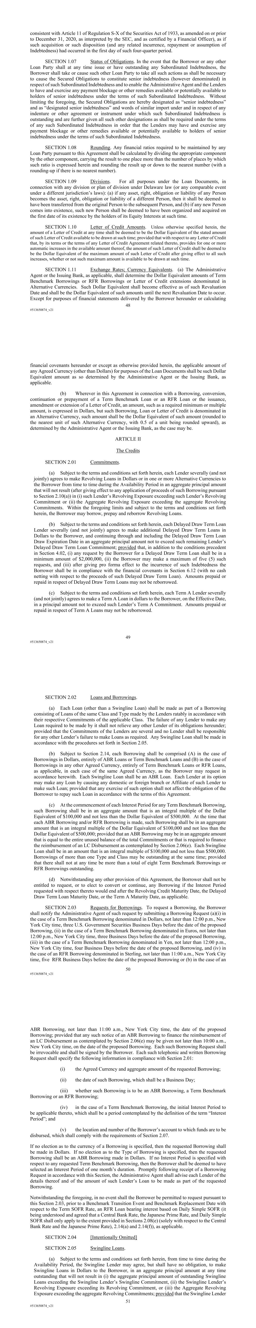 48 #513650874_v21 consistent with Article 11 of Regulation S-X of the Securities Act of 1933, as amended on or prior to December 31, 2020, as interpreted by the SEC, and as certified by a Financial Officer), as if such acquisition or such disposition (and any related incurrence, repayment or assumption of Indebtedness) had occurred in the first day of such four-quarter period. SECTION 1.07 Status of Obligations. In the event that the Borrower or any other Loan Party shall at any time issue or have outstanding any Subordinated Indebtedness, the Borrower shall take or cause such other Loan Party to take all such actions as shall be necessary to cause the Secured Obligations to constitute senior indebtedness (however denominated) in respect of such Subordinated Indebtedness and to enable the Administrative Agent and the Lenders to have and exercise any payment blockage or other remedies available or potentially available to holders of senior indebtedness under the terms of such Subordinated Indebtedness. Without limiting the foregoing, the Secured Obligations are hereby designated as “senior indebtedness” and as “designated senior indebtedness” and words of similar import under and in respect of any indenture or other agreement or instrument under which such Subordinated Indebtedness is outstanding and are further given all such other designations as shall be required under the terms of any such Subordinated Indebtedness in order that the Lenders may have and exercise any payment blockage or other remedies available or potentially available to holders of senior indebtedness under the terms of such Subordinated Indebtedness. SECTION 1.08 Rounding. Any financial ratios required to be maintained by any Loan Party pursuant to this Agreement shall be calculated by dividing the appropriate component by the other component, carrying the result to one place more than the number of places by which such ratio is expressed herein and rounding the result up or down to the nearest number (with a rounding-up if there is no nearest number). SECTION 1.09 Divisions. For all purposes under the Loan Documents, in connection with any division or plan of division under Delaware law (or any comparable event under a different jurisdiction’s laws): (a) if any asset, right, obligation or liability of any Person becomes the asset, right, obligation or liability of a different Person, then it shall be deemed to have been transferred from the original Person to the subsequent Person, and (b) if any new Person comes into existence, such new Person shall be deemed to have been organized and acquired on the first date of its existence by the holders of its Equity Interests at such time. SECTION 1.10 Letter of Credit Amounts. Unless otherwise specified herein, the amount of a Letter of Credit at any time shall be deemed to be the Dollar Equivalent of the stated amount of such Letter of Credit available to be drawn at such time; provided that with respect to any Letter of Credit that, by its terms or the terms of any Letter of Credit Agreement related thereto, provides for one or more automatic increases in the available amount thereof, the amount of such Letter of Credit shall be deemed to be the Dollar Equivalent of the maximum amount of such Letter of Credit after giving effect to all such increases, whether or not such maximum amount is available to be drawn at such time. SECTION 1.11 Exchange Rates; Currency Equivalents. (a) The Administrative Agent or the Issuing Bank, as applicable, shall determine the Dollar Equivalent amounts of Term Benchmark Borrowings or RFR Borrowings or Letter of Credit extensions denominated in Alternative Currencies. Such Dollar Equivalent shall become effective as of such Revaluation Date and shall be the Dollar Equivalent of such amounts until the next Revaluation Date to occur. Except for purposes of financial statements delivered by the Borrower hereunder or calculating 49 #513650874_v21 financial covenants hereunder or except as otherwise provided herein, the applicable amount of any Agreed Currency (other than Dollars) for purposes of the Loan Documents shall be such Dollar Equivalent amount as so determined by the Administrative Agent or the Issuing Bank, as applicable. (b) Wherever in this Agreement in connection with a Borrowing, conversion, continuation or prepayment of a Term Benchmark Loan or an RFR Loan or the issuance, amendment or extension of a Letter of Credit, an amount, such as a required minimum or multiple amount, is expressed in Dollars, but such Borrowing, Loan or Letter of Credit is denominated in an Alternative Currency, such amount shall be the Dollar Equivalent of such amount (rounded to the nearest unit of such Alternative Currency, with 0.5 of a unit being rounded upward), as determined by the Administrative Agent or the Issuing Bank, as the case may be. ARTICLE II The Credits SECTION 2.01 Commitments. (a) Subject to the terms and conditions set forth herein, each Lender severally (and not jointly) agrees to make Revolving Loans in Dollars or in one or more Alternative Currencies to the Borrower from time to time during the Availability Period in an aggregate principal amount that will not result (after giving effect to any application of proceeds of such Borrowing pursuant to Section 2.10(a)) in (i) such Lender’s Revolving Exposure exceeding such Lender’s Revolving Commitment or (ii) the Aggregate Revolving Exposure exceeding the aggregate Revolving Commitments. Within the foregoing limits and subject to the terms and conditions set forth herein, the Borrower may borrow, prepay and reborrow Revolving Loans. (b) Subject to the terms and conditions set forth herein, each Delayed Draw Term Loan Lender severally (and not jointly) agrees to make additional Delayed Draw Term Loans in Dollars to the Borrower, and continuing through and including the Delayed Draw Term Loan Draw Expiration Date in an aggregate principal amount not to exceed such remaining 