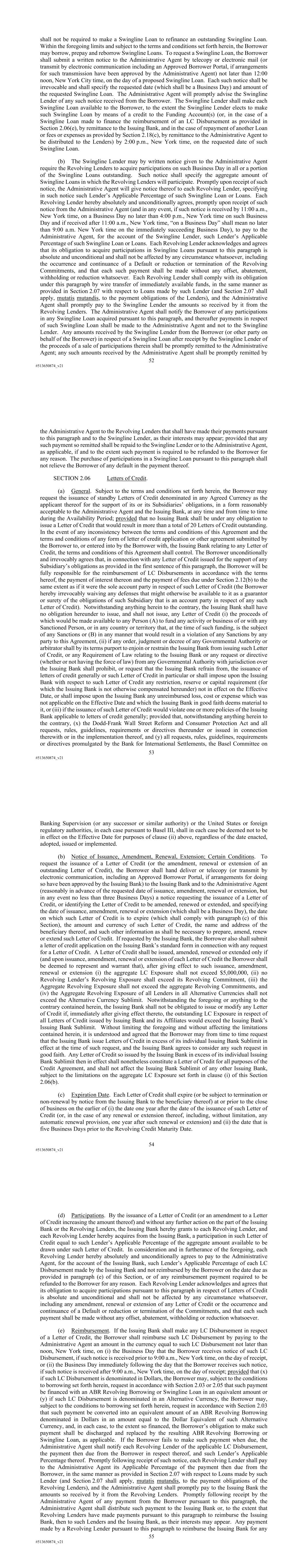 52 #513650874_v21 shall not be required to make a Swingline Loan to refinance an outstanding Swingline Loan. Within the foregoing limits and subject to the terms and conditions set forth herein, the Borrower may borrow, prepay and reborrow Swingline Loans. To request a Swingline Loan, the Borrower shall submit a written notice to the Administrative Agent by telecopy or electronic mail (or transmit by electronic communication including an Approved Borrower Portal, if arrangements for such transmission have been approved by the Administrative Agent) not later than 12:00 noon, New York City time, on the day of a proposed Swingline Loan. Each such notice shall be irrevocable and shall specify the requested date (which shall be a Business Day) and amount of the requested Swingline Loan. The Administrative Agent will promptly advise the Swingline Lender of any such notice received from the Borrower. The Swingline Lender shall make each Swingline Loan available to the Borrower, to the extent the Swingline Lender elects to make such Swingline Loan by means of a credit to the Funding Account(s) (or, in the case of a Swingline Loan made to finance the reimbursement of an LC Disbursement as provided in Section 2.06(e), by remittance to the Issuing Bank, and in the case of repayment of another Loan or fees or expenses as provided by Section 2.18(c), by remittance to the Administrative Agent to be distributed to the Lenders) by 2:00 p.m., New York time, on the requested date of such Swingline Loan. (b) The Swingline Lender may by written notice given to the Administrative Agent require the Revolving Lenders to acquire participations on such Business Day in all or a portion of the Swingline Loans outstanding. Such notice shall specify the aggregate amount of Swingline Loans in which the Revolving Lenders will participate. Promptly upon receipt of such notice, the Administrative Agent will give notice thereof to each Revolving Lender, specifying in such notice such Lender’s Applicable Percentage of such Swingline Loan or Loans. Each Revolving Lender hereby absolutely and unconditionally agrees, promptly upon receipt of such notice from the Administrative Agent (and in any event, if such notice is received by 11:00 a.m., New York time, on a Business Day no later than 4:00 p.m., New York time on such Business Day and if received after 11:00 a.m., New York time, “on a Business Day” shall mean no later than 9:00 a.m. New York time on the immediately succeeding Business Day), to pay to the Administrative Agent, for the account of the Swingline Lender, such Lender’s Applicable Percentage of such Swingline Loan or Loans. Each Revolving Lender acknowledges and agrees that its obligation to acquire participations in Swingline Loans pursuant to this paragraph is absolute and unconditional and shall not be affected by any circumstance whatsoever, including the occurrence and continuance of a Default or reduction or termination of the Revolving Commitments, and that each such payment shall be made without any offset, abatement, withholding or reduction whatsoever. Each Revolving Lender shall comply with its obligation under this paragraph by wire transfer of immediately available funds, in the same manner as provided in Section 2.07 with respect to Loans made by such Lender (and Section 2.07 shall apply, mutatis mutandis, to the payment obligations of the Lenders), and the Administrative Agent shall promptly pay to the Swingline Lender the amounts so received by it from the Revolving Lenders. The Administrative Agent shall notify the Borrower of any participations in any Swingline Loan acquired pursuant to this paragraph, and thereafter payments in respect of such Swingline Loan shall be made to the Administrative Agent and not to the Swingline Lender. Any amounts received by the Swingline Lender from the Borrower (or other party on behalf of the Borrower) in respect of a Swingline Loan after receipt by the Swingline Lender of the proceeds of a sale of participations therein shall be promptly remitted to the Administrative Agent; any such amounts received by the Administrative Agent shall be promptly remitted by 53 #513650874_v21 the Administrative Agent to the Revolving Lenders that shall have made their payments pursuant to this paragraph and to the Swingline Lender, as their interests may appear; provided that any such payment so remitted shall be repaid to the Swingline Lender or to the Administrative Agent, as applicable, if and to the extent such payment is required to be refunded to the Borrower for any reason. The purchase of participations in a Swingline Loan pursuant to this paragraph shall not relieve the Borrower of any default in the payment thereof. SECTION 2.06 Letters of Credit. (a) General. Subject to the terms and conditions set forth herein, the Borrower may request the issuance of standby Letters of Credit denominated in any Agreed Currency as the applicant thereof for the support of its or its Subsidiaries’ obligations, in a form reasonably acceptable to the Administrative Agent and the Issuing Bank, at any time and from time to time during the Availability Period; provided that no Issuing Bank shall be under any obligation to issue a Letter of Credit that would result in more than a total of 20 Letters of Credit outstanding. In the event of any inconsistency between the terms and conditions of this Agreement and the terms and conditions of any form of letter of credit application or other agreement submitted by the Borrower to, or entered into by the Borrower with, the Issuing Bank relating to any Letter of Credit, the terms and conditions of this Agreement shall control. The Borrower unconditionally and irrevocably agrees that, in connection with any Letter of Credit issued for the support of any Subsidiary’s obligations as provided in the first sentence of this paragraph, the Borrower will be fully responsible for the reimbursement of LC Disbursements in accordance with the term