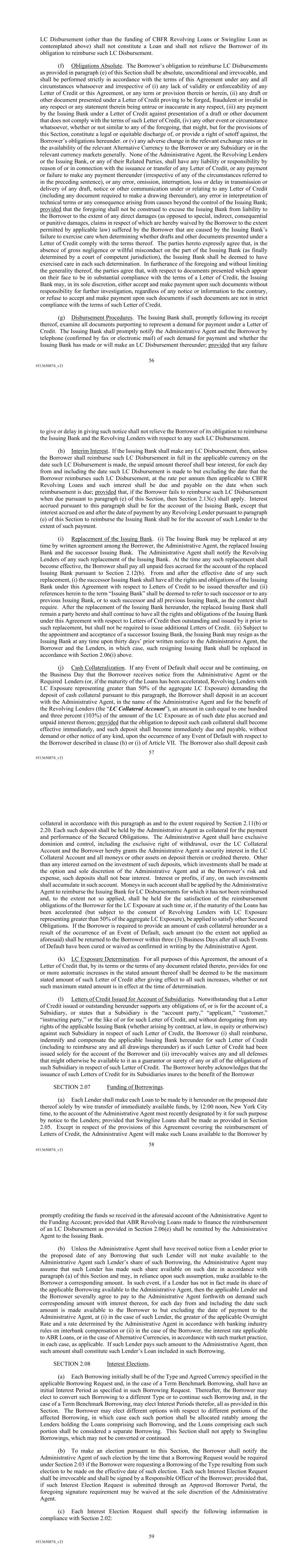 56 #513650874_v21 LC Disbursement (other than the funding of CBFR Revolving Loans or Swingline Loan as contemplated above) shall not constitute a Loan and shall not relieve the Borrower of its obligation to reimburse such LC Disbursement. (f) Obligations Absolute. The Borrower’s obligation to reimburse LC Disbursements as provided in paragraph (e) of this Section shall be absolute, unconditional and irrevocable, and shall be performed strictly in accordance with the terms of this Agreement under any and all circumstances whatsoever and irrespective of (i) any lack of validity or enforceability of any Letter of Credit or this Agreement, or any term or provision therein or herein, (ii) any draft or other document presented under a Letter of Credit proving to be forged, fraudulent or invalid in any respect or any statement therein being untrue or inaccurate in any respect, (iii) any payment by the Issuing Bank under a Letter of Credit against presentation of a draft or other document that does not comply with the terms of such Letter of Credit, (iv) any other event or circumstance whatsoever, whether or not similar to any of the foregoing, that might, but for the provisions of this Section, constitute a legal or equitable discharge of, or provide a right of setoff against, the Borrower’s obligations hereunder. or (v) any adverse change in the relevant exchange rates or in the availability of the relevant Alternative Currency to the Borrower or any Subsidiary or in the relevant currency markets generally. None of the Administrative Agent, the Revolving Lenders or the Issuing Bank, or any of their Related Parties, shall have any liability or responsibility by reason of or in connection with the issuance or transfer of any Letter of Credit, or any payment or failure to make any payment thereunder (irrespective of any of the circumstances referred to in the preceding sentence), or any error, omission, interruption, loss or delay in transmission or delivery of any draft, notice or other communication under or relating to any Letter of Credit (including any document required to make a drawing thereunder), any error in interpretation of technical terms or any consequence arising from causes beyond the control of the Issuing Bank; provided that the foregoing shall not be construed to excuse the Issuing Bank from liability to the Borrower to the extent of any direct damages (as opposed to special, indirect, consequential or punitive damages, claims in respect of which are hereby waived by the Borrower to the extent permitted by applicable law) suffered by the Borrower that are caused by the Issuing Bank’s failure to exercise care when determining whether drafts and other documents presented under a Letter of Credit comply with the terms thereof. The parties hereto expressly agree that, in the absence of gross negligence or willful misconduct on the part of the Issuing Bank (as finally determined by a court of competent jurisdiction), the Issuing Bank shall be deemed to have exercised care in each such determination. In furtherance of the foregoing and without limiting the generality thereof, the parties agree that, with respect to documents presented which appear on their face to be in substantial compliance with the terms of a Letter of Credit, the Issuing Bank may, in its sole discretion, either accept and make payment upon such documents without responsibility for further investigation, regardless of any notice or information to the contrary, or refuse to accept and make payment upon such documents if such documents are not in strict compliance with the terms of such Letter of Credit. (g) Disbursement Procedures. The Issuing Bank shall, promptly following its receipt thereof, examine all documents purporting to represent a demand for payment under a Letter of Credit. The Issuing Bank shall promptly notify the Administrative Agent and the Borrower by telephone (confirmed by fax or electronic mail) of such demand for payment and whether the Issuing Bank has made or will make an LC Disbursement thereunder; provided that any failure 57 #513650874_v21 to give or delay in giving such notice shall not relieve the Borrower of its obligation to reimburse the Issuing Bank and the Revolving Lenders with respect to any such LC Disbursement. (h) Interim Interest. If the Issuing Bank shall make any LC Disbursement, then, unless the Borrower shall reimburse such LC Disbursement in full in the applicable currency on the date such LC Disbursement is made, the unpaid amount thereof shall bear interest, for each day from and including the date such LC Disbursement is made to but excluding the date that the Borrower reimburses such LC Disbursement, at the rate per annum then applicable to CBFR Revolving Loans and such interest shall be due and payable on the date when such reimbursement is due; provided that, if the Borrower fails to reimburse such LC Disbursement when due pursuant to paragraph (e) of this Section, then Section 2.13(c) shall apply. Interest accrued pursuant to this paragraph shall be for the account of the Issuing Bank, except that interest accrued on and after the date of payment by any Revolving Lender pursuant to paragraph (e) of this Section to reimburse the Issuing Bank shall be for the account of such Lender to the extent of such payment. (i) Replacement of the Issuing Bank. (i) The Issuing Bank may be replaced at any time by written agreement among the Borrower, the Administrative Agent, the replaced Issuing Bank and the successor Issuing Bank. The Administrative Agent shall notify the Revolving Lenders of any such replacement of the Issuing Bank. At the time any such replacement shall become effective, the Borrower shall pay all unpaid fees accrued for the account of the replaced Issuing Bank pursuant to Section 2.12(b). From and after the effective date of any such replacement, (i) the successor Issuing Bank shall have all the rights and obligations of the Issuing Bank under this Agre