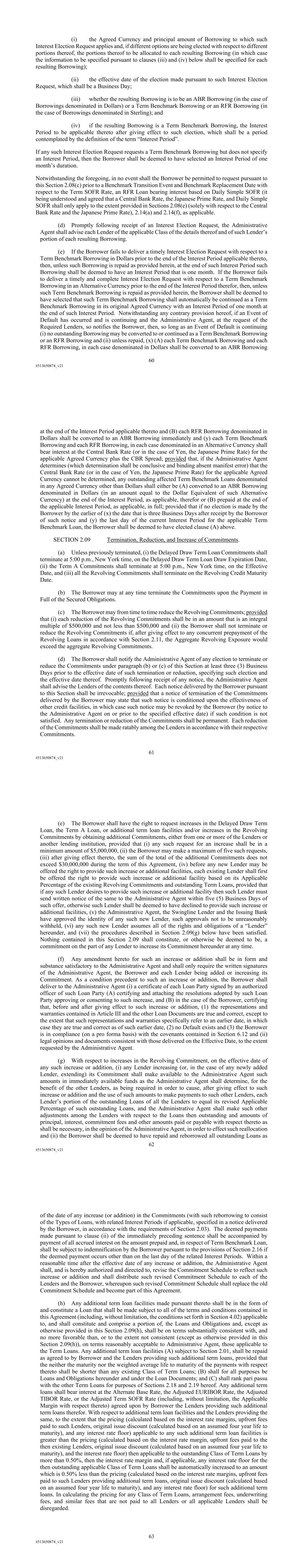 60 #513650874_v21 (i) the Agreed Currency and principal amount of Borrowing to which such Interest Election Request applies and, if different options are being elected with respect to different portions thereof, the portions thereof to be allocated to each resulting Borrowing (in which case the information to be specified pursuant to clauses (iii) and (iv) below shall be specified for each resulting Borrowing); (ii) the effective date of the election made pursuant to such Interest Election Request, which shall be a Business Day; (iii) whether the resulting Borrowing is to be an ABR Borrowing (in the case of Borrowings denominated in Dollars) or a Term Benchmark Borrowing or an RFR Borrowing (in the case of Borrowings denominated in Sterling); and (iv) if the resulting Borrowing is a Term Benchmark Borrowing, the Interest Period to be applicable thereto after giving effect to such election, which shall be a period contemplated by the definition of the term “Interest Period”. If any such Interest Election Request requests a Term Benchmark Borrowing but does not specify an Interest Period, then the Borrower shall be deemed to have selected an Interest Period of one month’s duration. Notwithstanding the foregoing, in no event shall the Borrower be permitted to request pursuant to this Section 2.08(c) prior to a Benchmark Transition Event and Benchmark Replacement Date with respect to the Term SOFR Rate, an RFR Loan bearing interest based on Daily Simple SOFR (it being understood and agreed that a Central Bank Rate, the Japanese Prime Rate, and Daily Simple SOFR shall only apply to the extent provided in Sections 2.08(e) (solely with respect to the Central Bank Rate and the Japanese Prime Rate), 2.14(a) and 2.14(f), as applicable. (d) Promptly following receipt of an Interest Election Request, the Administrative Agent shall advise each Lender of the applicable Class of the details thereof and of such Lender’s portion of each resulting Borrowing. (e) If the Borrower fails to deliver a timely Interest Election Request with respect to a Term Benchmark Borrowing in Dollars prior to the end of the Interest Period applicable thereto, then, unless such Borrowing is repaid as provided herein, at the end of such Interest Period such Borrowing shall be deemed to have an Interest Period that is one month. If the Borrower fails to deliver a timely and complete Interest Election Request with respect to a Term Benchmark Borrowing in an Alternative Currency prior to the end of the Interest Period therefor, then, unless such Term Benchmark Borrowing is repaid as provided herein, the Borrower shall be deemed to have selected that such Term Benchmark Borrowing shall automatically be continued as a Term Benchmark Borrowing in its original Agreed Currency with an Interest Period of one month at the end of such Interest Period. Notwithstanding any contrary provision hereof, if an Event of Default has occurred and is continuing and the Administrative Agent, at the request of the Required Lenders, so notifies the Borrower, then, so long as an Event of Default is continuing (i) no outstanding Borrowing may be converted to or continued as a Term Benchmark Borrowing or an RFR Borrowing and (ii) unless repaid, (x) (A) each Term Benchmark Borrowing and each RFR Borrowing, in each case denominated in Dollars shall be converted to an ABR Borrowing 61 #513650874_v21 at the end of the Interest Period applicable thereto and (B) each RFR Borrowing denominated in Dollars shall be converted to an ABR Borrowing immediately and (y) each Term Benchmark Borrowing and each RFR Borrowing, in each case denominated in an Alternative Currency shall bear interest at the Central Bank Rate (or in the case of Yen, the Japanese Prime Rate) for the applicable Agreed Currency plus the CBR Spread; provided that, if the Administrative Agent determines (which determination shall be conclusive and binding absent manifest error) that the Central Bank Rate (or in the case of Yen, the Japanese Prime Rate) for the applicable Agreed Currency cannot be determined, any outstanding affected Term Benchmark Loans denominated in any Agreed Currency other than Dollars shall either be (A) converted to an ABR Borrowing denominated in Dollars (in an amount equal to the Dollar Equivalent of such Alternative Currency) at the end of the Interest Period, as applicable, therefor or (B) prepaid at the end of the applicable Interest Period, as applicable, in full; provided that if no election is made by the Borrower by the earlier of (x) the date that is three Business Days after receipt by the Borrower of such notice and (y) the last day of the current Interest Period for the applicable Term Benchmark Loan, the Borrower shall be deemed to have elected clause (A) above. SECTION 2.09 Termination, Reduction, and Increase of Commitments. (a) Unless previously terminated, (i) the Delayed Draw Term Loan Commitments shall terminate at 5:00 p.m., New York time, on the Delayed Draw Term Loan Draw Expiration Date, (ii) the Term A Commitments shall terminate at 5:00 p.m., New York time, on the Effective Date, and (iii) all the Revolving Commitments shall terminate on the Revolving Credit Maturity Date. (b) The Borrower may at any time terminate the Commitments upon the Payment in Full of the Secured Obligations. (c) The Borrower may from time to time reduce the Revolving Commitments; provided that (i) each reduction of the Revolving Commitments shall be in an amount that is an integral multiple of $500,000 and not less than $500,000 and (ii) the Borrower shall not terminate or reduce the Revolving Commitments if, after giving effect to any concurrent prepayment of the Revolving Loans in accordance with Section 2.11, the Aggregate Revolving Exposure would exceed the aggregate Revolving Commitments. (d) The Borrower shall notify the Administrative Agent of any election to terminate or reduce the Commitments under paragraph (b) or (c) of this Section at least three (3) Busi