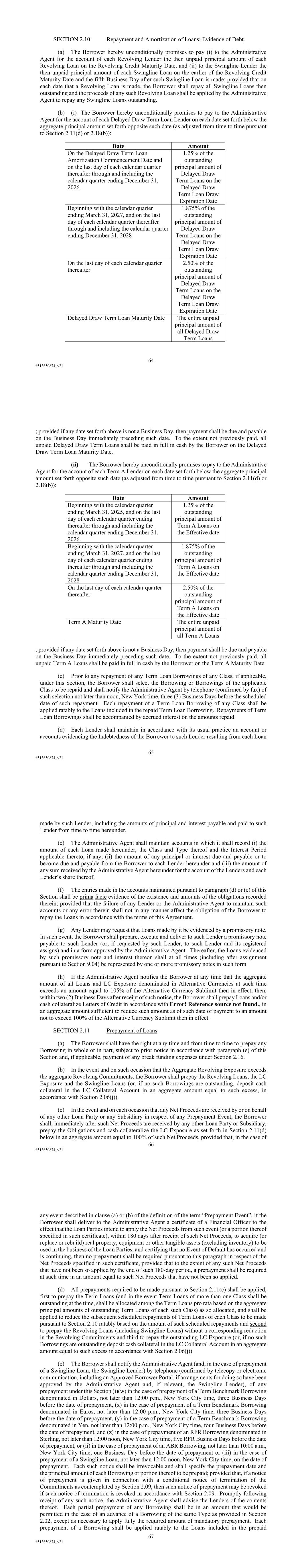 64 #513650874_v21 SECTION 2.10 Repayment and Amortization of Loans; Evidence of Debt. (a) The Borrower hereby unconditionally promises to pay (i) to the Administrative Agent for the account of each Revolving Lender the then unpaid principal amount of each Revolving Loan on the Revolving Credit Maturity Date, and (ii) to the Swingline Lender the then unpaid principal amount of each Swingline Loan on the earlier of the Revolving Credit Maturity Date and the fifth Business Day after such Swingline Loan is made; provided that on each date that a Revolving Loan is made, the Borrower shall repay all Swingline Loans then outstanding and the proceeds of any such Revolving Loan shall be applied by the Administrative Agent to repay any Swingline Loans outstanding. (b) (i) The Borrower hereby unconditionally promises to pay to the Administrative Agent for the account of each Delayed Draw Term Loan Lender on each date set forth below the aggregate principal amount set forth opposite such date (as adjusted from time to time pursuant to Section 2.11(d) or 2.18(b)): Date Amount On the Delayed Draw Term Loan Amortization Commencement Date and on the last day of each calendar quarter thereafter through and including the calendar quarter ending December 31, 2026. 1.25% of the outstanding principal amount of Delayed Draw Term Loans on the Delayed Draw Term Loan Draw Expiration Date Beginning with the calendar quarter ending March 31, 2027, and on the last day of each calendar quarter thereafter through and including the calendar quarter ending December 31, 2028 1.875% of the outstanding principal amount of Delayed Draw Term Loans on the Delayed Draw Term Loan Draw Expiration Date On the last day of each calendar quarter thereafter 2.50% of the outstanding principal amount of Delayed Draw Term Loans on the Delayed Draw Term Loan Draw Expiration Date Delayed Draw Term Loan Maturity Date The entire unpaid principal amount of all Delayed Draw Term Loans 65 #513650874_v21 ; provided if any date set forth above is not a Business Day, then payment shall be due and payable on the Business Day immediately preceding such date. To the extent not previously paid, all unpaid Delayed Draw Term Loans shall be paid in full in cash by the Borrower on the Delayed Draw Term Loan Maturity Date. (ii) The Borrower hereby unconditionally promises to pay to the Administrative Agent for the account of each Term A Lender on each date set forth below the aggregate principal amount set forth opposite such date (as adjusted from time to time pursuant to Section 2.11(d) or 2.18(b)): Date Amount Beginning with the calendar quarter ending March 31, 2025, and on the last day of each calendar quarter ending thereafter through and including the calendar quarter ending December 31, 2026. 1.25% of the outstanding principal amount of Term A Loans on the Effective date Beginning with the calendar quarter ending March 31, 2027, and on the last day of each calendar quarter ending thereafter through and including the calendar quarter ending December 31, 2028 1.875% of the outstanding principal amount of Term A Loans on the Effective date On the last day of each calendar quarter thereafter 2.50% of the outstanding principal amount of Term A Loans on the Effective date Term A Maturity Date The entire unpaid principal amount of all Term A Loans ; provided if any date set forth above is not a Business Day, then payment shall be due and payable on the Business Day immediately preceding such date. To the extent not previously paid, all unpaid Term A Loans shall be paid in full in cash by the Borrower on the Term A Maturity Date. (c) Prior to any repayment of any Term Loan Borrowings of any Class, if applicable, under this Section, the Borrower shall select the Borrowing or Borrowings of the applicable Class to be repaid and shall notify the Administrative Agent by telephone (confirmed by fax) of such selection not later than noon, New York time, three (3) Business Days before the scheduled date of such repayment. Each repayment of a Term Loan Borrowing of any Class shall be applied ratably to the Loans included in the repaid Term Loan Borrowing. Repayments of Term Loan Borrowings shall be accompanied by accrued interest on the amounts repaid. (d) Each Lender shall maintain in accordance with its usual practice an account or accounts evidencing the Indebtedness of the Borrower to such Lender resulting from each Loan 66 #513650874_v21 made by such Lender, including the amounts of principal and interest payable and paid to such Lender from time to time hereunder. (e) The Administrative Agent shall maintain accounts in which it shall record (i) the amount of each Loan made hereunder, the Class and Type thereof and the Interest Period applicable thereto, if any, (ii) the amount of any principal or interest due and payable or to become due and payable from the Borrower to each Lender hereunder and (iii) the amount of any sum received by the Administrative Agent hereunder for the account of the Lenders and each Lender’s share thereof. (f) The entries made in the accounts maintained pursuant to paragraph (d) or (e) of this Section shall be prima facie evidence of the existence and amounts of the obligations recorded therein; provided that the failure of any Lender or the Administrative Agent to maintain such accounts or any error therein shall not in any manner affect the obligation of the Borrower to repay the Loans in accordance with the terms of this Agreement. (g) Any Lender may request that Loans made by it be evidenced by a promissory note. In such event, the Borrower shall prepare, execute and deliver to such Lender a promissory note payable to such Lender (or, if requested by such Lender, to such Lender and its registered assigns) and in a form approved by the Administrative Agent. Thereafter, the Loans evidenced by such promissory note and interest thereon shall at all times (including after assignment pursuant to Section 9.04) be represented by one 