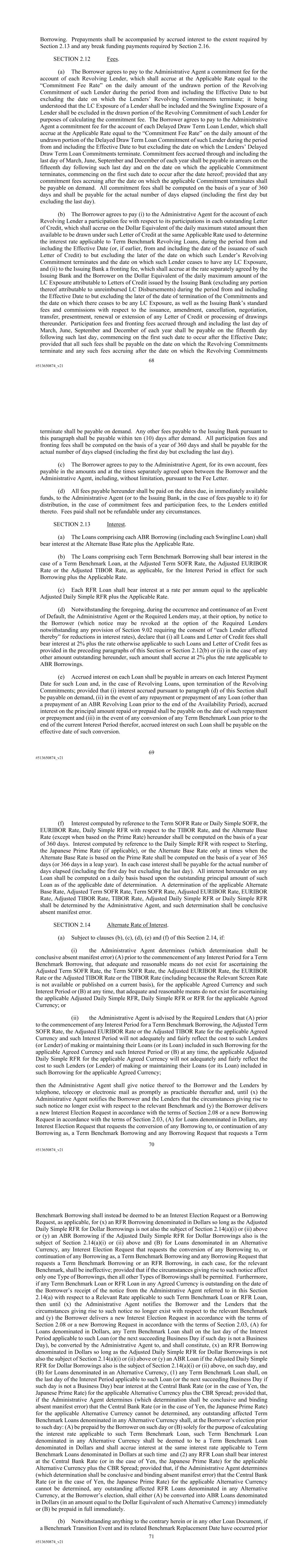 68 #513650874_v21 Borrowing. Prepayments shall be accompanied by accrued interest to the extent required by Section 2.13 and any break funding payments required by Section 2.16. SECTION 2.12 Fees. (a) The Borrower agrees to pay to the Administrative Agent a commitment fee for the account of each Revolving Lender, which shall accrue at the Applicable Rate equal to the “Commitment Fee Rate” on the daily amount of the undrawn portion of the Revolving Commitment of such Lender during the period from and including the Effective Date to but excluding the date on which the Lenders’ Revolving Commitments terminate; it being understood that the LC Exposure of a Lender shall be included and the Swingline Exposure of a Lender shall be excluded in the drawn portion of the Revolving Commitment of such Lender for purposes of calculating the commitment fee. The Borrower agrees to pay to the Administrative Agent a commitment fee for the account of each Delayed Draw Term Loan Lender, which shall accrue at the Applicable Rate equal to the “Commitment Fee Rate” on the daily amount of the undrawn portion of the Delayed Draw Term Loan Commitment of such Lender during the period from and including the Effective Date to but excluding the date on which the Lenders’ Delayed Draw Term Loan Commitments terminate. Commitment fees accrued through and including the last day of March, June, September and December of each year shall be payable in arrears on the fifteenth day following such last day and on the date on which the applicable Commitment terminates, commencing on the first such date to occur after the date hereof; provided that any commitment fees accruing after the date on which the applicable Commitment terminates shall be payable on demand. All commitment fees shall be computed on the basis of a year of 360 days and shall be payable for the actual number of days elapsed (including the first day but excluding the last day). (b) The Borrower agrees to pay (i) to the Administrative Agent for the account of each Revolving Lender a participation fee with respect to its participations in each outstanding Letter of Credit, which shall accrue on the Dollar Equivalent of the daily maximum stated amount then available to be drawn under such Letter of Credit at the same Applicable Rate used to determine the interest rate applicable to Term Benchmark Revolving Loans, during the period from and including the Effective Date (or, if earlier, from and including the date of the issuance of such Letter of Credit) to but excluding the later of the date on which such Lender’s Revolving Commitment terminates and the date on which such Lender ceases to have any LC Exposure, and (ii) to the Issuing Bank a fronting fee, which shall accrue at the rate separately agreed by the Issuing Bank and the Borrower on the Dollar Equivalent of the daily maximum amount of the LC Exposure attributable to Letters of Credit issued by the Issuing Bank (excluding any portion thereof attributable to unreimbursed LC Disbursements) during the period from and including the Effective Date to but excluding the later of the date of termination of the Commitments and the date on which there ceases to be any LC Exposure, as well as the Issuing Bank’s standard fees and commissions with respect to the issuance, amendment, cancellation, negotiation, transfer, presentment, renewal or extension of any Letter of Credit or processing of drawings thereunder. Participation fees and fronting fees accrued through and including the last day of March, June, September and December of each year shall be payable on the fifteenth day following such last day, commencing on the first such date to occur after the Effective Date; provided that all such fees shall be payable on the date on which the Revolving Commitments terminate and any such fees accruing after the date on which the Revolving Commitments 69 #513650874_v21 terminate shall be payable on demand. Any other fees payable to the Issuing Bank pursuant to this paragraph shall be payable within ten (10) days after demand. All participation fees and fronting fees shall be computed on the basis of a year of 360 days and shall be payable for the actual number of days elapsed (including the first day but excluding the last day). (c) The Borrower agrees to pay to the Administrative Agent, for its own account, fees payable in the amounts and at the times separately agreed upon between the Borrower and the Administrative Agent, including, without limitation, pursuant to the Fee Letter. (d) All fees payable hereunder shall be paid on the dates due, in immediately available funds, to the Administrative Agent (or to the Issuing Bank, in the case of fees payable to it) for distribution, in the case of commitment fees and participation fees, to the Lenders entitled thereto. Fees paid shall not be refundable under any circumstances. SECTION 2.13 Interest. (a) The Loans comprising each ABR Borrowing (including each Swingline Loan) shall bear interest at the Alternate Base Rate plus the Applicable Rate. (b) The Loans comprising each Term Benchmark Borrowing shall bear interest in the case of a Term Benchmark Loan, at the Adjusted Term SOFR Rate, the Adjusted EURIBOR Rate or the Adjusted TIBOR Rate, as applicable, for the Interest Period in effect for such Borrowing plus the Applicable Rate. (c) Each RFR Loan shall bear interest at a rate per annum equal to the applicable Adjusted Daily Simple RFR plus the Applicable Rate. (d) Notwithstanding the foregoing, during the occurrence and continuance of an Event of Default, the Administrative Agent or the Required Lenders may, at their option, by notice to the Borrower (which notice may be revoked at the option of the Required Lenders notwithstanding any provision of Section 9.02 requiring the consent of “each Lender affected thereby” for reductions in interest rates), declare that (i) all Loans and Letter of Credit fees shall bear interest at 2% plus the rate otherwise
