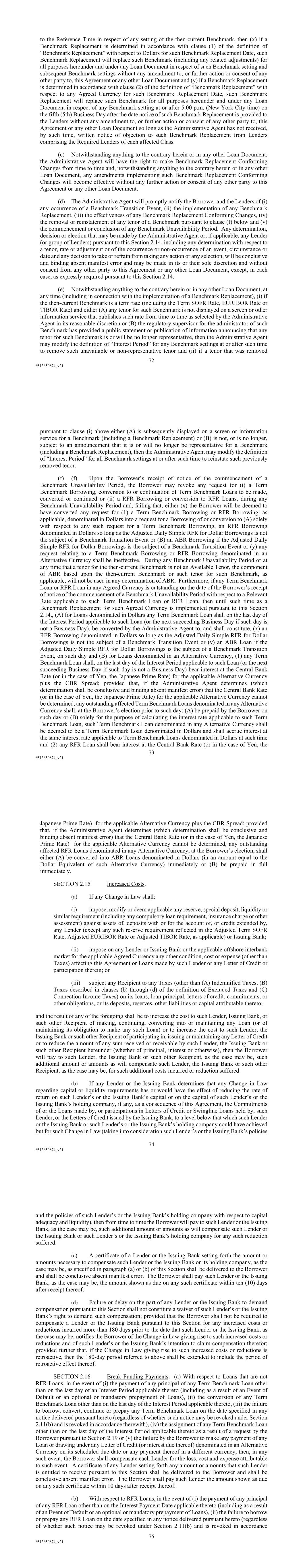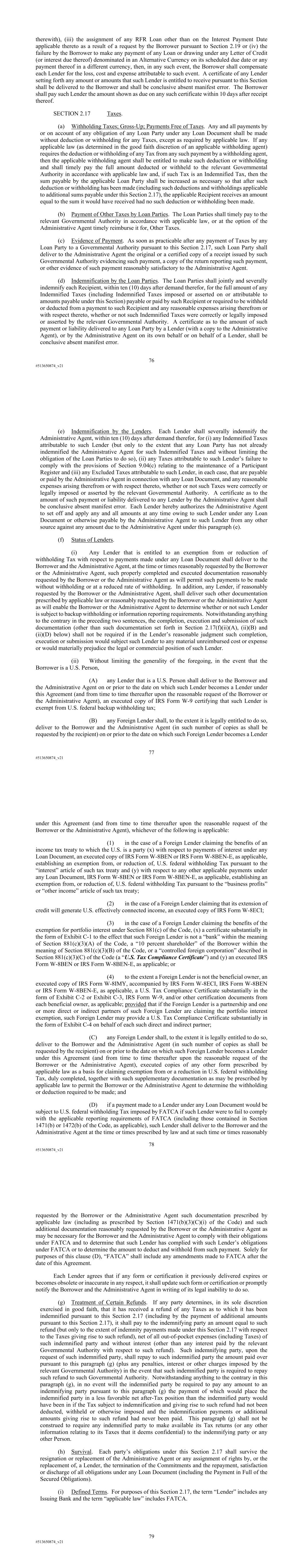 76 #513650874_v21 therewith), (iii) the assignment of any RFR Loan other than on the Interest Payment Date applicable thereto as a result of a request by the Borrower pursuant to Section 2.19 or (iv) the failure by the Borrower to make any payment of any Loan or drawing under any Letter of Credit (or interest due thereof) denominated in an Alternative Currency on its scheduled due date or any payment thereof in a different currency, then, in any such event, the Borrower shall compensate each Lender for the loss, cost and expense attributable to such event. A certificate of any Lender setting forth any amount or amounts that such Lender is entitled to receive pursuant to this Section shall be delivered to the Borrower and shall be conclusive absent manifest error. The Borrower shall pay such Lender the amount shown as due on any such certificate within 10 days after receipt thereof. SECTION 2.17 Taxes. (a) Withholding Taxes; Gross-Up; Payments Free of Taxes. Any and all payments by or on account of any obligation of any Loan Party under any Loan Document shall be made without deduction or withholding for any Taxes, except as required by applicable law. If any applicable law (as determined in the good faith discretion of an applicable withholding agent) requires the deduction or withholding of any Tax from any such payment by a withholding agent, then the applicable withholding agent shall be entitled to make such deduction or withholding and shall timely pay the full amount deducted or withheld to the relevant Governmental Authority in accordance with applicable law and, if such Tax is an Indemnified Tax, then the sum payable by the applicable Loan Party shall be increased as necessary so that after such deduction or withholding has been made (including such deductions and withholdings applicable to additional sums payable under this Section 2.17), the applicable Recipient receives an amount equal to the sum it would have received had no such deduction or withholding been made. (b) Payment of Other Taxes by Loan Parties. The Loan Parties shall timely pay to the relevant Governmental Authority in accordance with applicable law, or at the option of the Administrative Agent timely reimburse it for, Other Taxes. (c) Evidence of Payment. As soon as practicable after any payment of Taxes by any Loan Party to a Governmental Authority pursuant to this Section 2.17, such Loan Party shall deliver to the Administrative Agent the original or a certified copy of a receipt issued by such Governmental Authority evidencing such payment, a copy of the return reporting such payment, or other evidence of such payment reasonably satisfactory to the Administrative Agent. (d) Indemnification by the Loan Parties. The Loan Parties shall jointly and severally indemnify each Recipient, within ten (10) days after demand therefor, for the full amount of any Indemnified Taxes (including Indemnified Taxes imposed or asserted on or attributable to amounts payable under this Section) payable or paid by such Recipient or required to be withheld or deducted from a payment to such Recipient and any reasonable expenses arising therefrom or with respect thereto, whether or not such Indemnified Taxes were correctly or legally imposed or asserted by the relevant Governmental Authority. A certificate as to the amount of such payment or liability delivered to any Loan Party by a Lender (with a copy to the Administrative Agent), or by the Administrative Agent on its own behalf or on behalf of a Lender, shall be conclusive absent manifest error. 77 #513650874_v21 (e) Indemnification by the Lenders. Each Lender shall severally indemnify the Administrative Agent, within ten (10) days after demand therefor, for (i) any Indemnified Taxes attributable to such Lender (but only to the extent that any Loan Party has not already indemnified the Administrative Agent for such Indemnified Taxes and without limiting the obligation of the Loan Parties to do so), (ii) any Taxes attributable to such Lender’s failure to comply with the provisions of Section 9.04(c) relating to the maintenance of a Participant Register and (iii) any Excluded Taxes attributable to such Lender, in each case, that are payable or paid by the Administrative Agent in connection with any Loan Document, and any reasonable expenses arising therefrom or with respect thereto, whether or not such Taxes were correctly or legally imposed or asserted by the relevant Governmental Authority. A certificate as to the amount of such payment or liability delivered to any Lender by the Administrative Agent shall be conclusive absent manifest error. Each Lender hereby authorizes the Administrative Agent to set off and apply any and all amounts at any time owing to such Lender under any Loan Document or otherwise payable by the Administrative Agent to such Lender from any other source against any amount due to the Administrative Agent under this paragraph (e). (f) Status of Lenders. (i) Any Lender that is entitled to an exemption from or reduction of withholding Tax with respect to payments made under any Loan Document shall deliver to the Borrower and the Administrative Agent, at the time or times reasonably requested by the Borrower or the Administrative Agent, such properly completed and executed documentation reasonably requested by the Borrower or the Administrative Agent as will permit such payments to be made without withholding or at a reduced rate of withholding. In addition, any Lender, if reasonably requested by the Borrower or the Administrative Agent, shall deliver such other documentation prescribed by applicable law or reasonably requested by the Borrower or the Administrative Agent as will enable the Borrower or the Administrative Agent to determine whether or not such Lender is subject to backup withholding or information reporting requirements. Notwithstanding anything to the contrary in the preceding two sentences, the completion, execution and submission of such docu