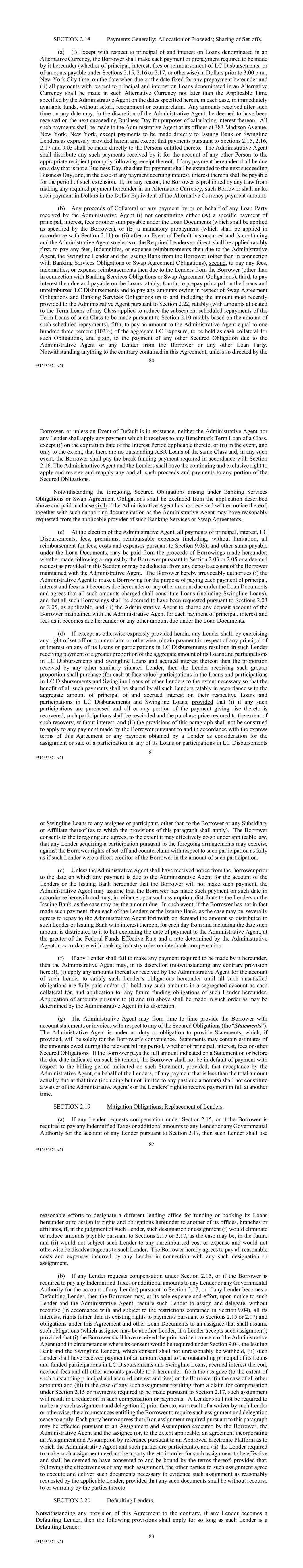 80 #513650874_v21 SECTION 2.18 Payments Generally; Allocation of Proceeds; Sharing of Set-offs. (a) (i) Except with respect to principal of and interest on Loans denominated in an Alternative Currency, the Borrower shall make each payment or prepayment required to be made by it hereunder (whether of principal, interest, fees or reimbursement of LC Disbursements, or of amounts payable under Sections 2.15, 2.16 or 2.17, or otherwise) in Dollars prior to 3:00 p.m., New York City time, on the date when due or the date fixed for any prepayment hereunder and (ii) all payments with respect to principal and interest on Loans denominated in an Alternative Currency shall be made in such Alternative Currency not later than the Applicable Time specified by the Administrative Agent on the dates specified herein, in each case, in immediately available funds, without setoff, recoupment or counterclaim. Any amounts received after such time on any date may, in the discretion of the Administrative Agent, be deemed to have been received on the next succeeding Business Day for purposes of calculating interest thereon. All such payments shall be made to the Administrative Agent at its offices at 383 Madison Avenue, New York, New York, except payments to be made directly to Issuing Bank or Swingline Lenders as expressly provided herein and except that payments pursuant to Sections 2.15, 2.16, 2.17 and 9.03 shall be made directly to the Persons entitled thereto. The Administrative Agent shall distribute any such payments received by it for the account of any other Person to the appropriate recipient promptly following receipt thereof. If any payment hereunder shall be due on a day that is not a Business Day, the date for payment shall be extended to the next succeeding Business Day, and, in the case of any payment accruing interest, interest thereon shall be payable for the period of such extension. If, for any reason, the Borrower is prohibited by any Law from making any required payment hereunder in an Alternative Currency, such Borrower shall make such payment in Dollars in the Dollar Equivalent of the Alternative Currency payment amount. (b) Any proceeds of Collateral or any payment by or on behalf of any Loan Party received by the Administrative Agent (i) not constituting either (A) a specific payment of principal, interest, fees or other sum payable under the Loan Documents (which shall be applied as specified by the Borrower), or (B) a mandatory prepayment (which shall be applied in accordance with Section 2.11) or (ii) after an Event of Default has occurred and is continuing and the Administrative Agent so elects or the Required Lenders so direct, shall be applied ratably first, to pay any fees, indemnities, or expense reimbursements then due to the Administrative Agent, the Swingline Lender and the Issuing Bank from the Borrower (other than in connection with Banking Services Obligations or Swap Agreement Obligations), second, to pay any fees, indemnities, or expense reimbursements then due to the Lenders from the Borrower (other than in connection with Banking Services Obligations or Swap Agreement Obligations), third, to pay interest then due and payable on the Loans ratably, fourth, to prepay principal on the Loans and unreimbursed LC Disbursements and to pay any amounts owing in respect of Swap Agreement Obligations and Banking Services Obligations up to and including the amount most recently provided to the Administrative Agent pursuant to Section 2.22, ratably (with amounts allocated to the Term Loans of any Class applied to reduce the subsequent scheduled repayments of the Term Loans of such Class to be made pursuant to Section 2.10 ratably based on the amount of such scheduled repayments), fifth, to pay an amount to the Administrative Agent equal to one hundred three percent (103%) of the aggregate LC Exposure, to be held as cash collateral for such Obligations, and sixth, to the payment of any other Secured Obligation due to the Administrative Agent or any Lender from the Borrower or any other Loan Party. Notwithstanding anything to the contrary contained in this Agreement, unless so directed by the 81 #513650874_v21 Borrower, or unless an Event of Default is in existence, neither the Administrative Agent nor any Lender shall apply any payment which it receives to any Benchmark Term Loan of a Class, except (i) on the expiration date of the Interest Period applicable thereto, or (ii) in the event, and only to the extent, that there are no outstanding ABR Loans of the same Class and, in any such event, the Borrower shall pay the break funding payment required in accordance with Section 2.16. The Administrative Agent and the Lenders shall have the continuing and exclusive right to apply and reverse and reapply any and all such proceeds and payments to any portion of the Secured Obligations. Notwithstanding the foregoing, Secured Obligations arising under Banking Services Obligations or Swap Agreement Obligations shall be excluded from the application described above and paid in clause sixth if the Administrative Agent has not received written notice thereof, together with such supporting documentation as the Administrative Agent may have reasonably requested from the applicable provider of such Banking Services or Swap Agreements. (c) At the election of the Administrative Agent, all payments of principal, interest, LC Disbursements, fees, premiums, reimbursable expenses (including, without limitation, all reimbursement for fees, costs and expenses pursuant to Section 9.03), and other sums payable under the Loan Documents, may be paid from the proceeds of Borrowings made hereunder, whether made following a request by the Borrower pursuant to Section 2.03 or 2.05 or a deemed request as provided in this Section or may be deducted from any deposit account of the Borrower maintained with the Administrative Agent. The Borrower hereby irrevocably authorizes (i) the Administrative Agent to make a Borrow