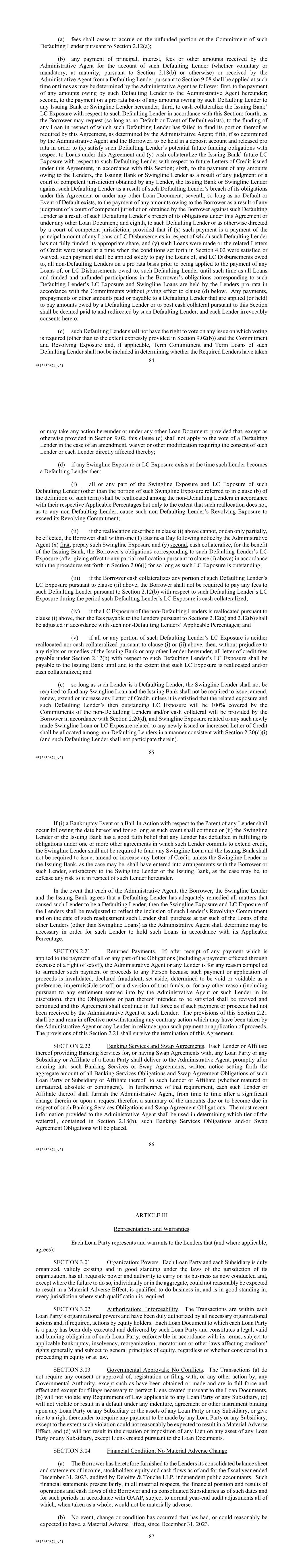 84 #513650874_v21 (a) fees shall cease to accrue on the unfunded portion of the Commitment of such Defaulting Lender pursuant to Section 2.12(a); (b) any payment of principal, interest, fees or other amounts received by the Administrative Agent for the account of such Defaulting Lender (whether voluntary or mandatory, at maturity, pursuant to Section 2.18(b) or otherwise) or received by the Administrative Agent from a Defaulting Lender pursuant to Section 9.08 shall be applied at such time or times as may be determined by the Administrative Agent as follows: first, to the payment of any amounts owing by such Defaulting Lender to the Administrative Agent hereunder; second, to the payment on a pro rata basis of any amounts owing by such Defaulting Lender to any Issuing Bank or Swingline Lender hereunder; third, to cash collateralize the Issuing Bank’ LC Exposure with respect to such Defaulting Lender in accordance with this Section; fourth, as the Borrower may request (so long as no Default or Event of Default exists), to the funding of any Loan in respect of which such Defaulting Lender has failed to fund its portion thereof as required by this Agreement, as determined by the Administrative Agent; fifth, if so determined by the Administrative Agent and the Borrower, to be held in a deposit account and released pro rata in order to (x) satisfy such Defaulting Lender’s potential future funding obligations with respect to Loans under this Agreement and (y) cash collateralize the Issuing Bank’ future LC Exposure with respect to such Defaulting Lender with respect to future Letters of Credit issued under this Agreement, in accordance with this Section; sixth, to the payment of any amounts owing to the Lenders, the Issuing Bank or Swingline Lender as a result of any judgment of a court of competent jurisdiction obtained by any Lender, the Issuing Bank or Swingline Lender against such Defaulting Lender as a result of such Defaulting Lender’s breach of its obligations under this Agreement or under any other Loan Document; seventh, so long as no Default or Event of Default exists, to the payment of any amounts owing to the Borrower as a result of any judgment of a court of competent jurisdiction obtained by the Borrower against such Defaulting Lender as a result of such Defaulting Lender’s breach of its obligations under this Agreement or under any other Loan Document; and eighth, to such Defaulting Lender or as otherwise directed by a court of competent jurisdiction; provided that if (x) such payment is a payment of the principal amount of any Loans or LC Disbursements in respect of which such Defaulting Lender has not fully funded its appropriate share, and (y) such Loans were made or the related Letters of Credit were issued at a time when the conditions set forth in Section 4.02 were satisfied or waived, such payment shall be applied solely to pay the Loans of, and LC Disbursements owed to, all non-Defaulting Lenders on a pro rata basis prior to being applied to the payment of any Loans of, or LC Disbursements owed to, such Defaulting Lender until such time as all Loans and funded and unfunded participations in the Borrower’s obligations corresponding to such Defaulting Lender’s LC Exposure and Swingline Loans are held by the Lenders pro rata in accordance with the Commitments without giving effect to clause (d) below. Any payments, prepayments or other amounts paid or payable to a Defaulting Lender that are applied (or held) to pay amounts owed by a Defaulting Lender or to post cash collateral pursuant to this Section shall be deemed paid to and redirected by such Defaulting Lender, and each Lender irrevocably consents hereto; (c) such Defaulting Lender shall not have the right to vote on any issue on which voting is required (other than to the extent expressly provided in Section 9.02(b)) and the Commitment and Revolving Exposure and, if applicable, Term Commitment and Term Loans of such Defaulting Lender shall not be included in determining whether the Required Lenders have taken 85 #513650874_v21 or may take any action hereunder or under any other Loan Document; provided that, except as otherwise provided in Section 9.02, this clause (c) shall not apply to the vote of a Defaulting Lender in the case of an amendment, waiver or other modification requiring the consent of such Lender or each Lender directly affected thereby; (d) if any Swingline Exposure or LC Exposure exists at the time such Lender becomes a Defaulting Lender then: (i) all or any part of the Swingline Exposure and LC Exposure of such Defaulting Lender (other than the portion of such Swingline Exposure referred to in clause (b) of the definition of such term) shall be reallocated among the non-Defaulting Lenders in accordance with their respective Applicable Percentages but only to the extent that such reallocation does not, as to any non-Defaulting Lender, cause such non-Defaulting Lender’s Revolving Exposure to exceed its Revolving Commitment; (ii) if the reallocation described in clause (i) above cannot, or can only partially, be effected, the Borrower shall within one (1) Business Day following notice by the Administrative Agent (x) first, prepay such Swingline Exposure and (y) second, cash collateralize, for the benefit of the Issuing Bank, the Borrower’s obligations corresponding to such Defaulting Lender’s LC Exposure (after giving effect to any partial reallocation pursuant to clause (i) above) in accordance with the procedures set forth in Section 2.06(j) for so long as such LC Exposure is outstanding; (iii) if the Borrower cash collateralizes any portion of such Defaulting Lender’s LC Exposure pursuant to clause (ii) above, the Borrower shall not be required to pay any fees to such Defaulting Lender pursuant to Section 2.12(b) with respect to such Defaulting Lender’s LC Exposure during the period such Defaulting Lender’s LC Exposure is cash collateralized; (iv) if the LC Exposure of the non