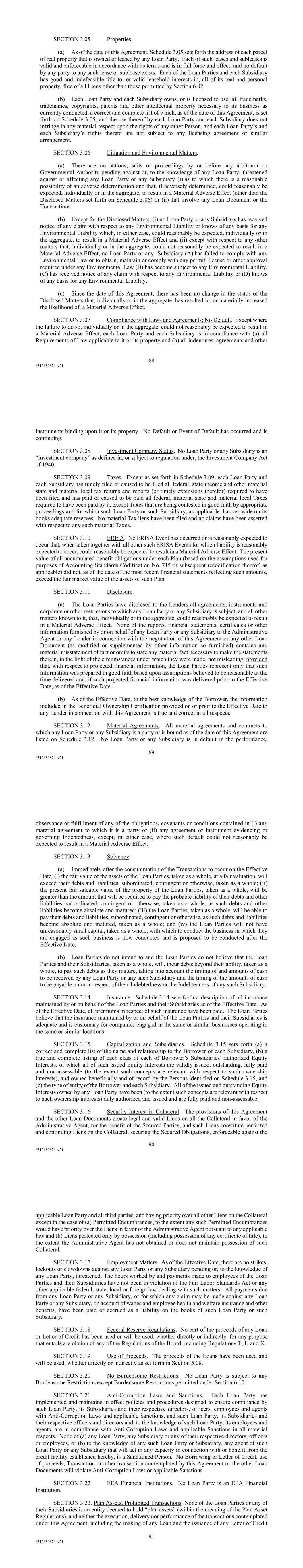 88 #513650874_v21 SECTION 3.05 Properties. (a) As of the date of this Agreement, Schedule 3.05 sets forth the address of each parcel of real property that is owned or leased by any Loan Party. Each of such leases and subleases is valid and enforceable in accordance with its terms and is in full force and effect, and no default by any party to any such lease or sublease exists. Each of the Loan Parties and each Subsidiary has good and indefeasible title to, or valid leasehold interests in, all of its real and personal property, free of all Liens other than those permitted by Section 6.02. (b) Each Loan Party and each Subsidiary owns, or is licensed to use, all trademarks, tradenames, copyrights, patents and other intellectual property necessary to its business as currently conducted, a correct and complete list of which, as of the date of this Agreement, is set forth on Schedule 3.05, and the use thereof by each Loan Party and each Subsidiary does not infringe in any material respect upon the rights of any other Person, and each Loan Party’s and each Subsidiary’s rights thereto are not subject to any licensing agreement or similar arrangement. SECTION 3.06 Litigation and Environmental Matters. (a) There are no actions, suits or proceedings by or before any arbitrator or Governmental Authority pending against or, to the knowledge of any Loan Party, threatened against or affecting any Loan Party or any Subsidiary (i) as to which there is a reasonable possibility of an adverse determination and that, if adversely determined, could reasonably be expected, individually or in the aggregate, to result in a Material Adverse Effect (other than the Disclosed Matters set forth on Schedule 3.06) or (ii) that involve any Loan Document or the Transactions. (b) Except for the Disclosed Matters, (i) no Loan Party or any Subsidiary has received notice of any claim with respect to any Environmental Liability or knows of any basis for any Environmental Liability which, in either case, could reasonably be expected, individually or in the aggregate, to result in a Material Adverse Effect and (ii) except with respect to any other matters that, individually or in the aggregate, could not reasonably be expected to result in a Material Adverse Effect, no Loan Party or any Subsidiary (A) has failed to comply with any Environmental Law or to obtain, maintain or comply with any permit, license or other approval required under any Environmental Law (B) has become subject to any Environmental Liability, (C) has received notice of any claim with respect to any Environmental Liability or (D) knows of any basis for any Environmental Liability. (c) Since the date of this Agreement, there has been no change in the status of the Disclosed Matters that, individually or in the aggregate, has resulted in, or materially increased the likelihood of, a Material Adverse Effect. SECTION 3.07 Compliance with Laws and Agreements; No Default. Except where the failure to do so, individually or in the aggregate, could not reasonably be expected to result in a Material Adverse Effect, each Loan Party and each Subsidiary is in compliance with (a) all Requirements of Law applicable to it or its property and (b) all indentures, agreements and other 89 #513650874_v21 instruments binding upon it or its property. No Default or Event of Default has occurred and is continuing. SECTION 3.08 Investment Company Status. No Loan Party or any Subsidiary is an “investment company” as defined in, or subject to regulation under, the Investment Company Act of 1940. SECTION 3.09 Taxes. Except as set forth in Schedule 3.09, each Loan Party and each Subsidiary has timely filed or caused to be filed all federal, state income and other material state and material local tax returns and reports (or timely extensions therefor) required to have been filed and has paid or caused to be paid all federal, material state and material local Taxes required to have been paid by it, except Taxes that are being contested in good faith by appropriate proceedings and for which such Loan Party or such Subsidiary, as applicable, has set aside on its books adequate reserves. No material Tax liens have been filed and no claims have been asserted with respect to any such material Taxes. SECTION 3.10 ERISA. No ERISA Event has occurred or is reasonably expected to occur that, when taken together with all other such ERISA Events for which liability is reasonably expected to occur, could reasonably be expected to result in a Material Adverse Effect. The present value of all accumulated benefit obligations under each Plan (based on the assumptions used for purposes of Accounting Standards Codification No. 715 or subsequent recodification thereof, as applicable) did not, as of the date of the most recent financial statements reflecting such amounts, exceed the fair market value of the assets of such Plan. SECTION 3.11 Disclosure. (a) The Loan Parties have disclosed to the Lenders all agreements, instruments and corporate or other restrictions to which any Loan Party or any Subsidiary is subject, and all other matters known to it, that, individually or in the aggregate, could reasonably be expected to result in a Material Adverse Effect. None of the reports, financial statements, certificates or other information furnished by or on behalf of any Loan Party or any Subsidiary to the Administrative Agent or any Lender in connection with the negotiation of this Agreement or any other Loan Document (as modified or supplemented by other information so furnished) contains any material misstatement of fact or omits to state any material fact necessary to make the statements therein, in the light of the circumstances under which they were made, not misleading; provided that, with respect to projected financial information, the Loan Parties represent only that such information was prepared in good faith based upon assumptions believed to be reasonable at the time delivered and, if such pro